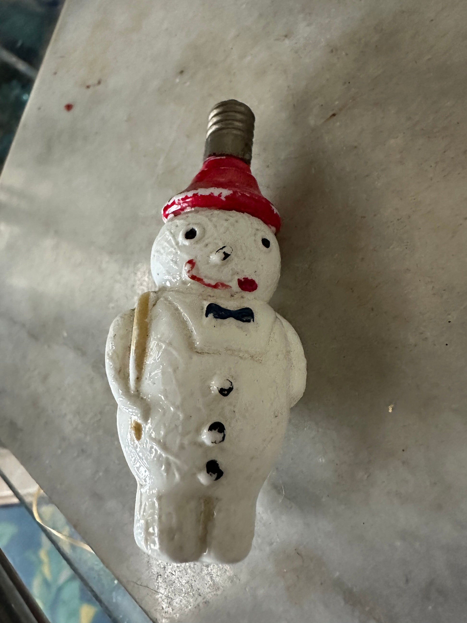 A fantastic set of two vintage / antique milk glass Christmas light bulbs from the 1930s.These milk glass bulbs were discontinued in 1939, just before the War. First is an adorable Snowman Christmas light bulb. It has not been tested. Would look nice in a display. Second is a vintage hand painted milk glass round Christmas Ornament bulb that has been adorned with red and green stripes.Please see photos for size approximations.Condition for both bulbs is is very nice with no chips, cracks, hairlines, repairs or discoloration - there is paint rubbing and wear on both bulbs. Still disomay well.Wonderful addition to any Christmas tree or holiday display!