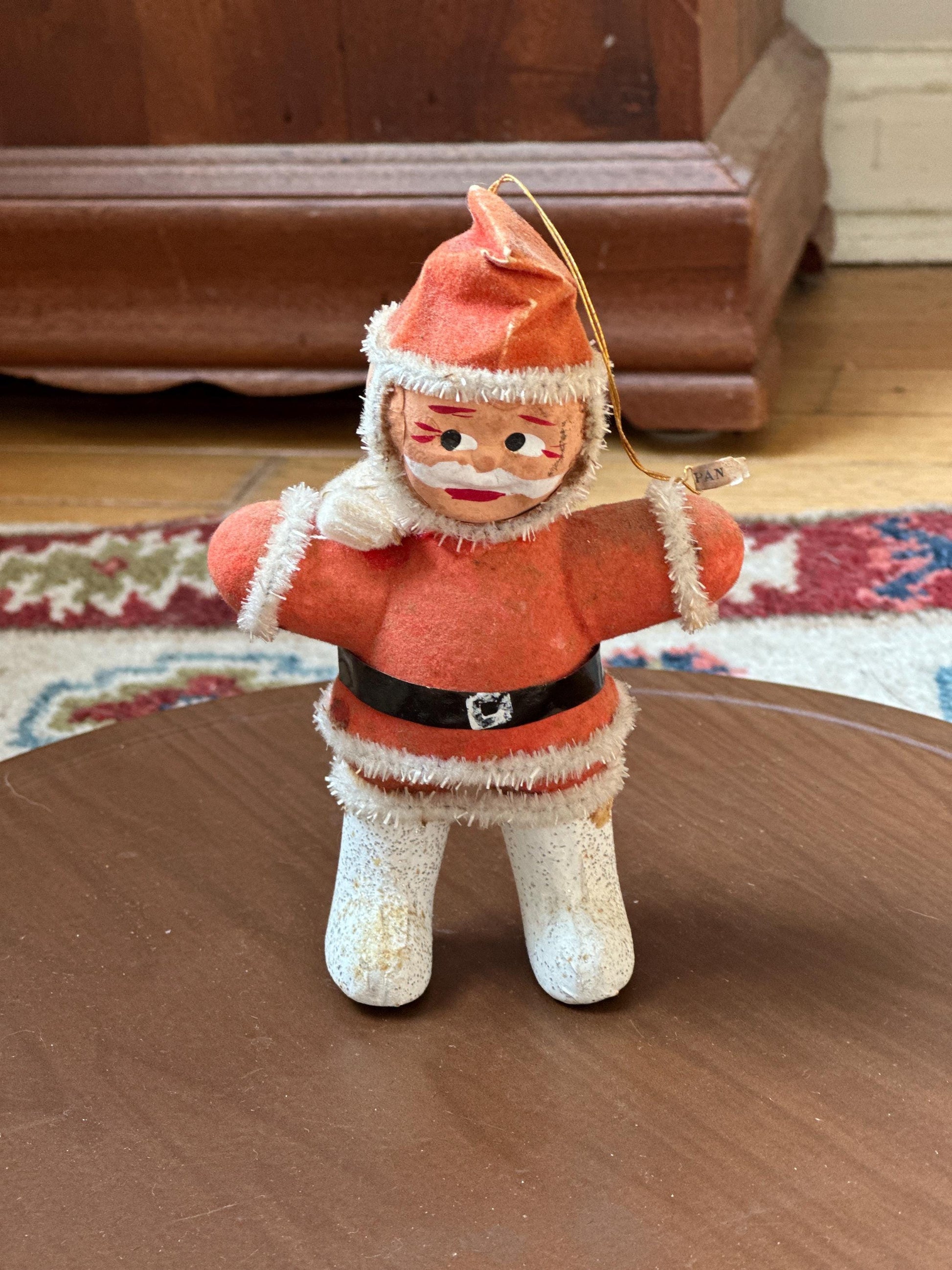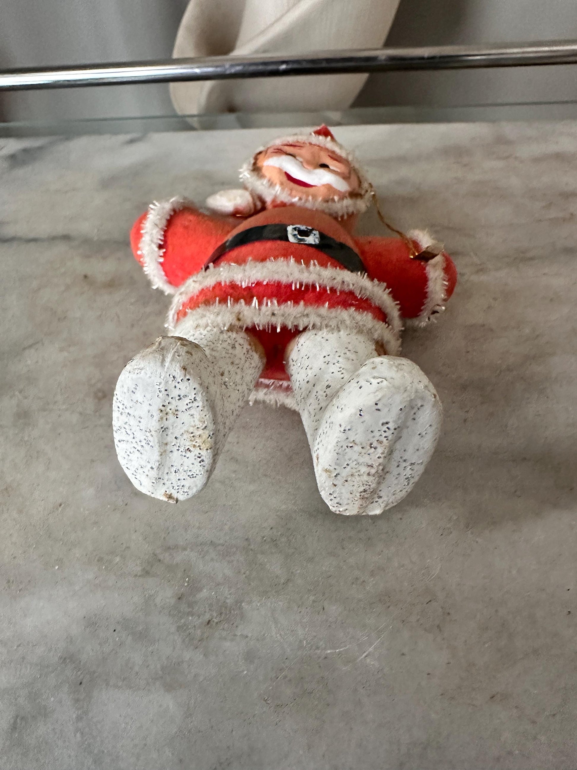 1950s Flocked Santa Ornament | Papier-Mâché Face, Mica Glitter Boots