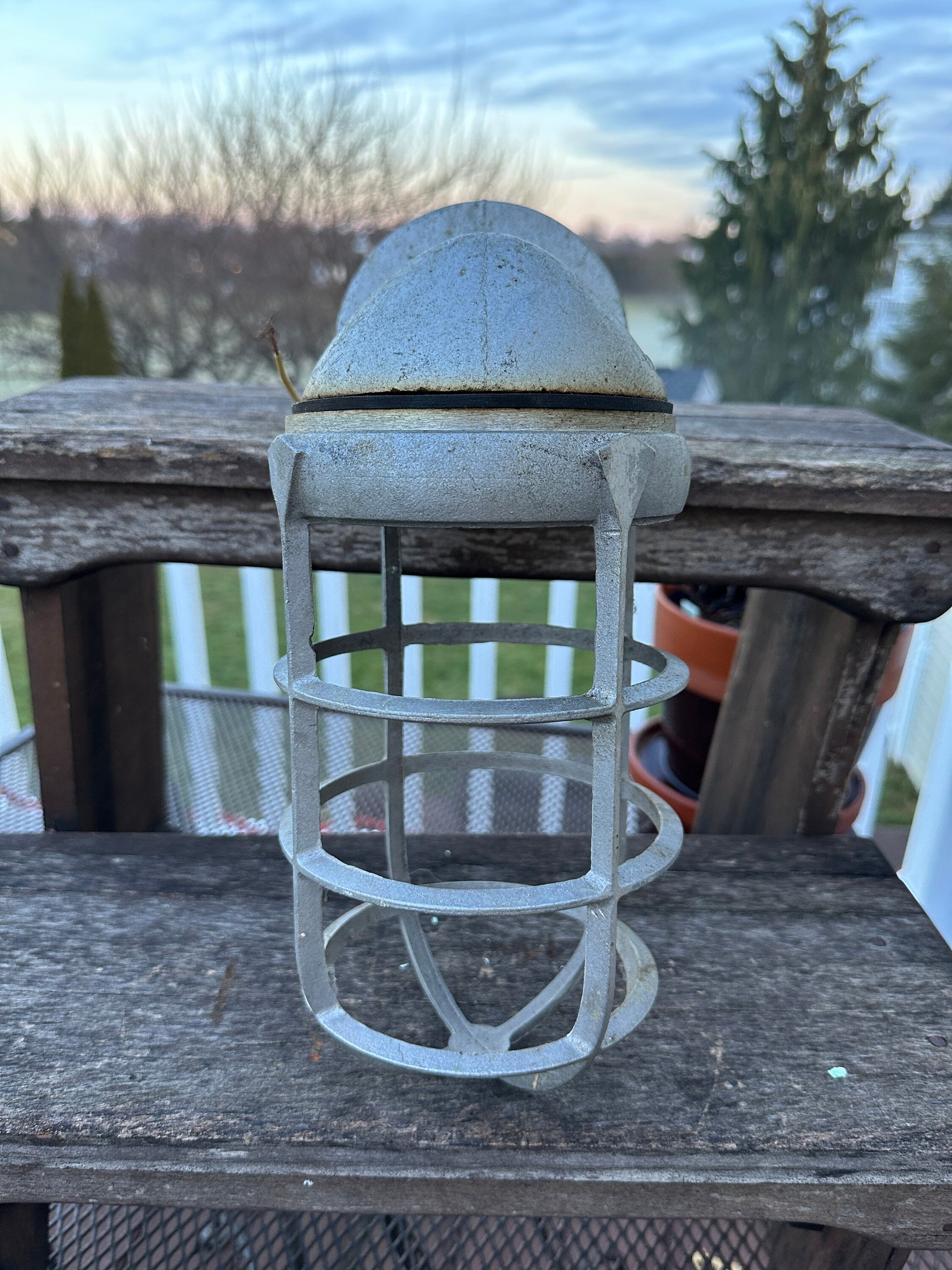 Wall Mount Canopy is 4-5”diameter Cage is approx 5.5” diameter x 9” long and hangs 11” below the center of the Wall MountIn very good vintage condition. A wonderful addition to your industrial decor.