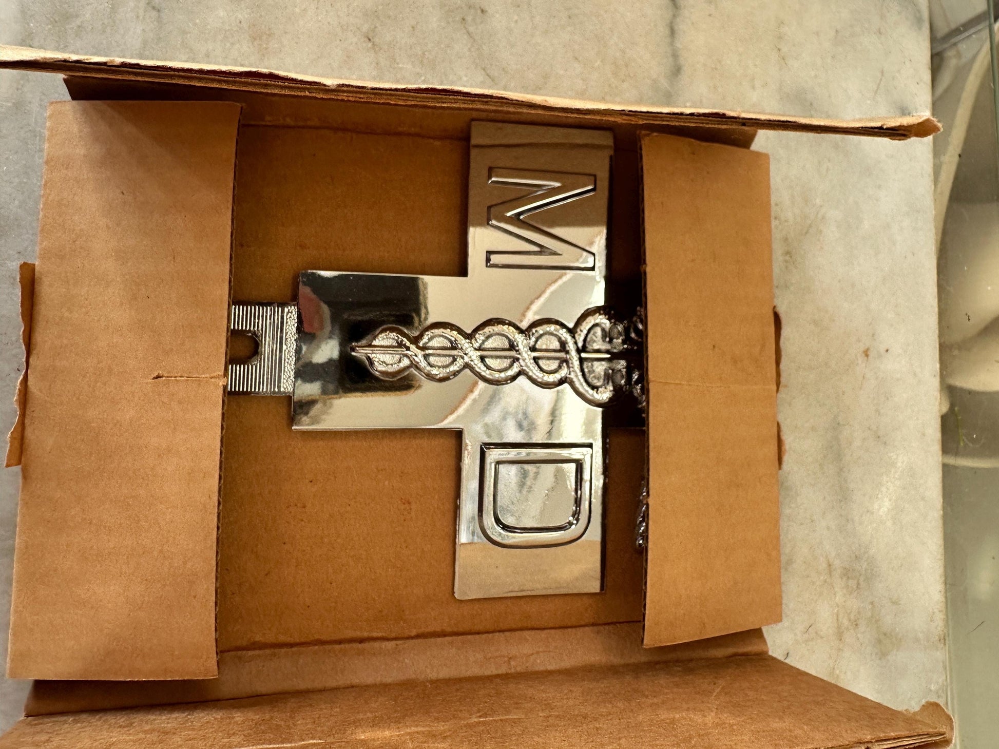 • Marked: MD (Doctor of Medicine) • Era: 1960s • Material: Heavy chrome-plated metal • Condition: New Old Stock (unused) • Includes: Original box • Mounting: Designed for auto license plate displayCondition: Excellent vintage condition. Badge appears unused with bright chrome finish. Original box shows light storage wear consistent with age. Please review photos for exact condition details.Perfect for: • Classic car enthusiasts • 1960s automotive accessory collectors • Medical professional gift • Retro garage décor • Father’s Day or retirement giftA rare and hard-to-find original accessory—especially in unused condition with box.