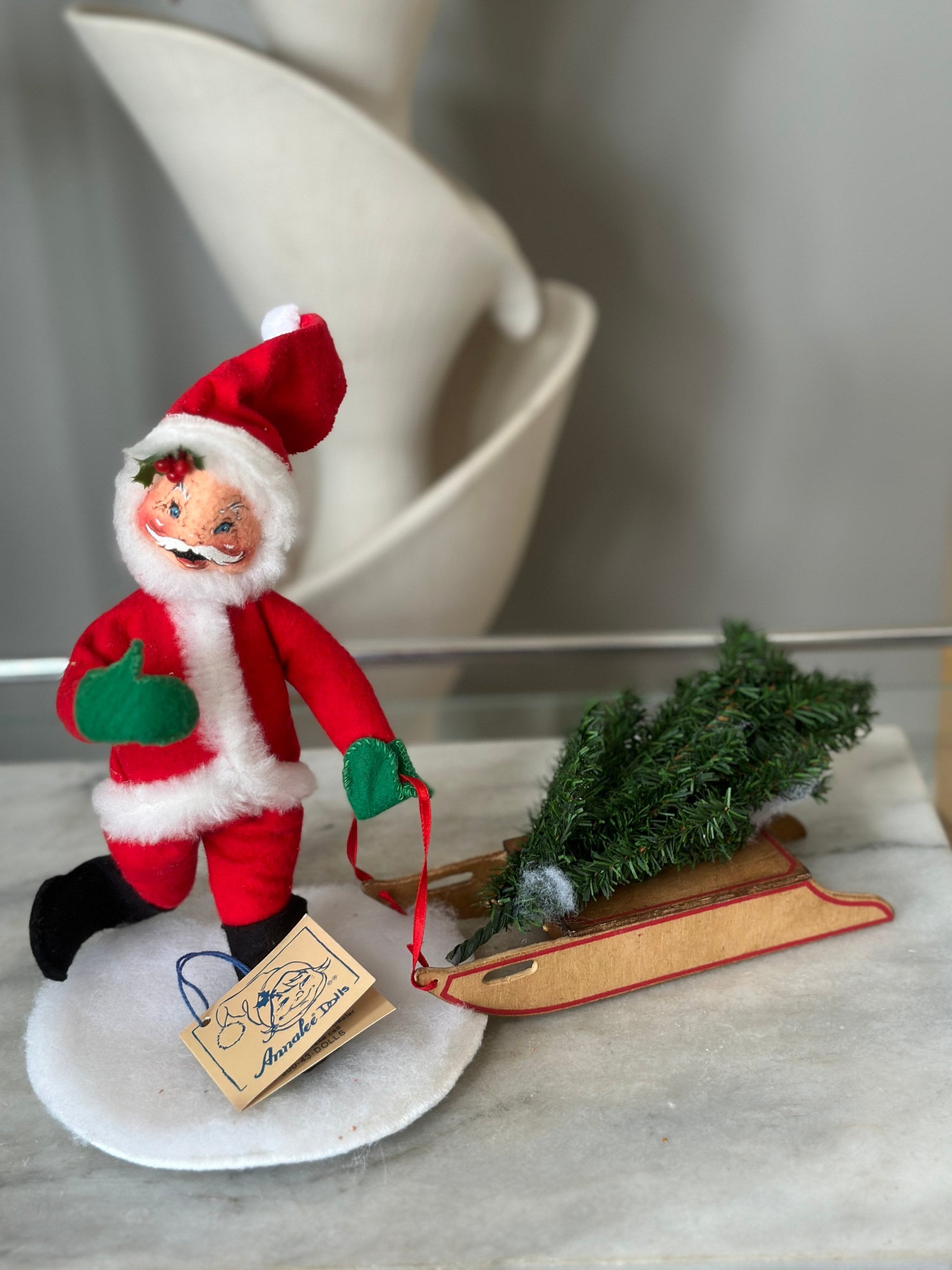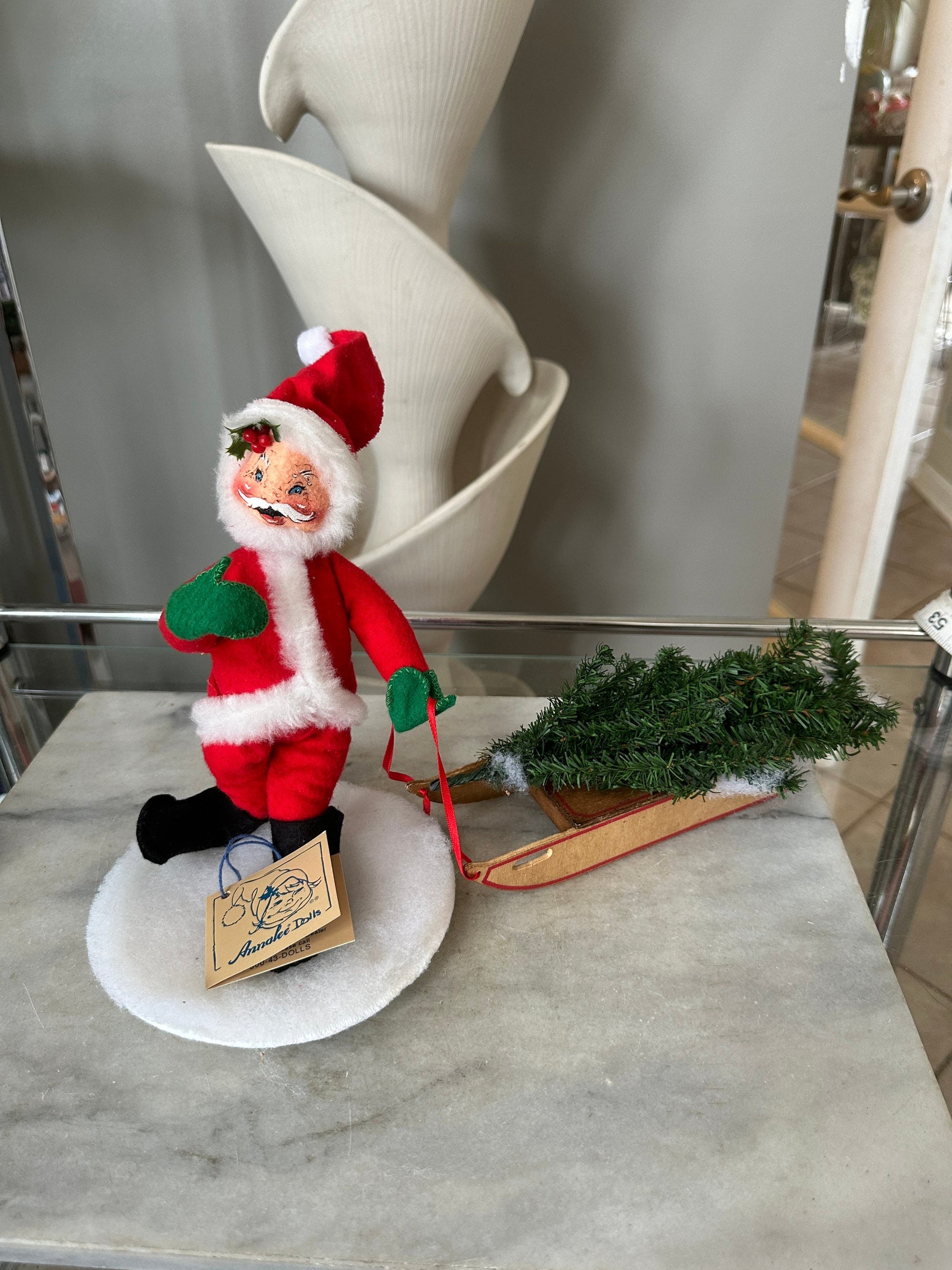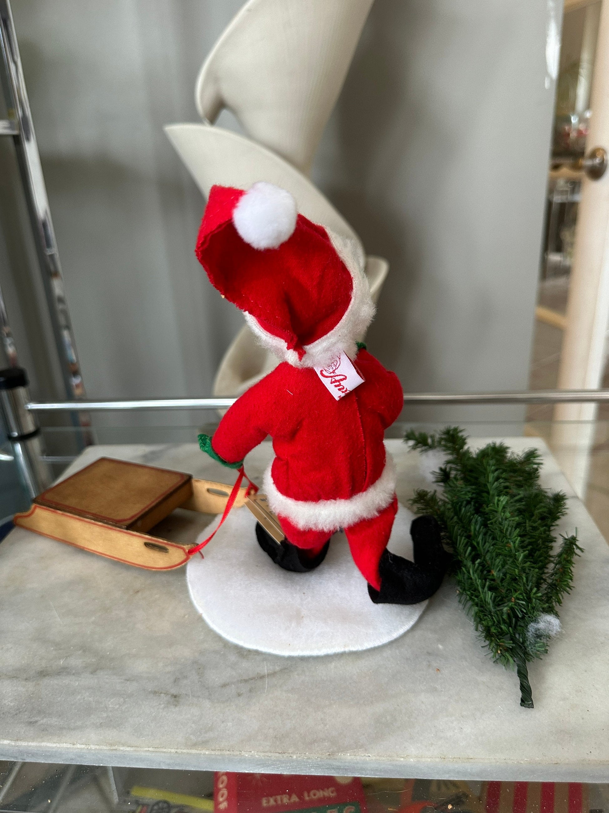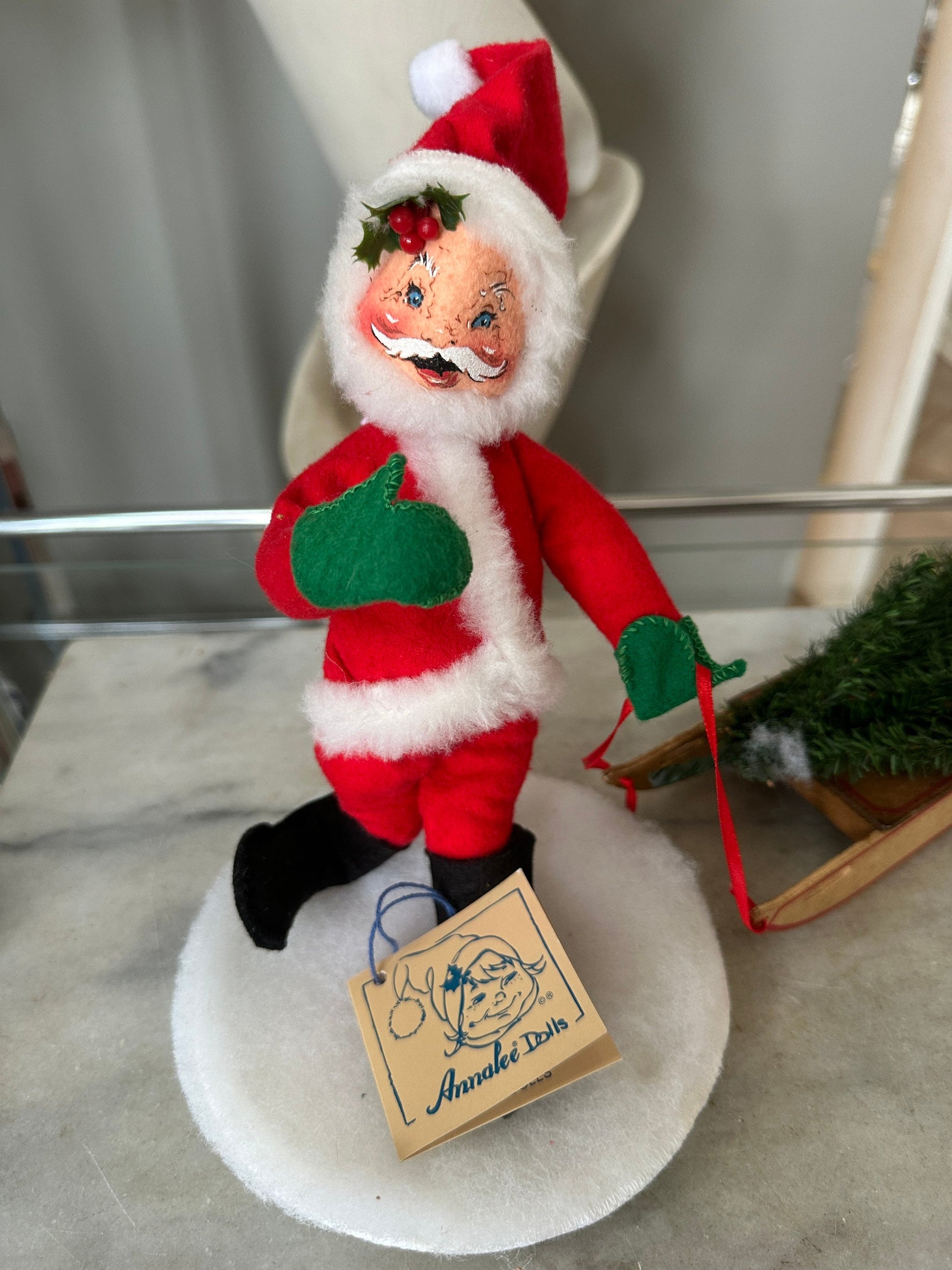 Annalee Doll Description: Red outfit with white fur trim, green gloves, black boots, pulls wooden sled with Christmas tree. Flin very good vintage condition with no rips or stains. Legs and arms have bendable wires for posingA wonderful addition to an Annalee collection. Perfect for you vintage Christmas decor.Annalee dolls where created by Annalee Thorndike when she started making dolls back in the 1930s. The are all made in Meredith, New Hampshire and each doll is full of character and whimsy. Each doll is also pliable and can be shaped into different positions to create your perfect decor look.