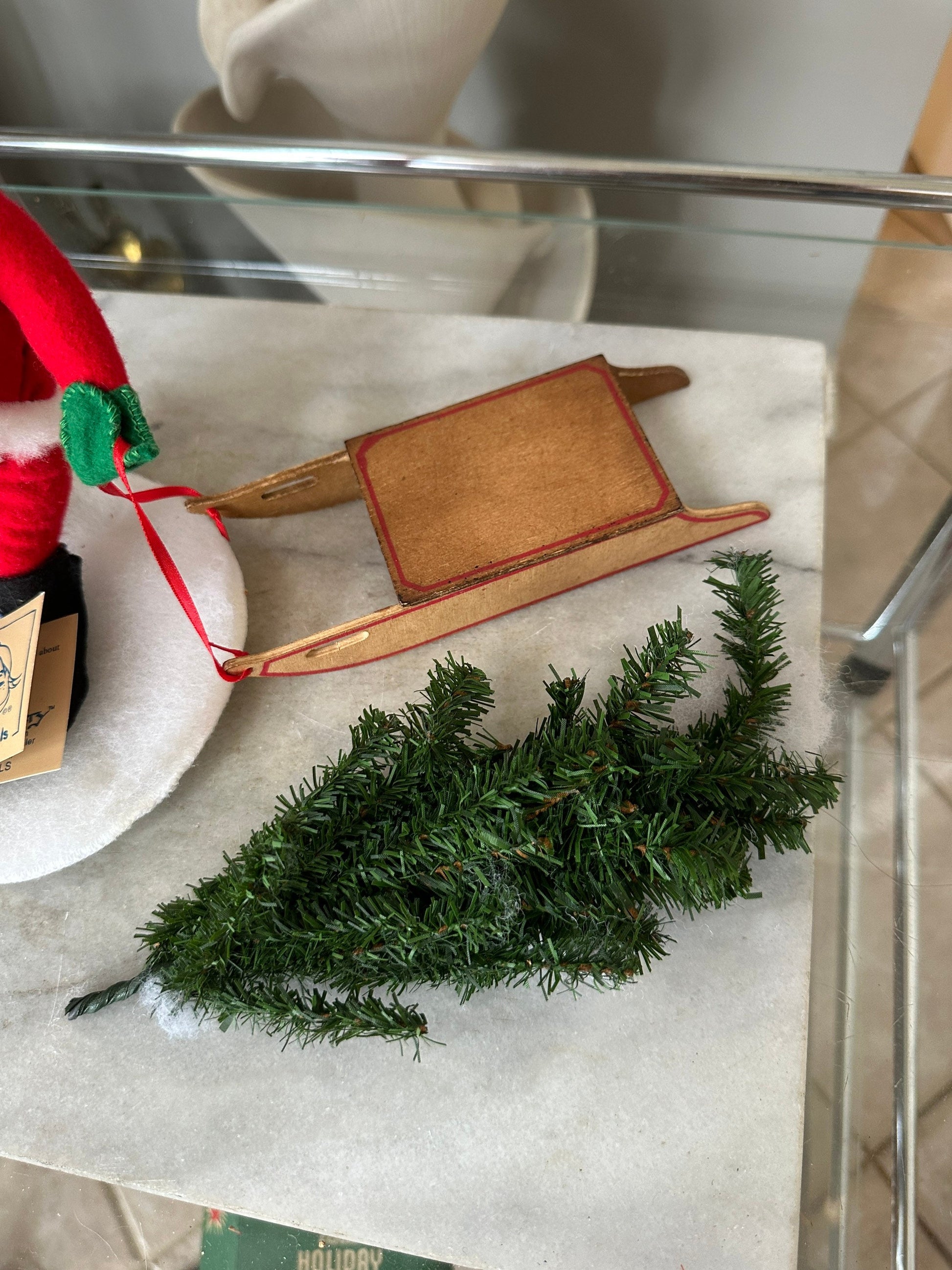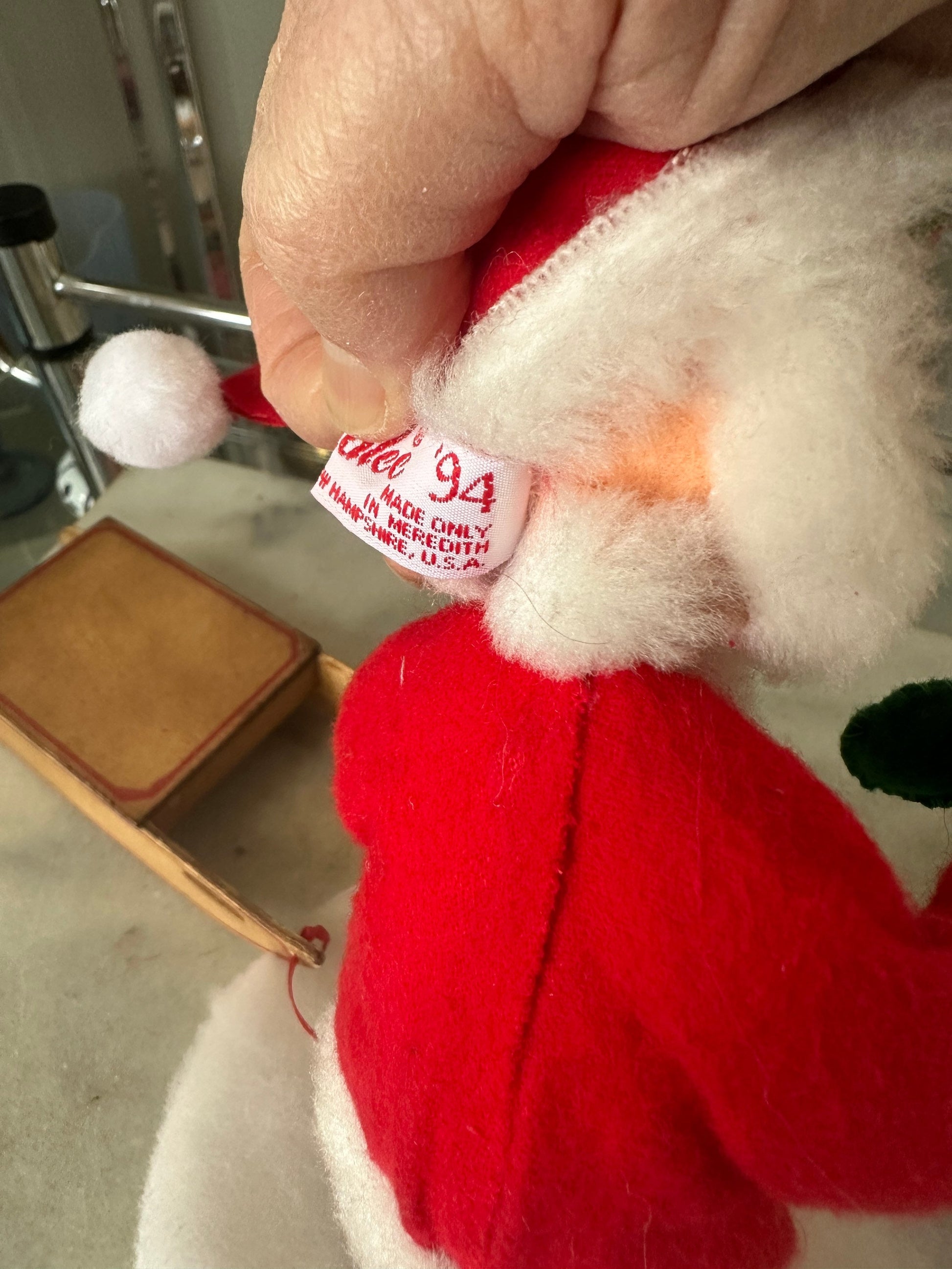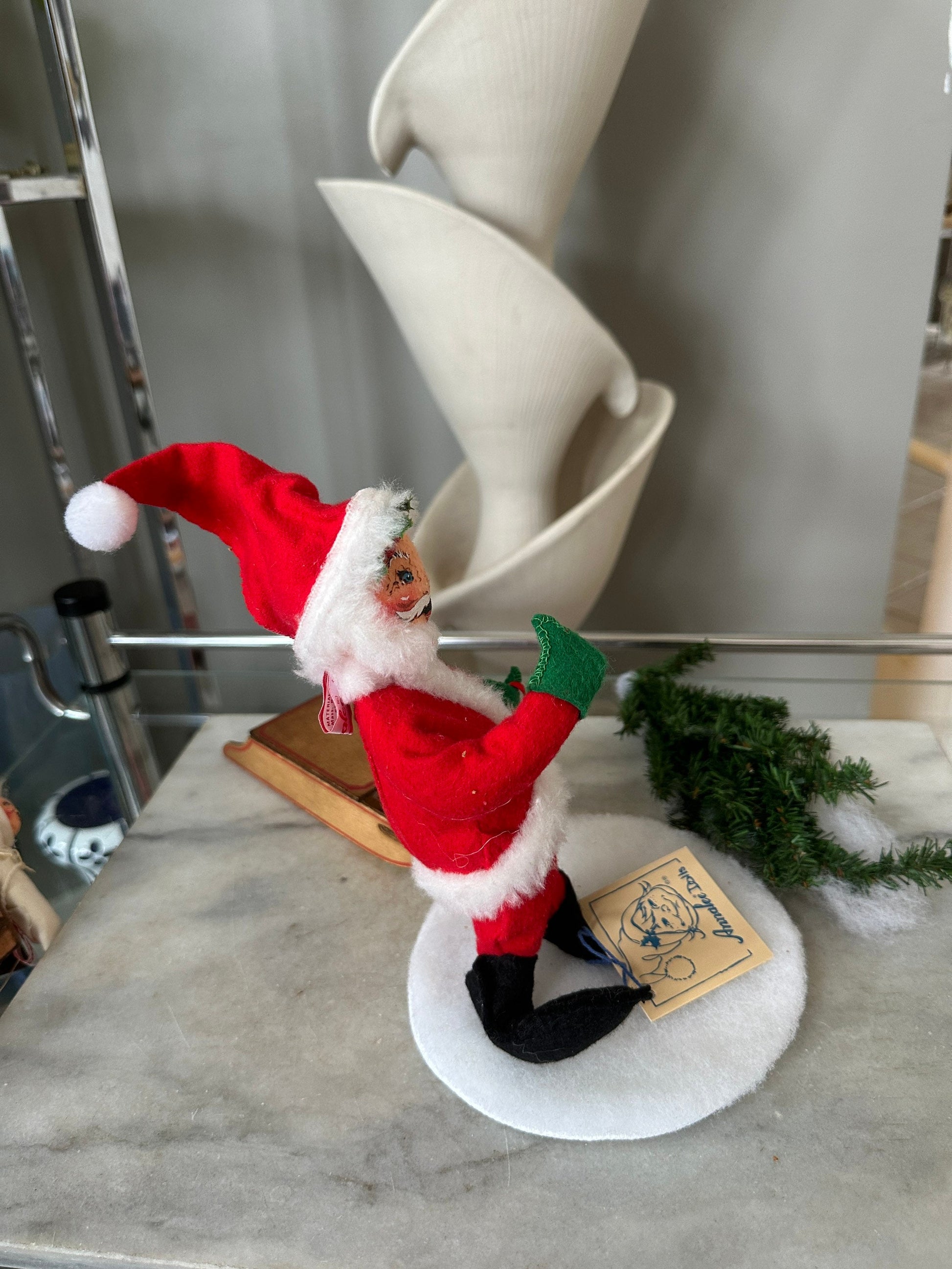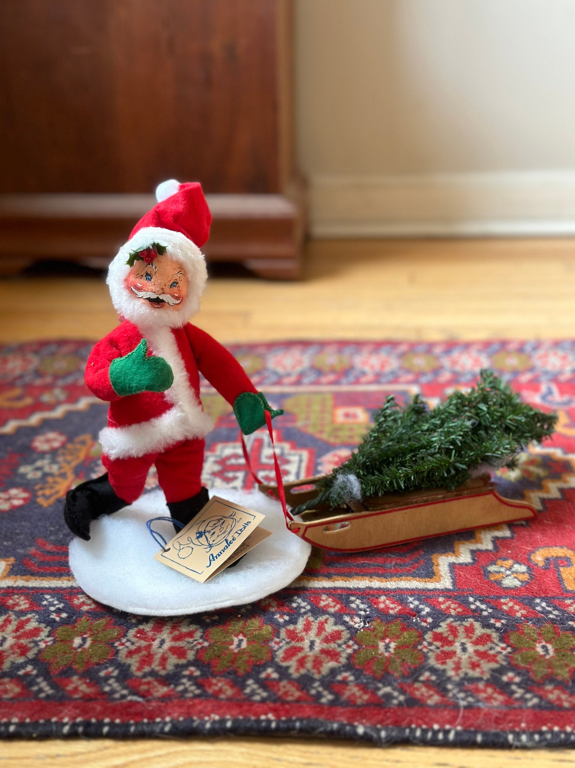 Annalee Doll Description: Red outfit with white fur trim, green gloves, black boots, pulls wooden sled with Christmas tree. Flin very good vintage condition with no rips or stains. Legs and arms have bendable wires for posingA wonderful addition to an Annalee collection. Perfect for you vintage Christmas decor.Annalee dolls where created by Annalee Thorndike when she started making dolls back in the 1930s. The are all made in Meredith, New Hampshire and each doll is full of character and whimsy. Each doll is also pliable and can be shaped into different positions to create your perfect decor look.