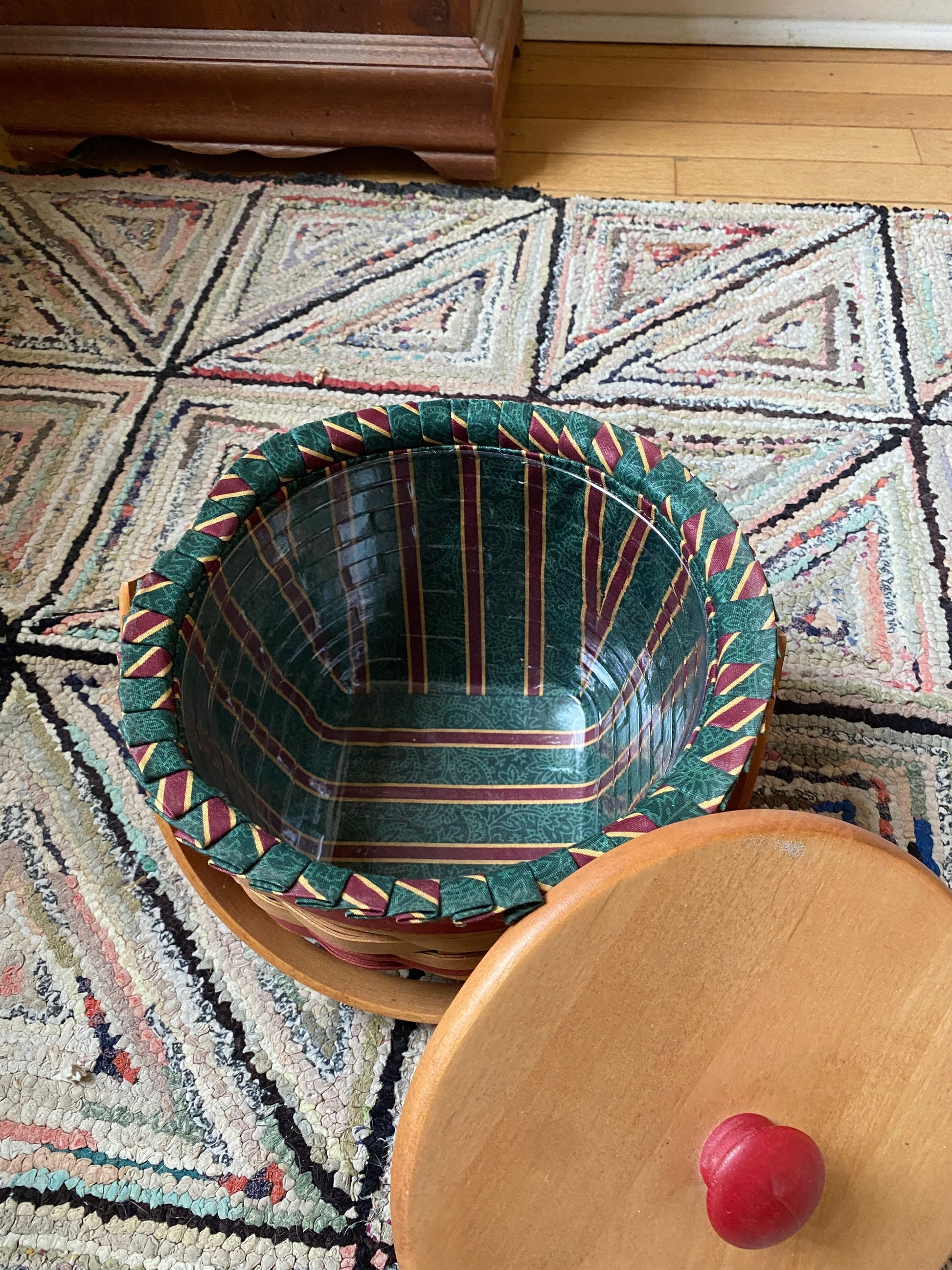 Vintage Longaberger handmade basket with wooden top and handle dated 1994.Attached brass placque reads Longaberger, Christmas Collection, 1994 Edition, Jingle Bell Basket.This basket is in very good vintage condition. No chips or cracks on the basket. Placemats does have some tarnishing and signs or wear.Includes green/cranberry floral decorative liner and plastic protective liner. Measures 6 1/2” H x 8 W . Beautiful example of a classic Longaberger basket. Perfect for the holidays.