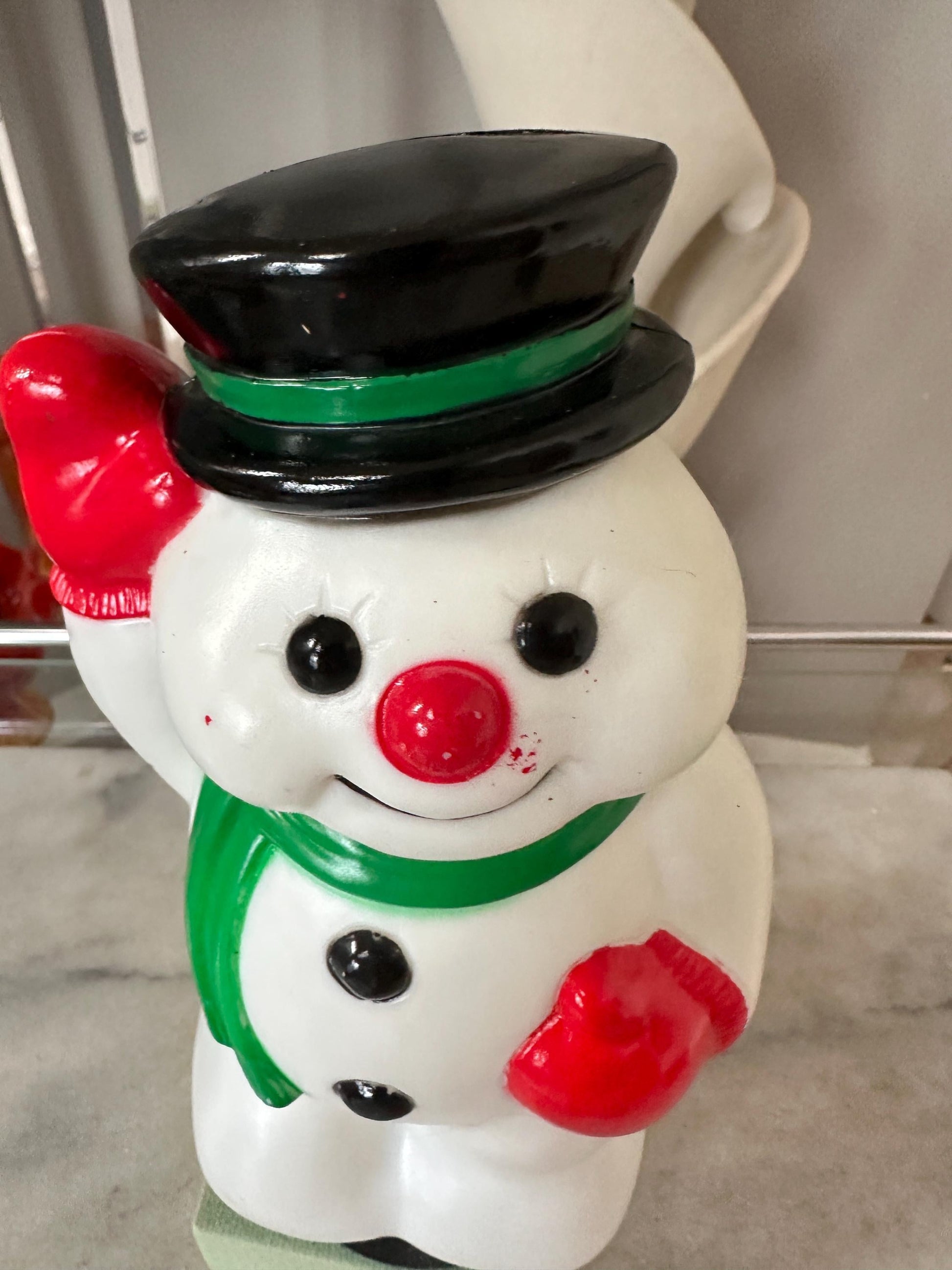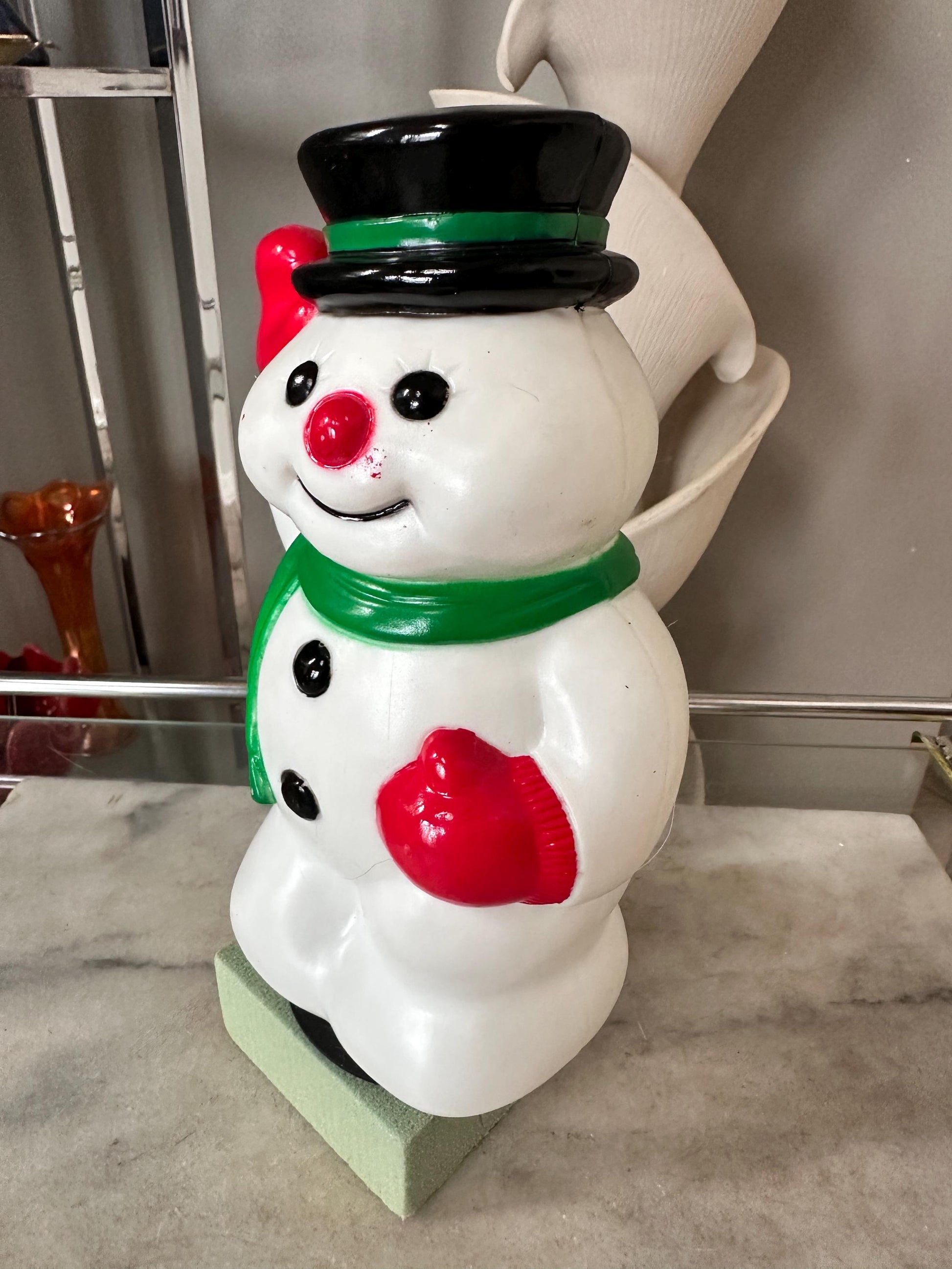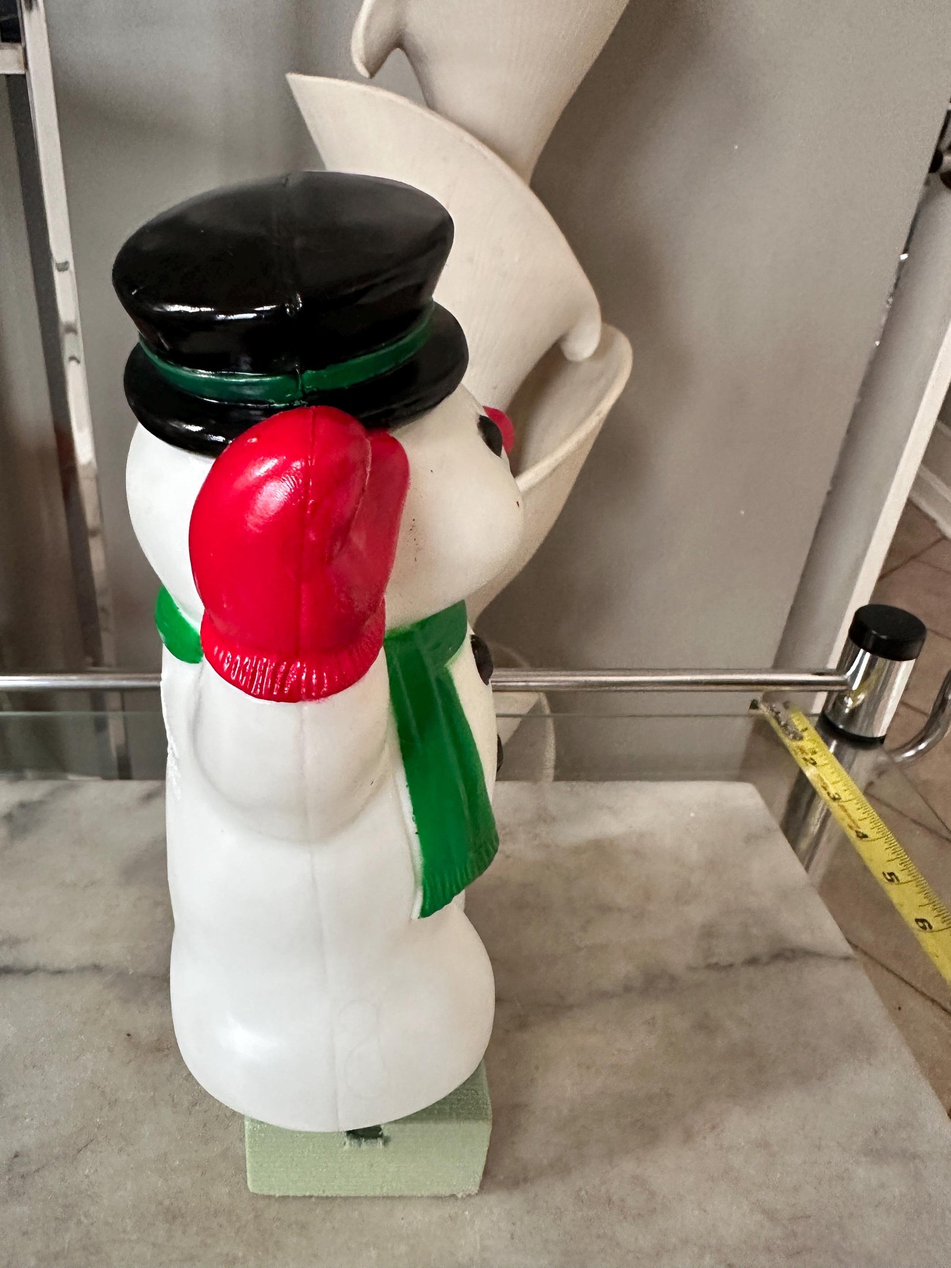 Add a vintage touch to your Christmas decor with this 1990s General Foam Frosty Snowman Blow Mold Pathway Light Topper. The small, multicolored snowman figurine is made of durable plastic and features intricate details. It measures 9 inches in height, 4 inches in width, and 3 inches in length, making it the perfect size for indoor and outdoor use.The blow mold feature adds a unique touch to the seasonal theme, and it was manufactured in China during the 1990s. This collectible item is a must-have for any holiday décor enthusiast and is sure to bring a touch of nostalgia to your home. Light not included, slight scuffing on buttons, hat, left eye, scarf see pics for reference.