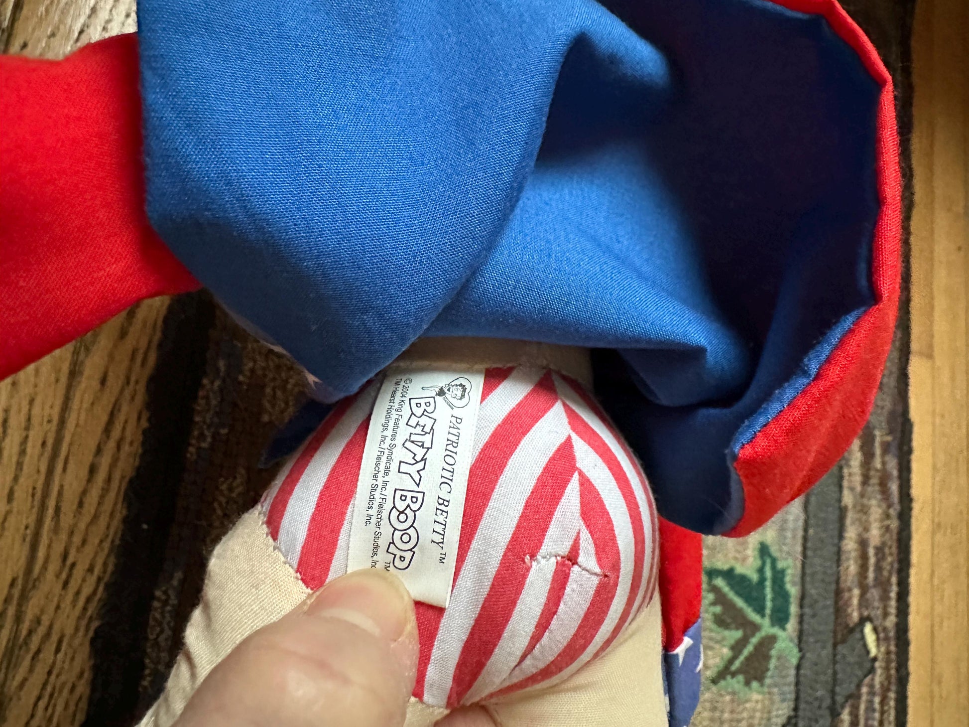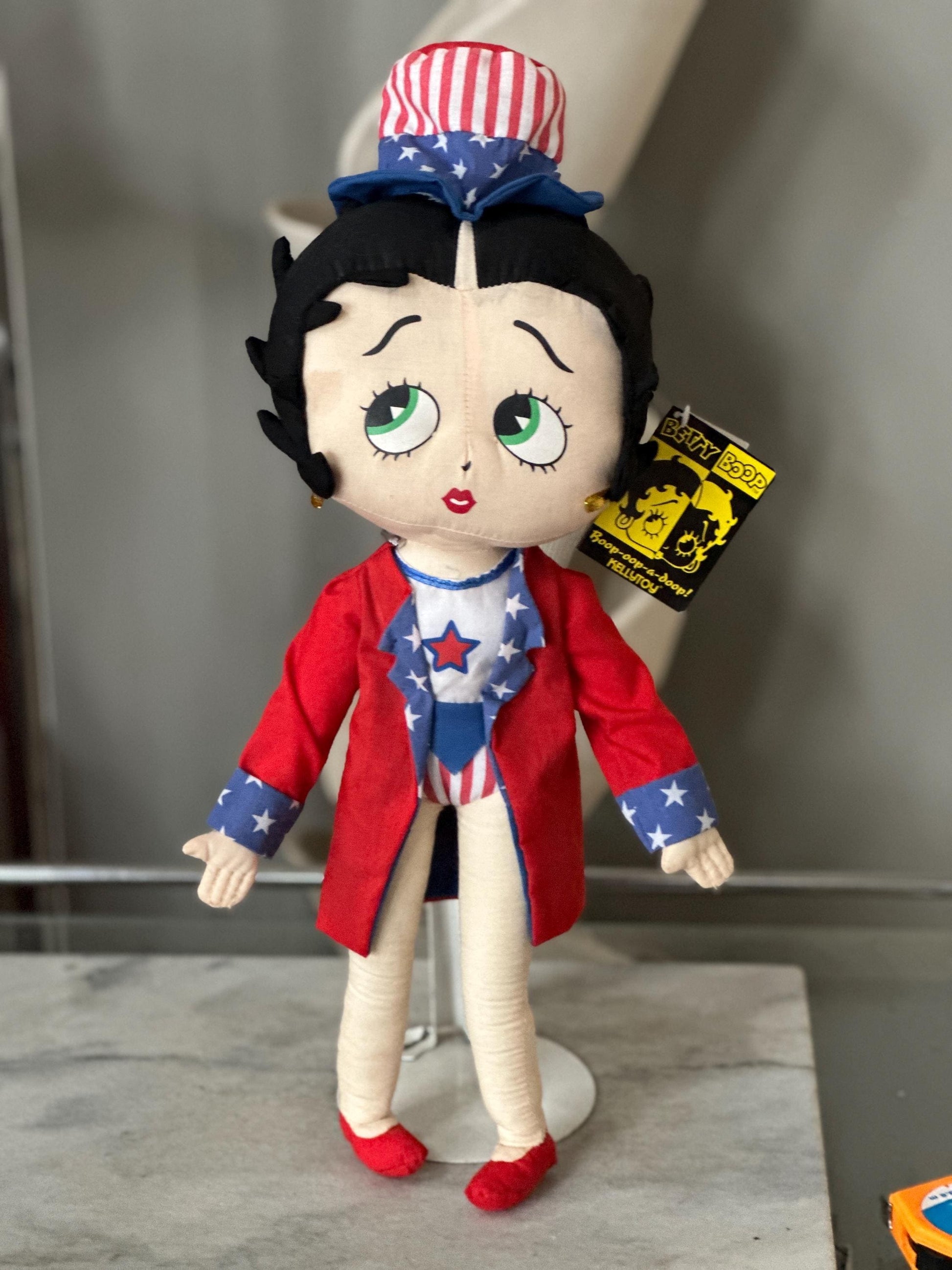 2004 Kellytoy "Patriotic Betty" Betty Boop 20" Stuffed Cotton DollTush tag and cardboard tag are present."Boop-oop-a-doop". This is a vintage 2004 Kelly Toy, Los Angeles "Patriotic Betty" Betty Boop 20" doll by King Features Syndicate. She is stuffed cotton with a printed face and gold ribbon loop earrings. She is wearing a red, white and blue “Uncle Sam” outfit with red heels and a red white and blue top hat. She is in good condition."A caricature of a Jazz Age flapper, Betty Boop was described in a 1934 court case as: "combin[ing] in appearance the childish with the sophisticated—a large round baby face with big eyes and a nose like a button, framed in a somewhat careful coiffure, with a very small body of which perhaps the leading characteristic is the most self-confident little bust imaginable".[7] Although she was toned down in the mid-1930s as a result of the Hays Code to appear more demure, Betty Boop became one of the best-known and popular cartoon characters in the world." (Wikipedia) This popular cartoon flapper will make an interesting addition to your vintage doll collection or lovely gift for a special friend. We invite you to make your own precious memories with this miss Boop-oop-a-doop. Thank you for visiting our store.