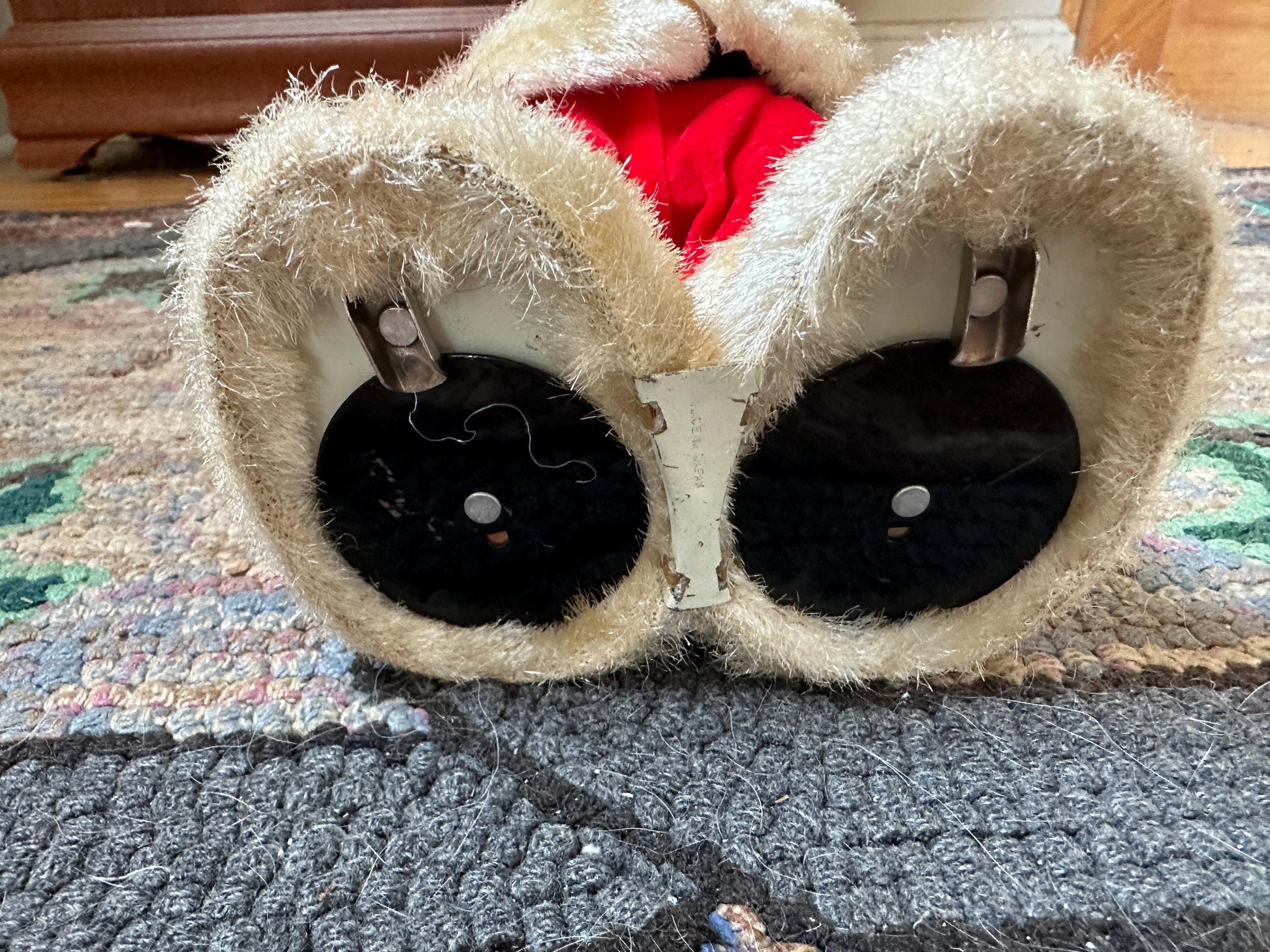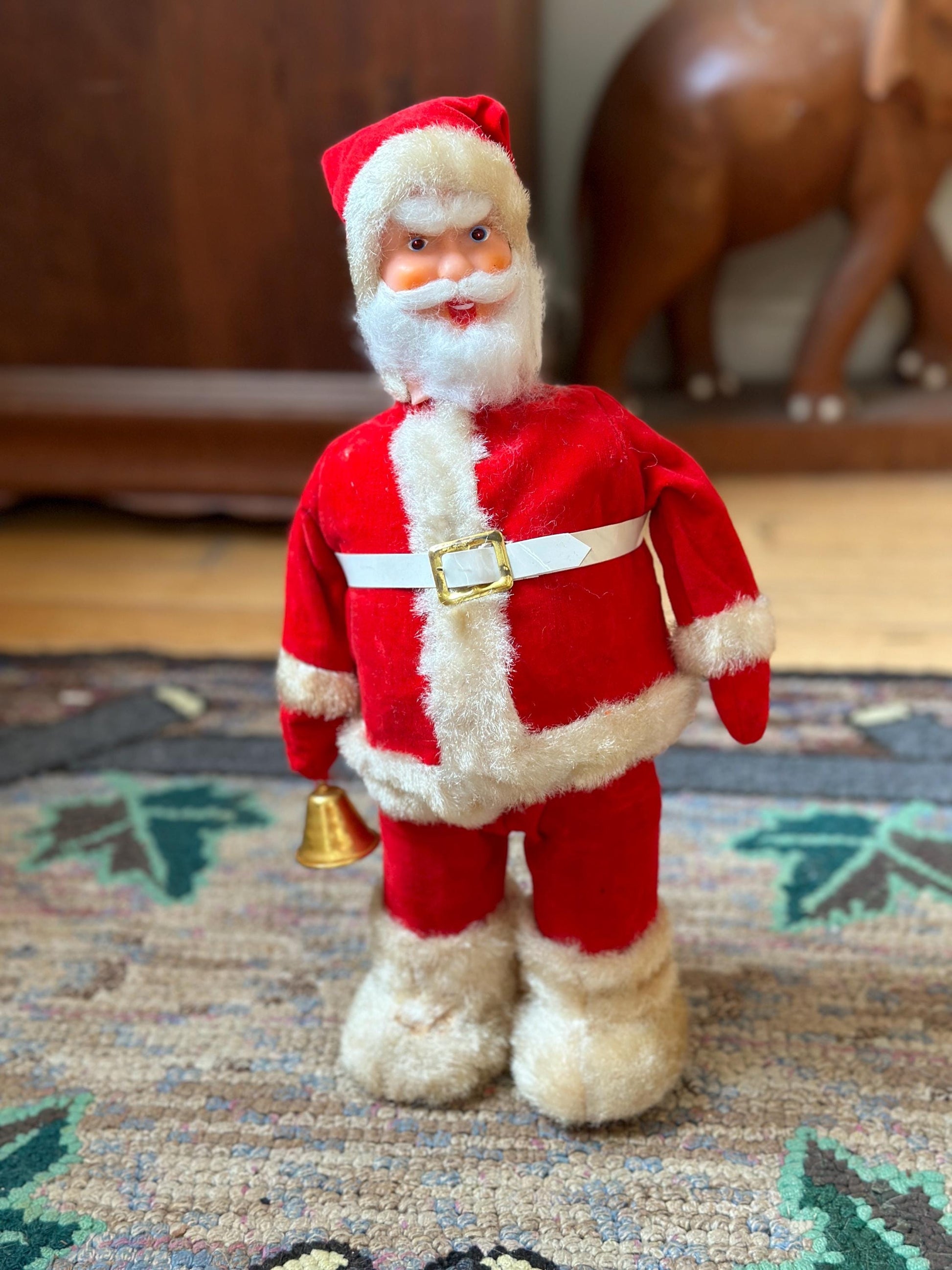 For your consideration is a A Santa Creation Battery Operated 1960's Japan #16404A kitschy desugn featuring a red velvet suit and Gaia fur Tim and boots.Santa is holding a bell and is wearing a white belt.This Santa requires 2 D batteries. It has been tested and the lights in the eyes work, but he does not ring the bell.This item is in good vintage condition with no rips or stains. There are areas of discoloration to the fur trim as well as on the back of the red suit.Does not come with batteries or original box.