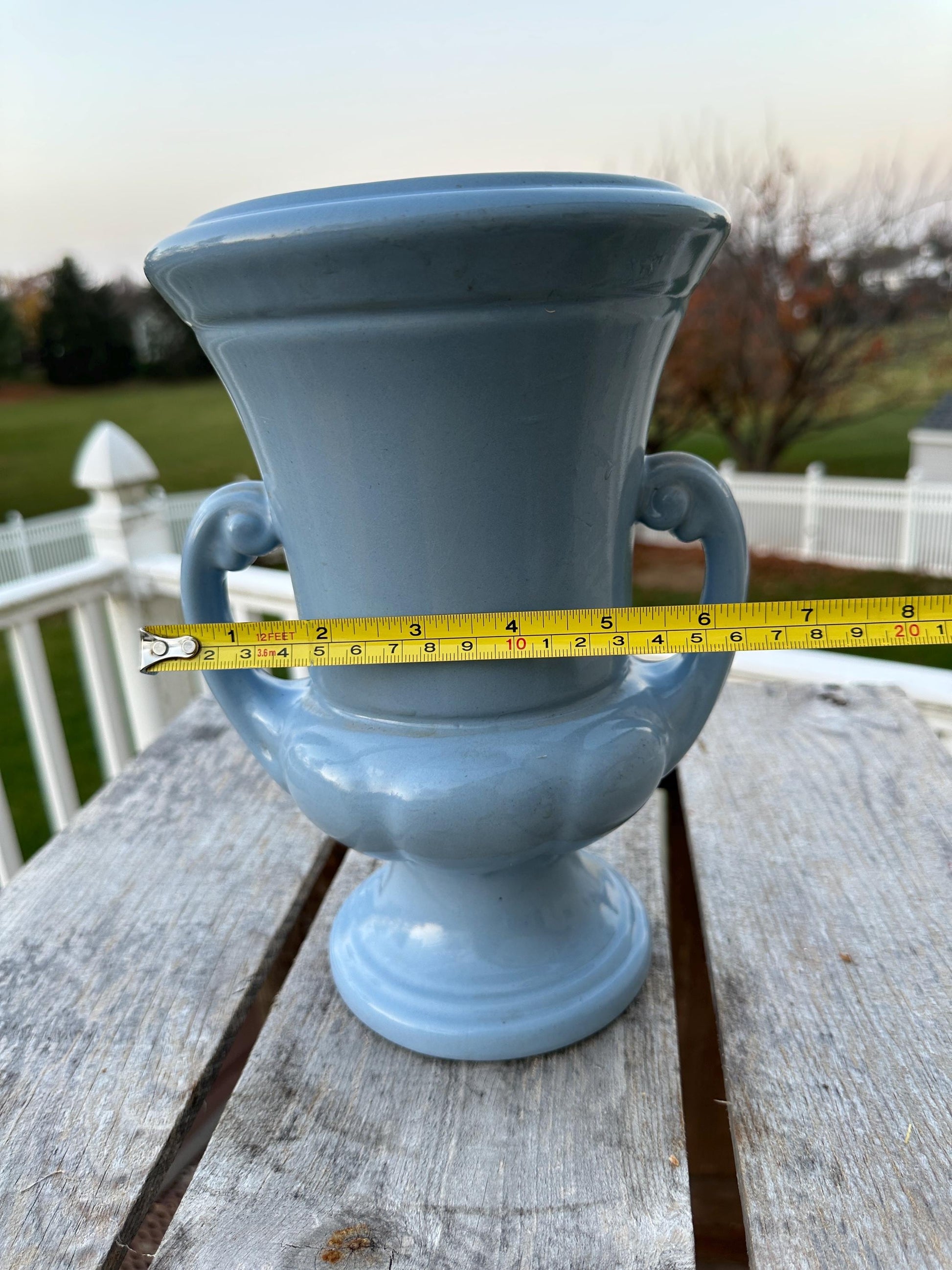 Abingdon Pottery Vase Planter Sky Blue Art Deco #101Classic Abingdon Pottery Trophy Vase in a excellent condition. This superb sky blue art deco vase measures 9 3/4" tall x 7" wide x 6 3/4" deep. It comes with its original label and the base is marked #101.