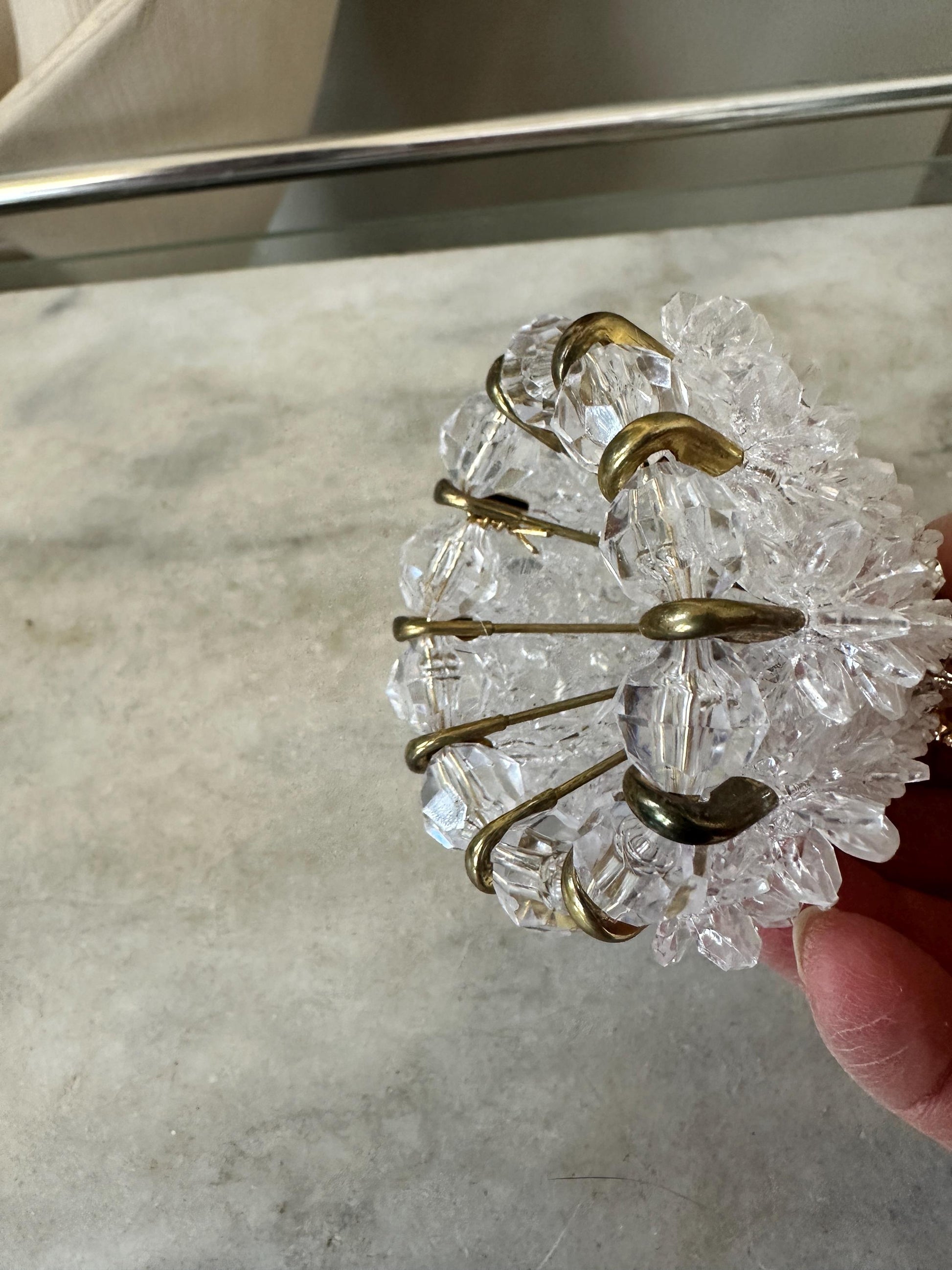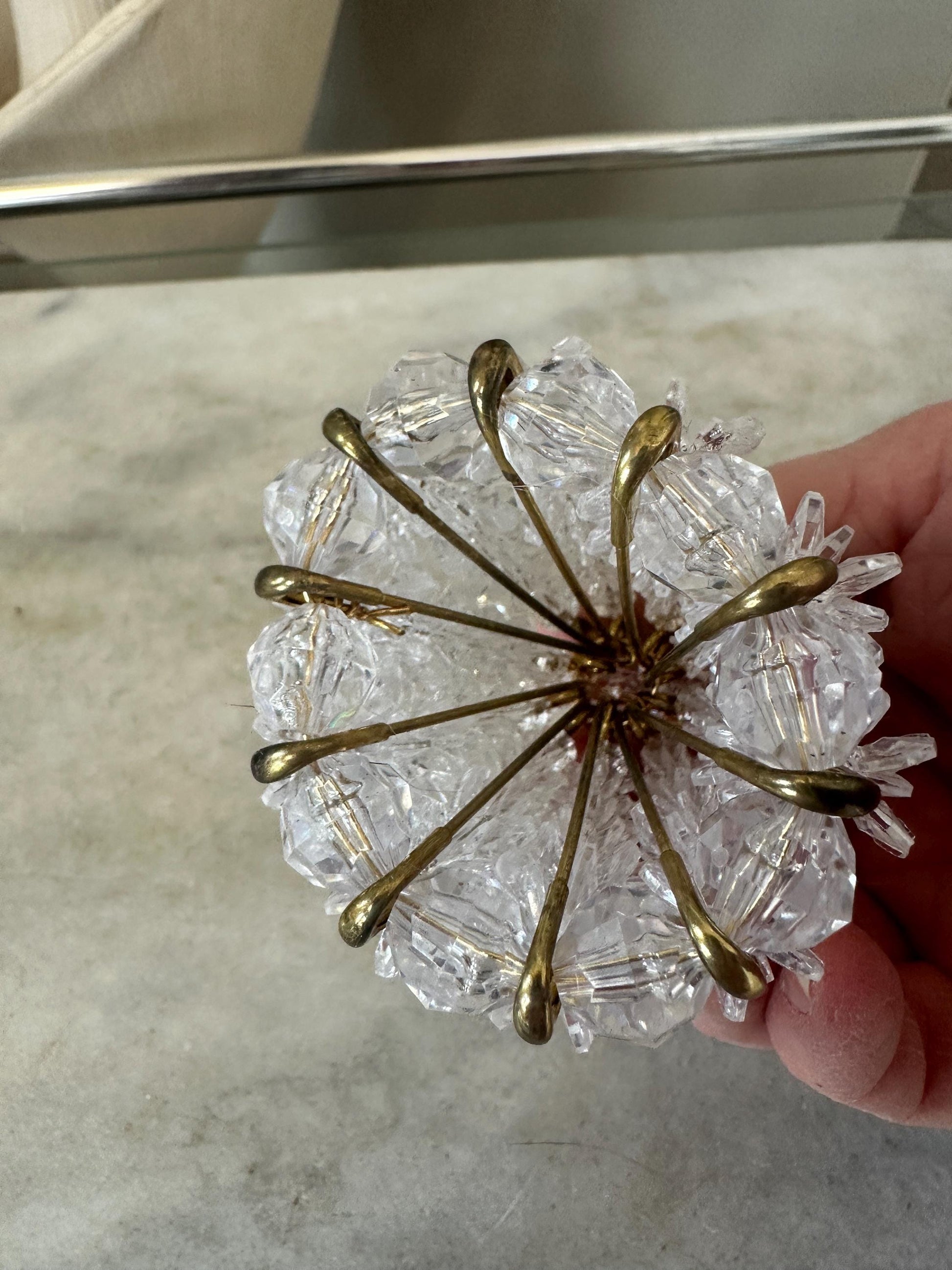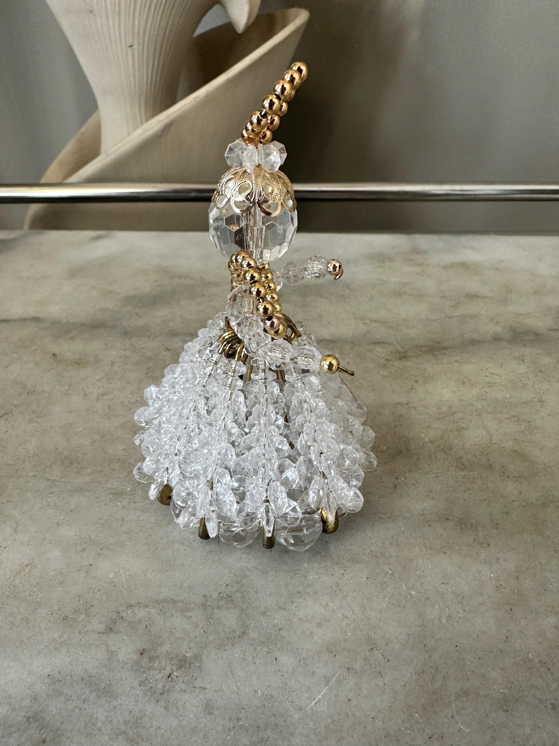 Add a touch of vintage charm to your holiday decor with this beautifully crafted handmade beaded safety pin ornament. The retro style and clear color makes it a perfect addition to any collection of ornaments. This ornament features a delicate angel design, making it a unique and thoughtful gift for any collector or lover of all things vintage. This is perfect for adding a touch of elegance to any outfit.Measures approx 4.5” tall.