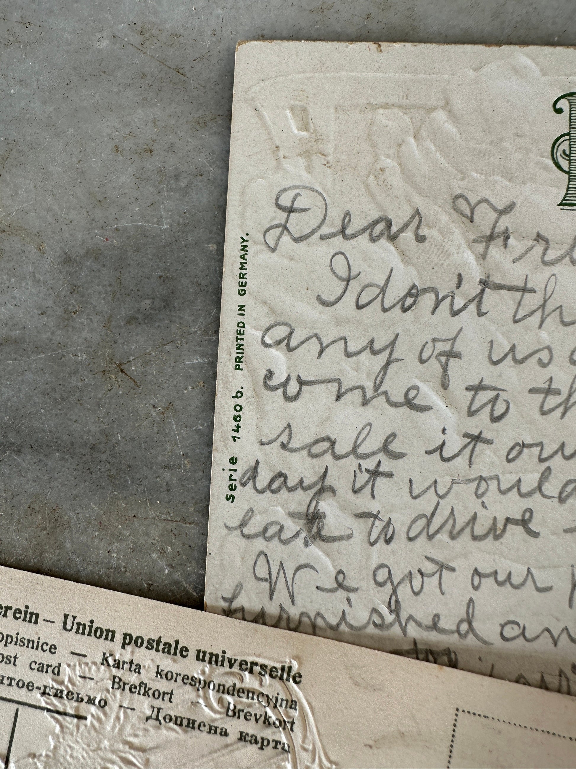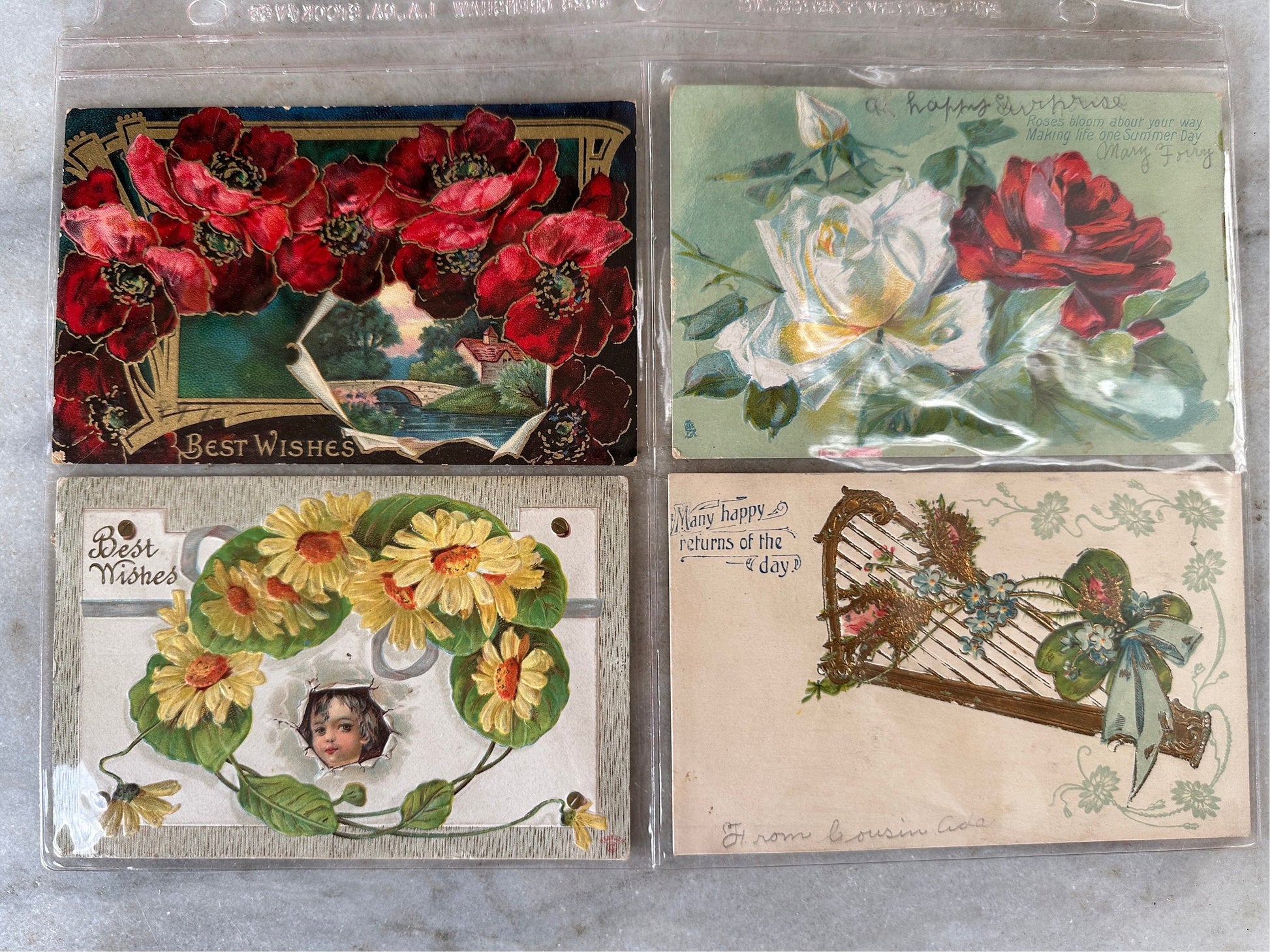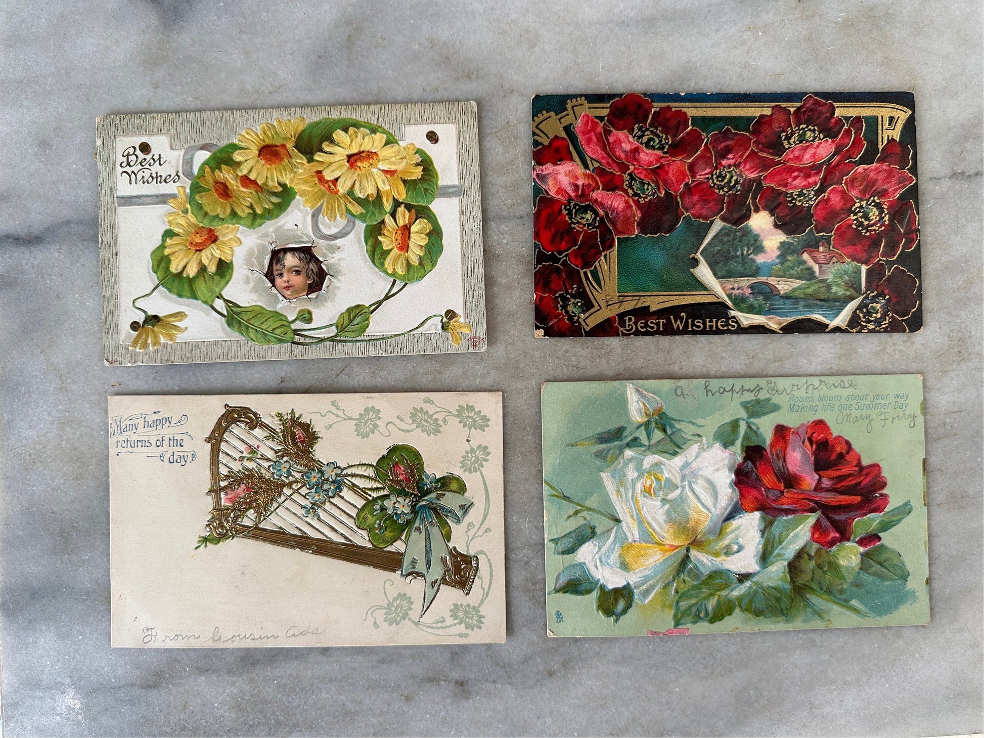 Antique 1910's Birthday / Greeting Embossed Postcards Lot 4 Flowers ~ Edwardian Era Printed in Germany Floral Landscape Post CardsAntique Edwardian postcard collection printed in Germany and sent all over the world to the companies that would publish them for the local market.These original collectible postcards are bright in color with floral designs and embossed with Birthday or General Greetings messages on the front, They are in good used antique condition with no tears or folds. These have been written on but still display very well. It looks as though a pencil was used.Dimensions: 5.5” x 3.5”A wonderful addition to an ephemra collection. Would be great to repurpose into something unique.