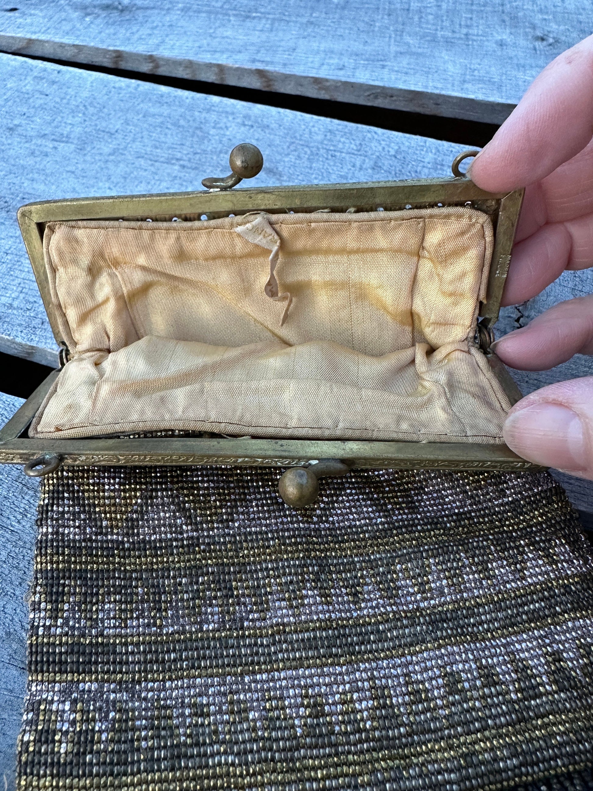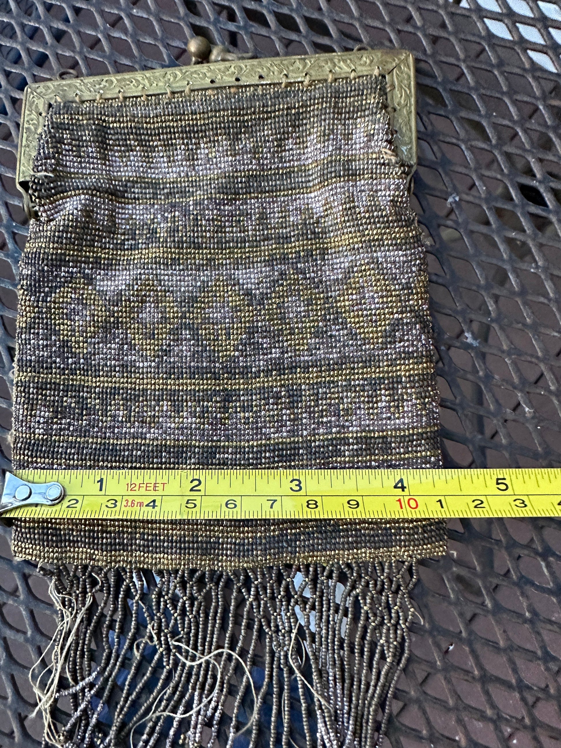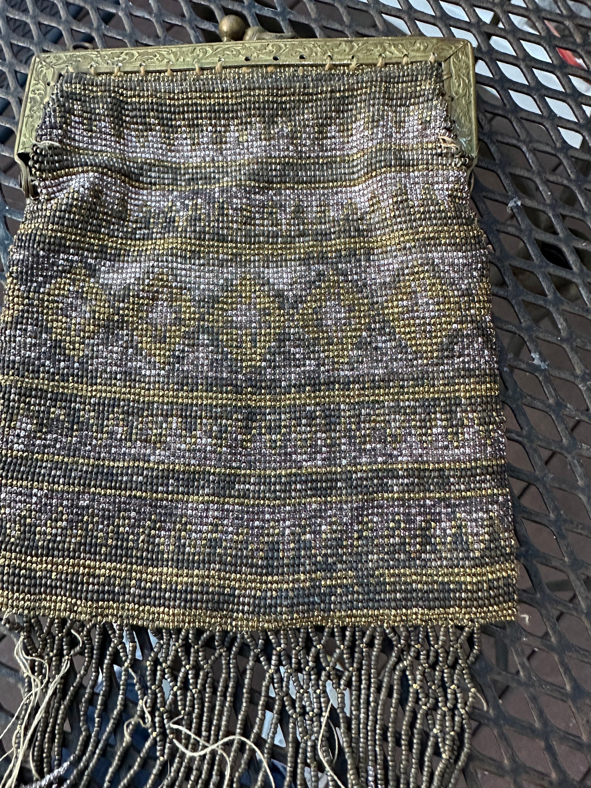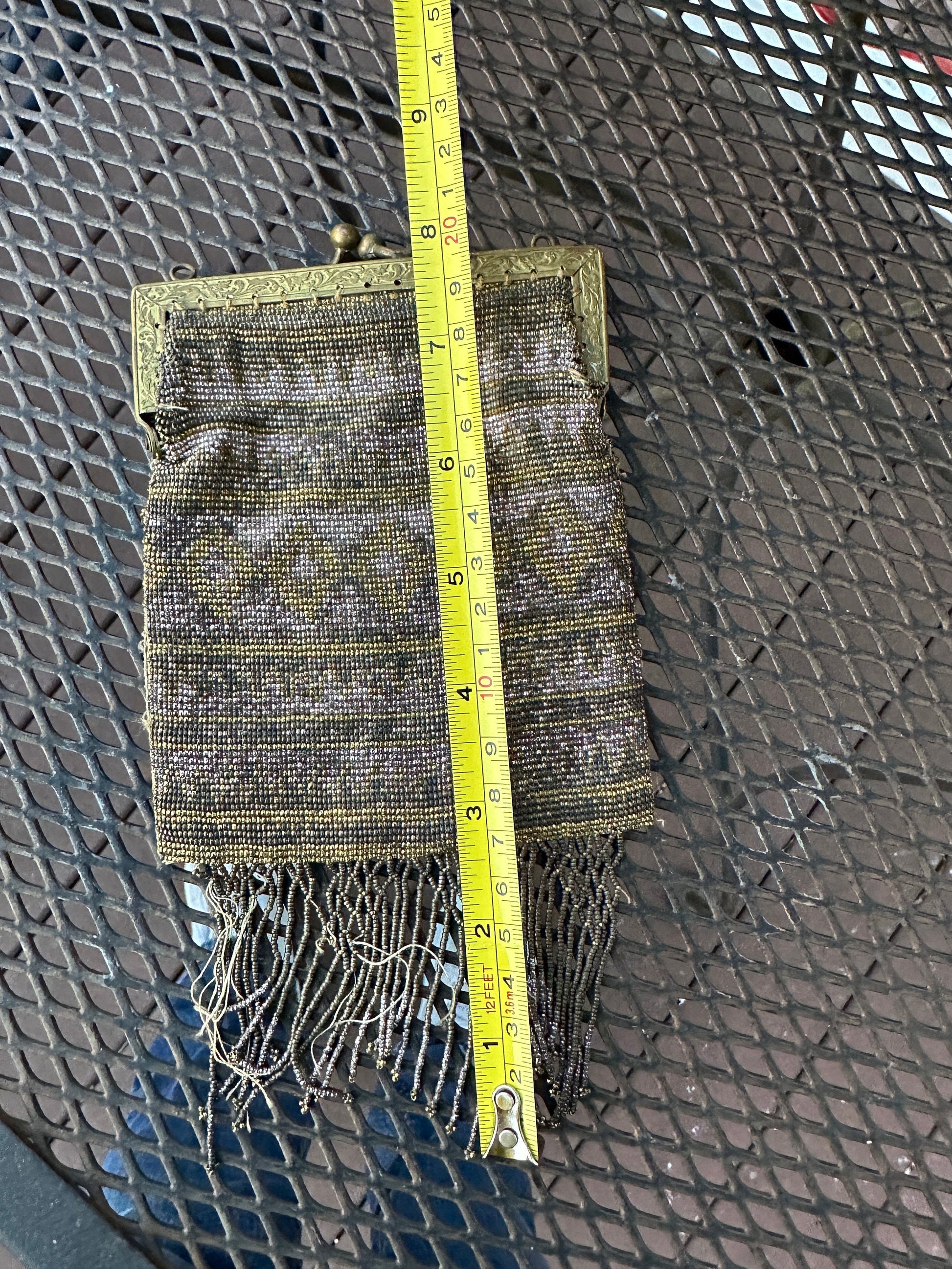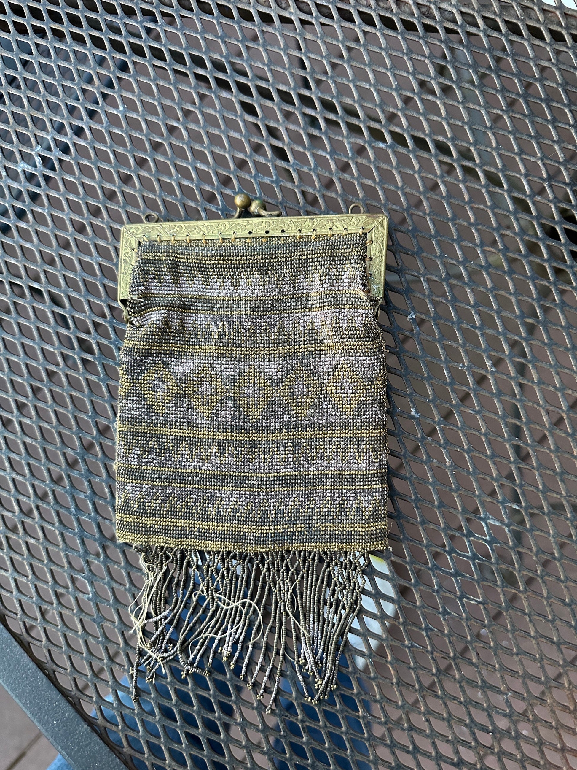 Antique 1920's Art Deco French Steel Cut Micro Beaded Purse Handbag Art DecoMade in France - original tag is present.Features gold and silver micro beads in a cool art deco geometric design.Bottom contains rows of beaded fringe. . NOTE: some beads are missing and loose.Chain handle is not present.Brass frame has a lovely ornate design.Please see photos for size approximations.A wonderful handbag to restore and display. Perfect to add to your vintage handbag collection.
