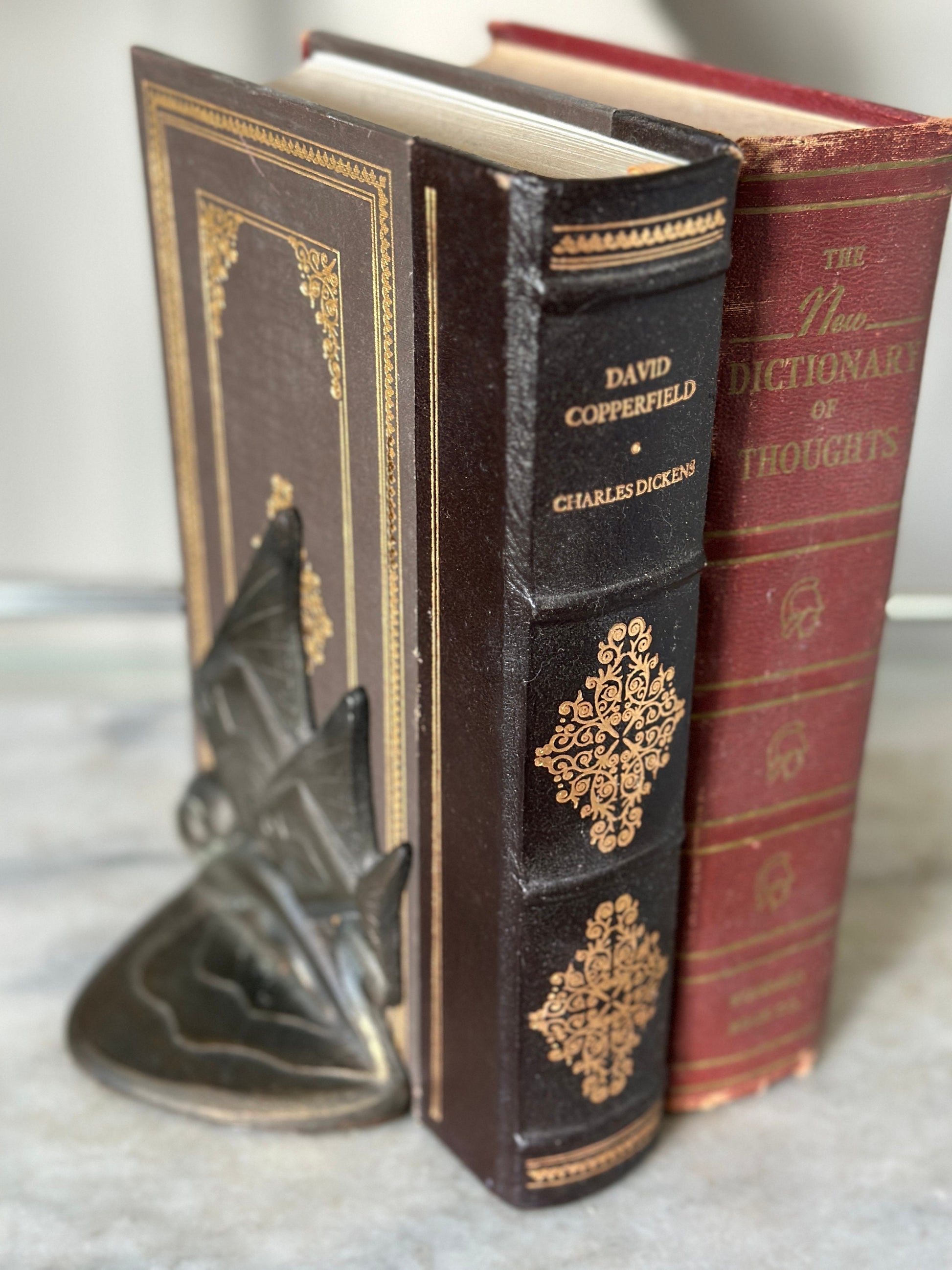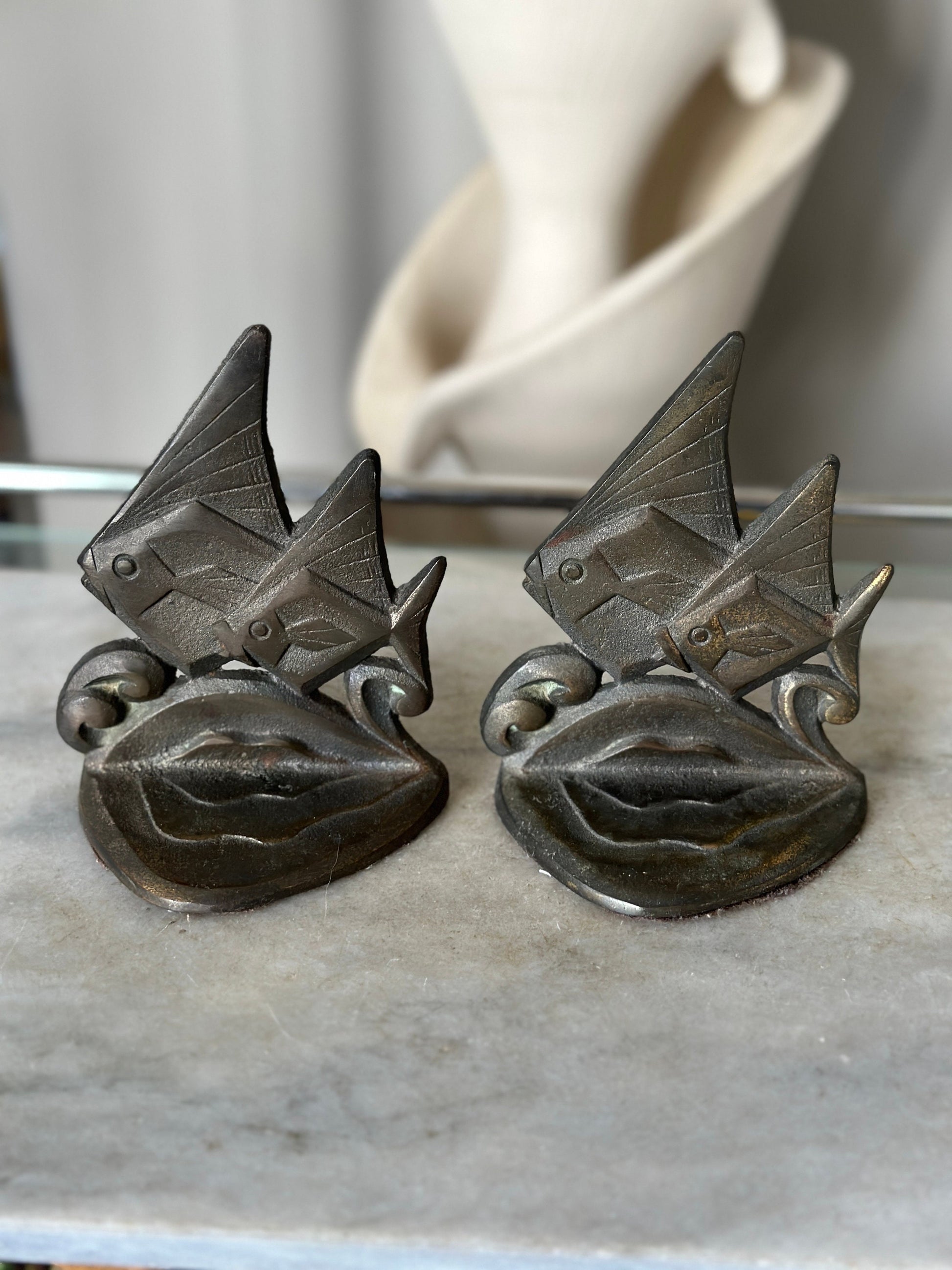 For your consideration, a set of Art Deco bookends. Double angelfish design in cast iron with brushed matte brass finish.Measuriing 5.75" t x 4.5 " wIn very good vintage condition.Proective felt on underside of the base.Thanks for stopping in, please be sure to check out my other unique collectible offerings.