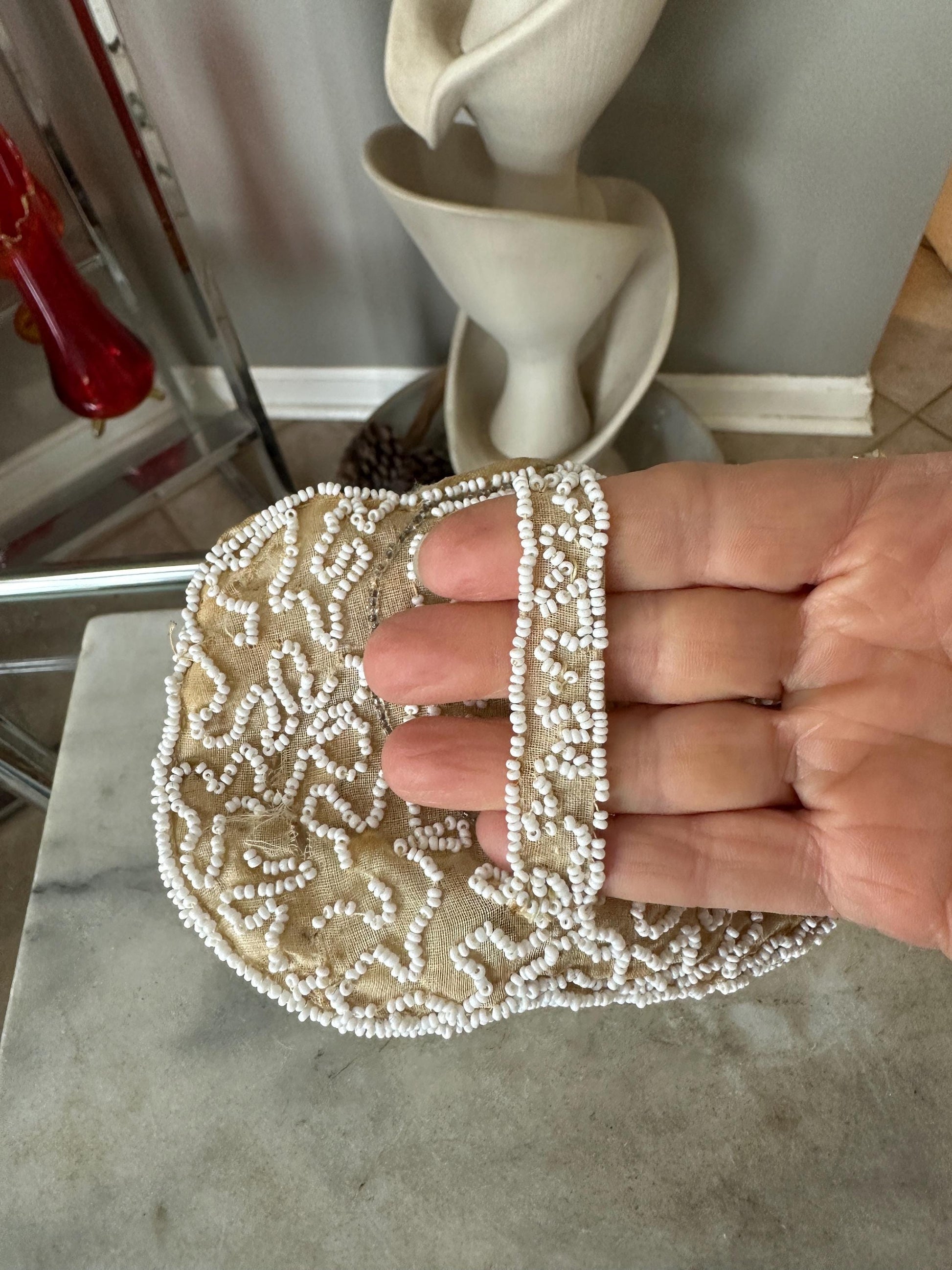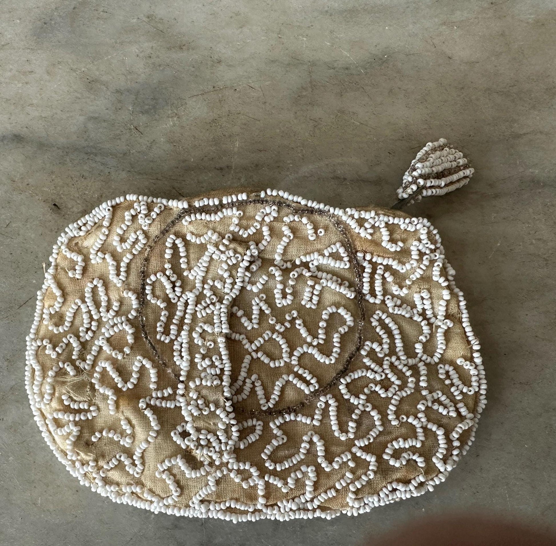 A gorgeous antique flapper style beaded belt clutch bag from the 1920s.Features a beautiful tan and white bead pattern on the front and a belt loop on the back. There is a metal zipper closure with a beaded tab. Measures approx. 6" wide x 4" high. In good antique used condition. One small area of missing beads on the back (see last photo.) A wonderful addition to a beaded purse collection.