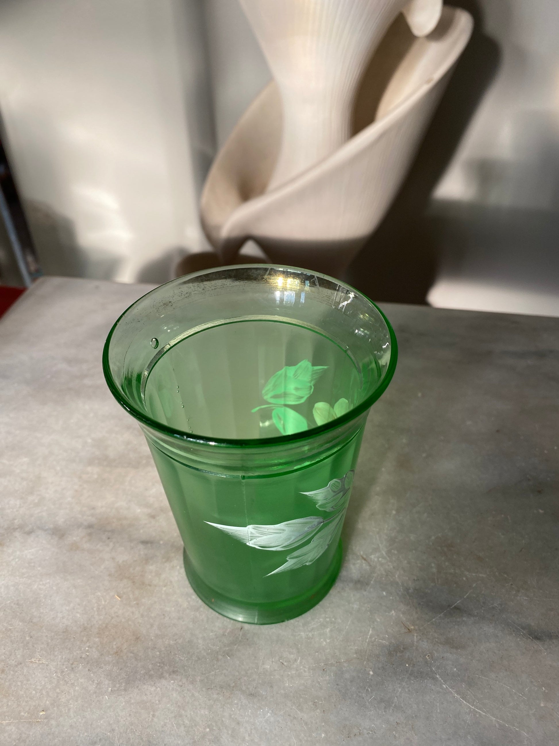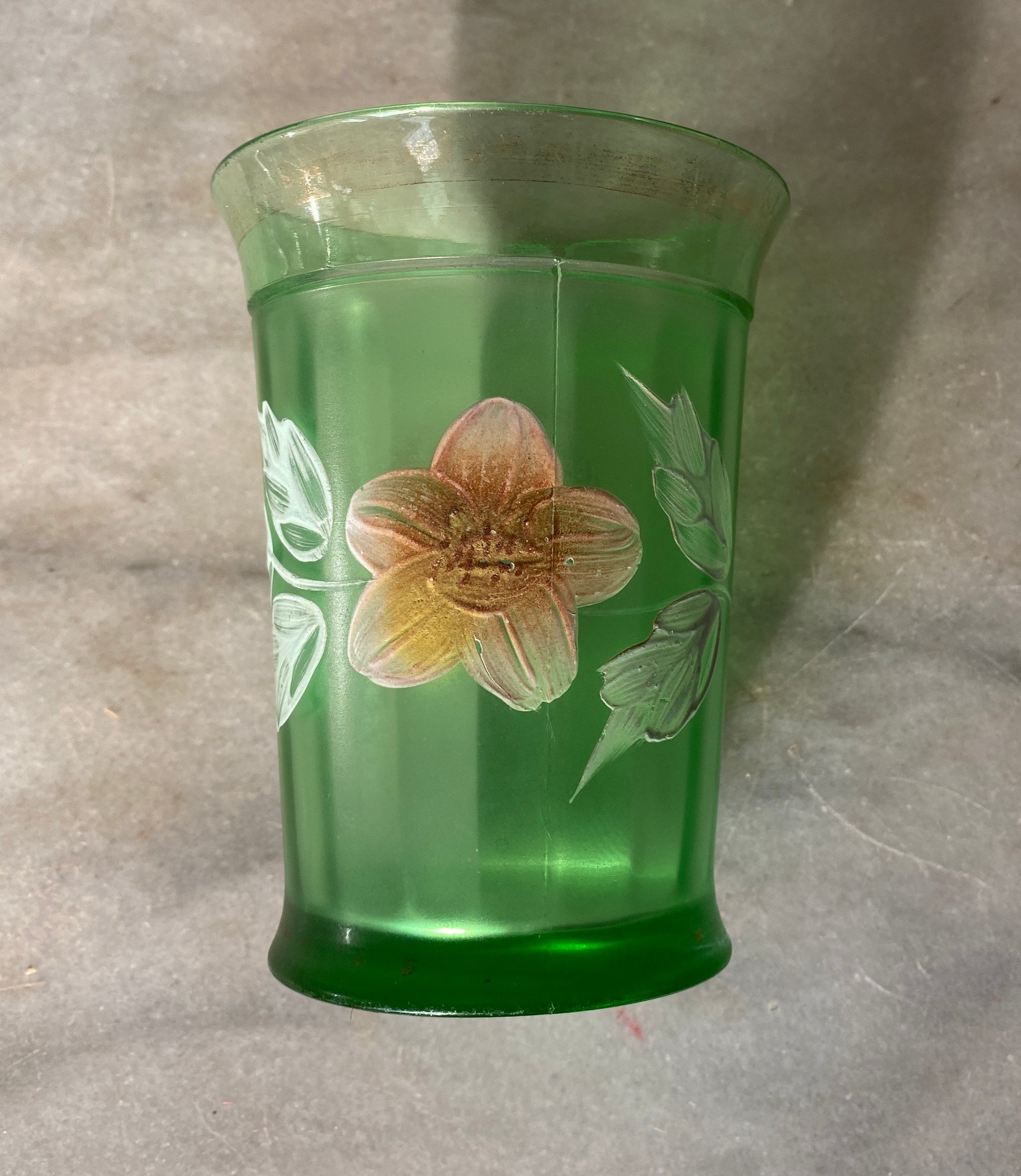 Antique Victorian Green Panel Glass Tumblers, Enameled Flowers, Made in USA, 1800’s, Northwood