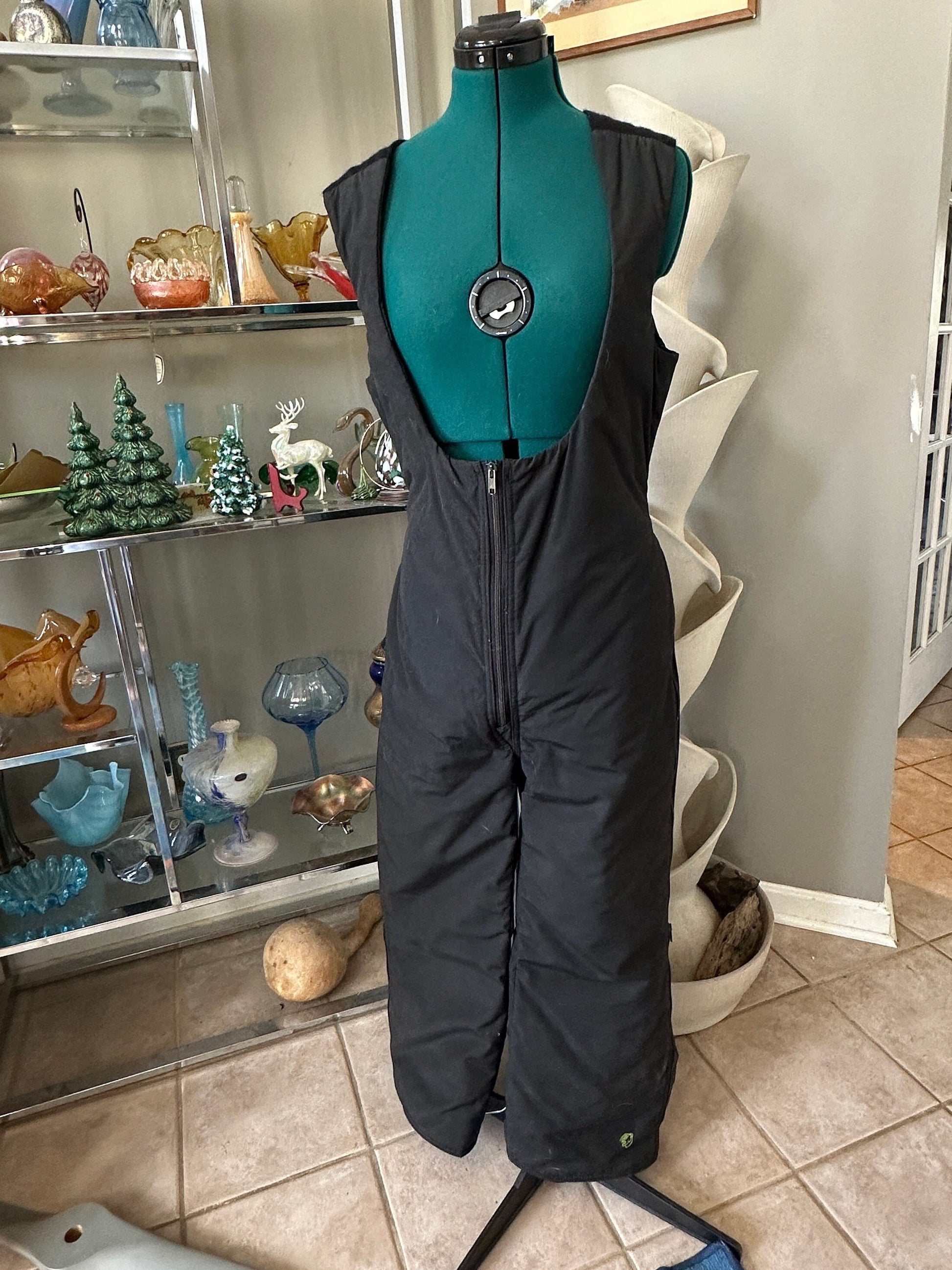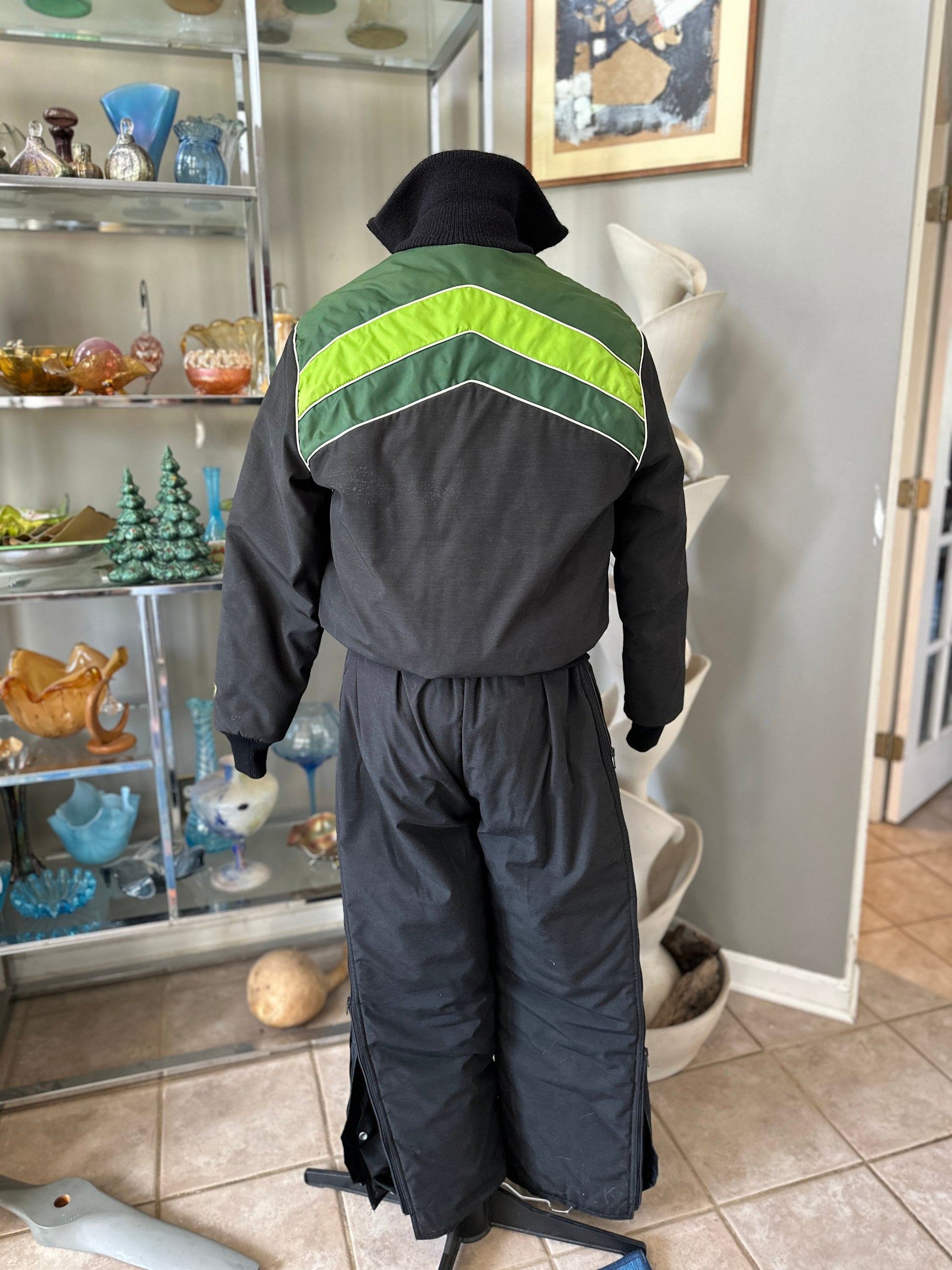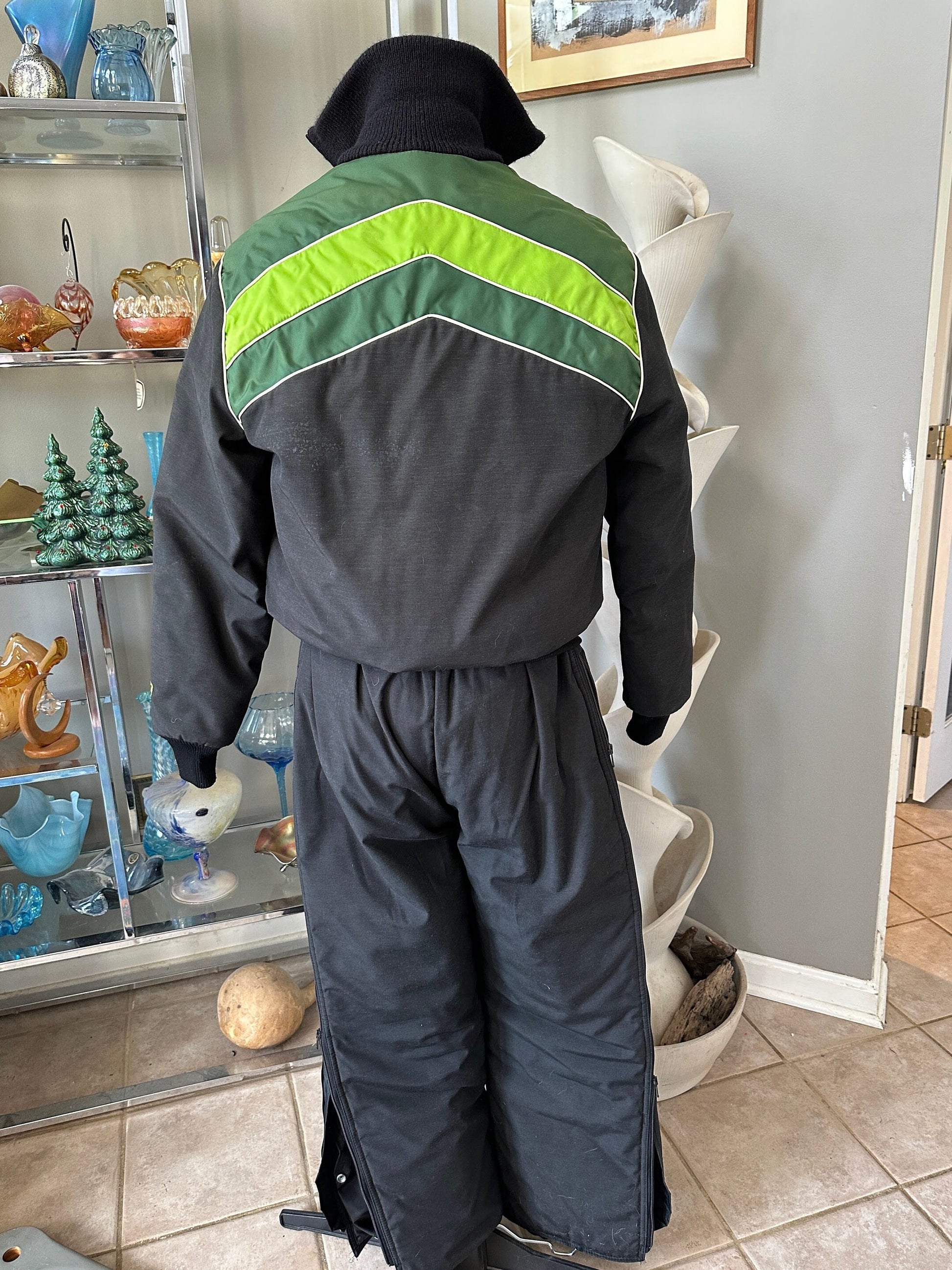 A great vintage Arctic Cat 2 piece snow mobile/ski/snowboard set from the 1970s.Features a cozy jacket in back with green and white geometric stripes. Arctic cat embroidered logo and tag is present. Size large.The jacket has a zipper closure and ribbed cuffs at the end of each sleeve and at the neck. Quilted black satin liningPant /bib overalls are also in back and feature the embroidered Arctic Cat logo in neon green on the bottom of one leg.There is a zipper in the front of the bib overalls as well as along each leg. The neon arctic cat tag is present and pants are marked size large.Measurements:Jacket: