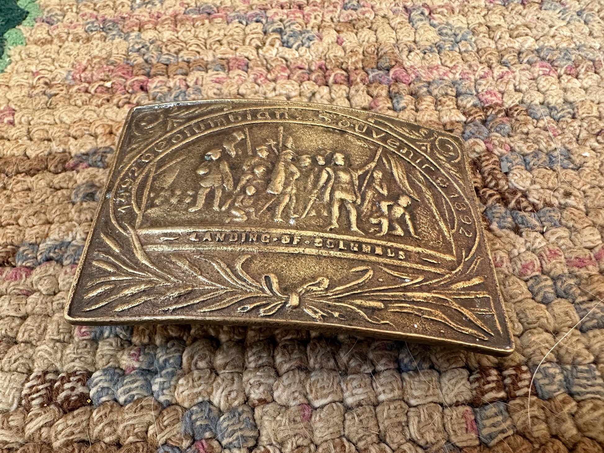 Brass 1492 Christopher Columbus America Explorer Spain 1970s Vintage Belt BuckleVintage Reproduction Belt Buckle. Solid brass buckle with cool Columbian Exposition Souvenir Motif (Landing of Columbus scene). I believe this is a 1970's reproduction of an earlier design. The pictures are the actual buckle you will be getting with any flaws shown.