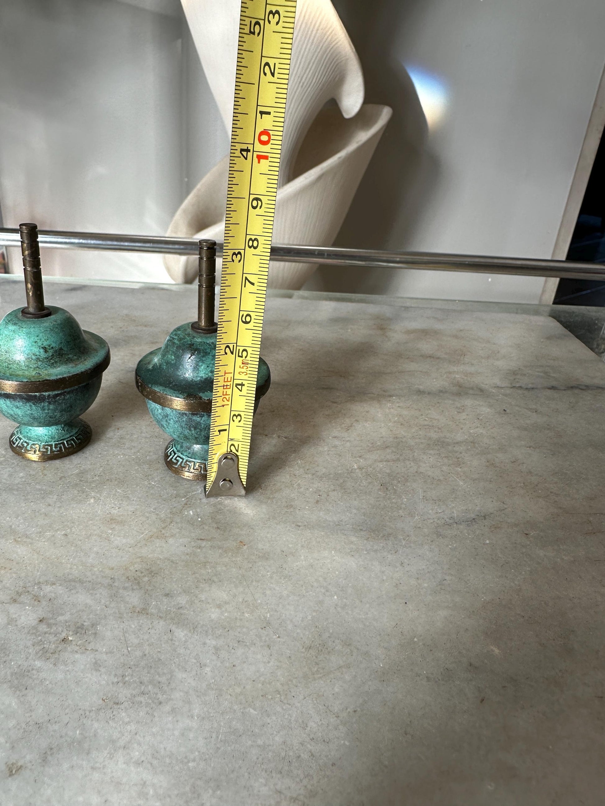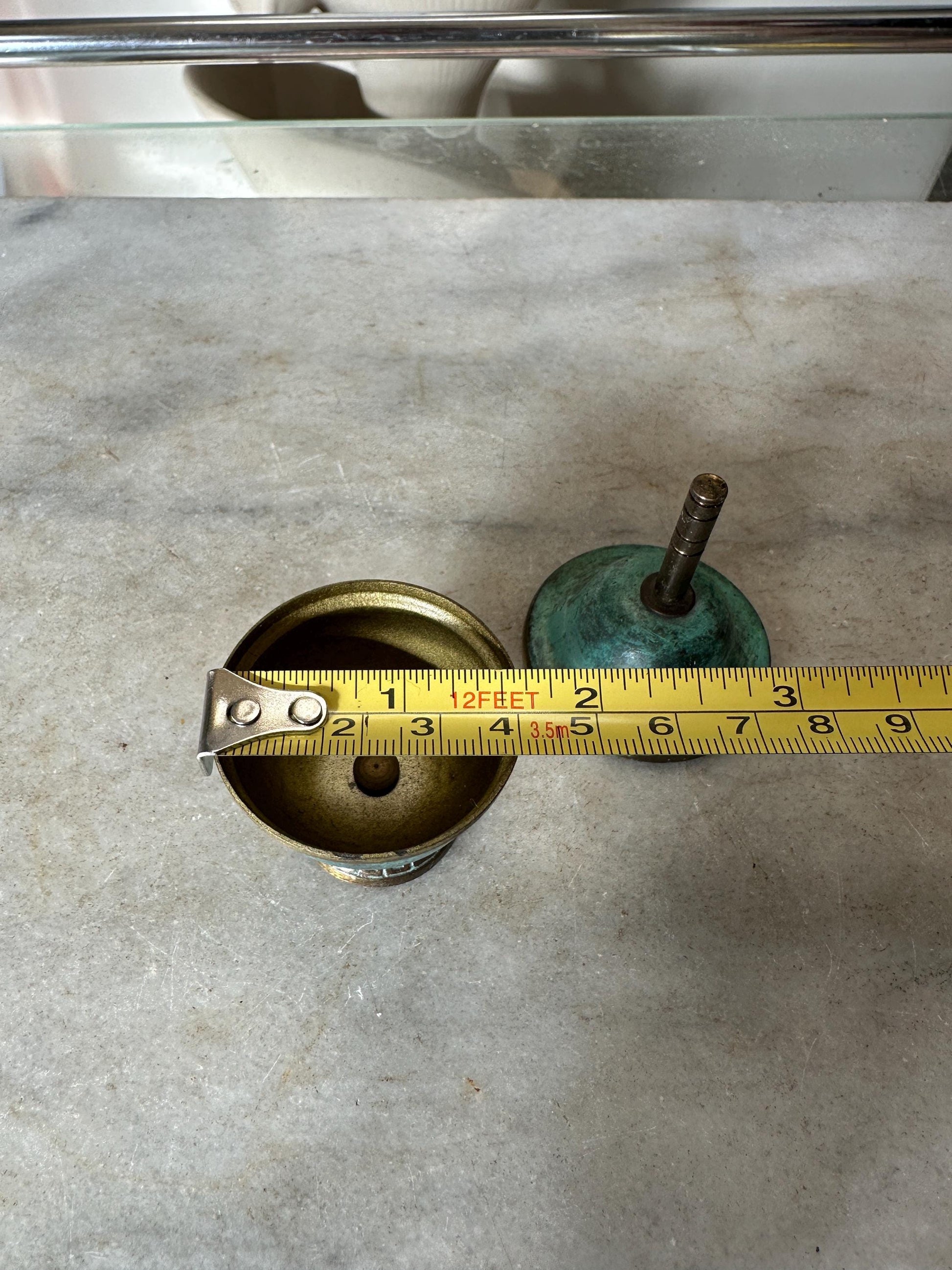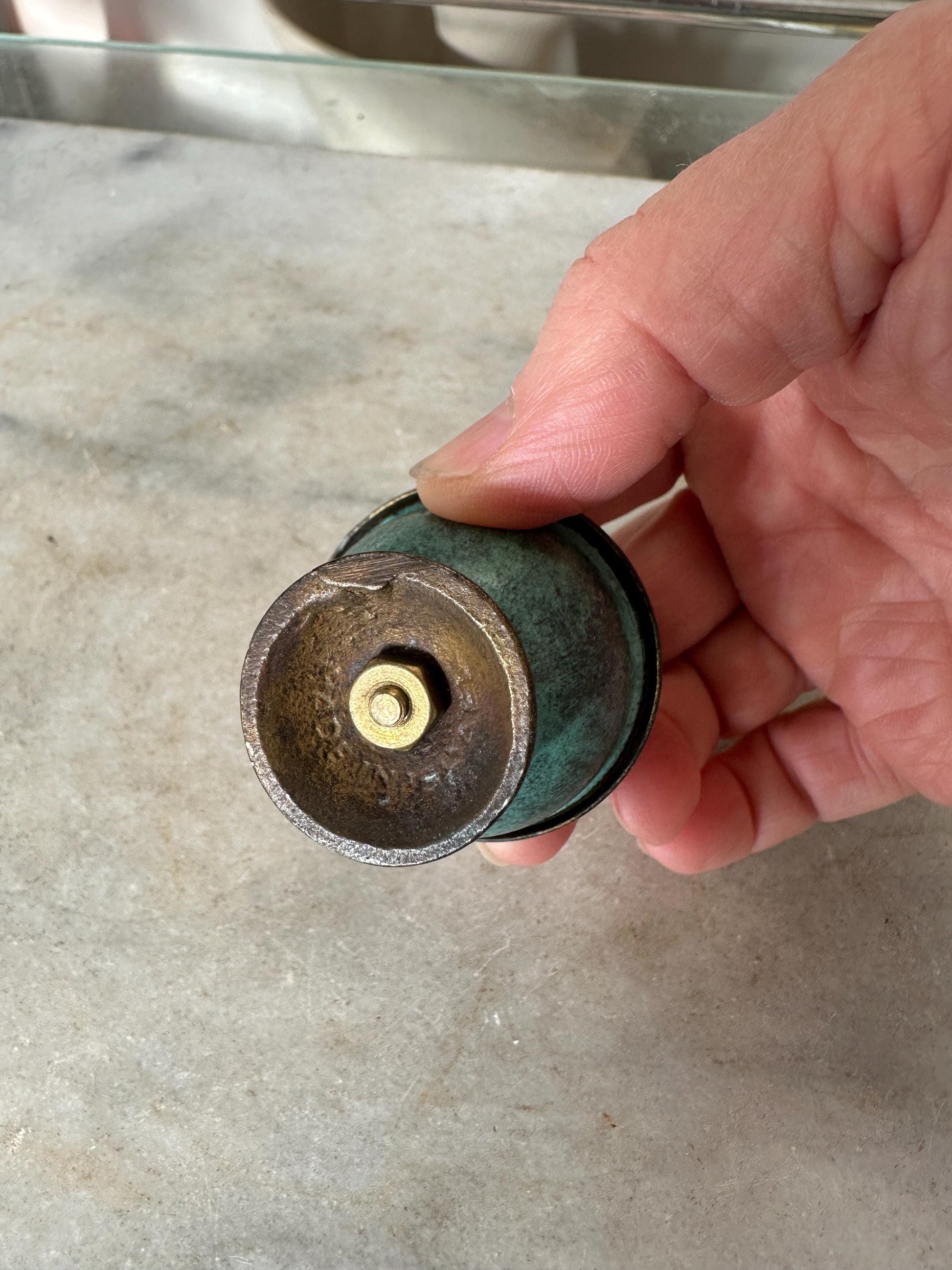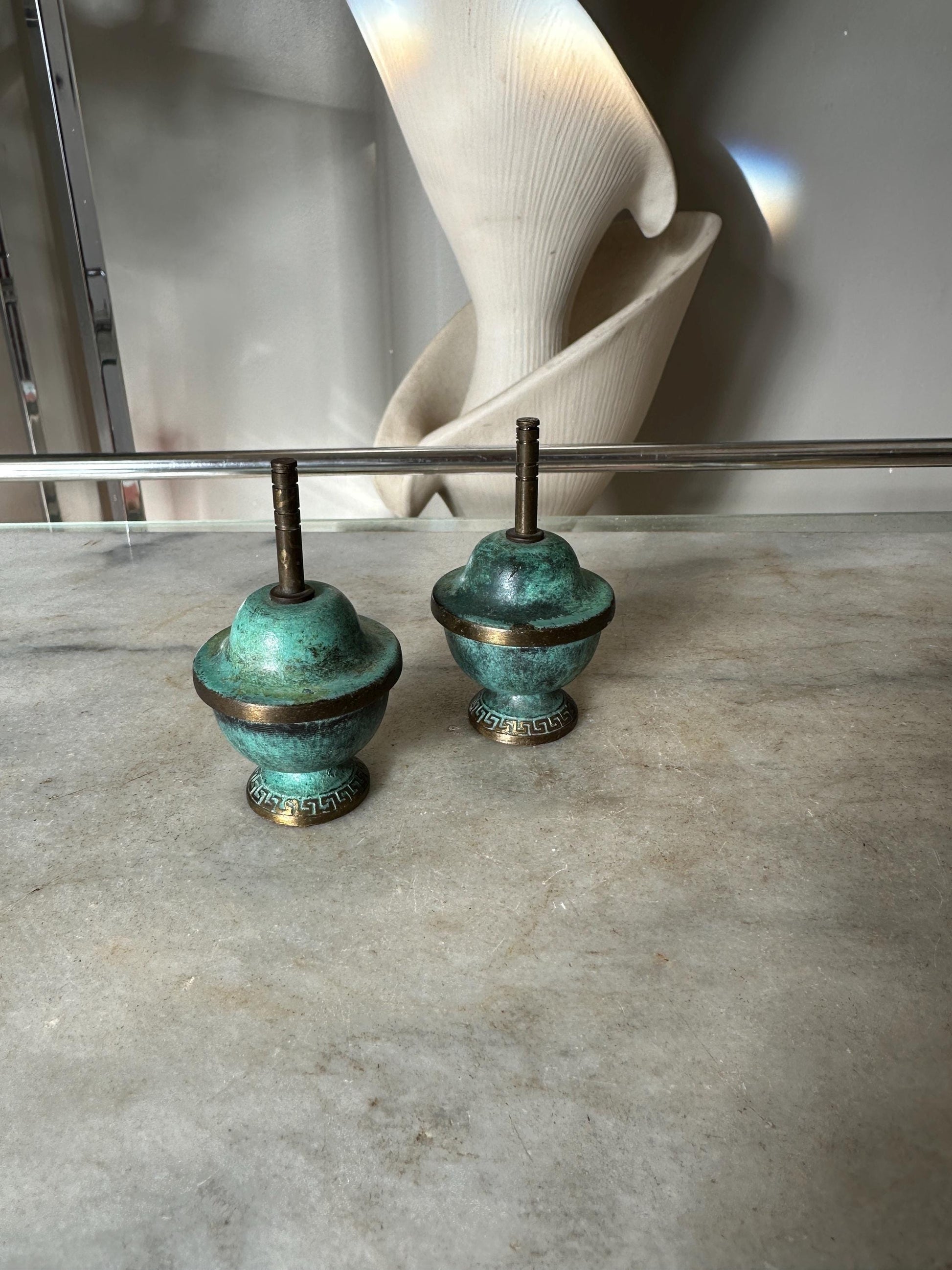 Brass and Turquoise Enameled Saccharin or Spice Bowls & Lids - Set of 2Made in IsraelHere is a pair of Brass and turquoise enameled saccharin or spice bowls & lids.The bowl and lid are each about an inch in diameter. There is some discoloration of the brass.Please see photos for size approximations.