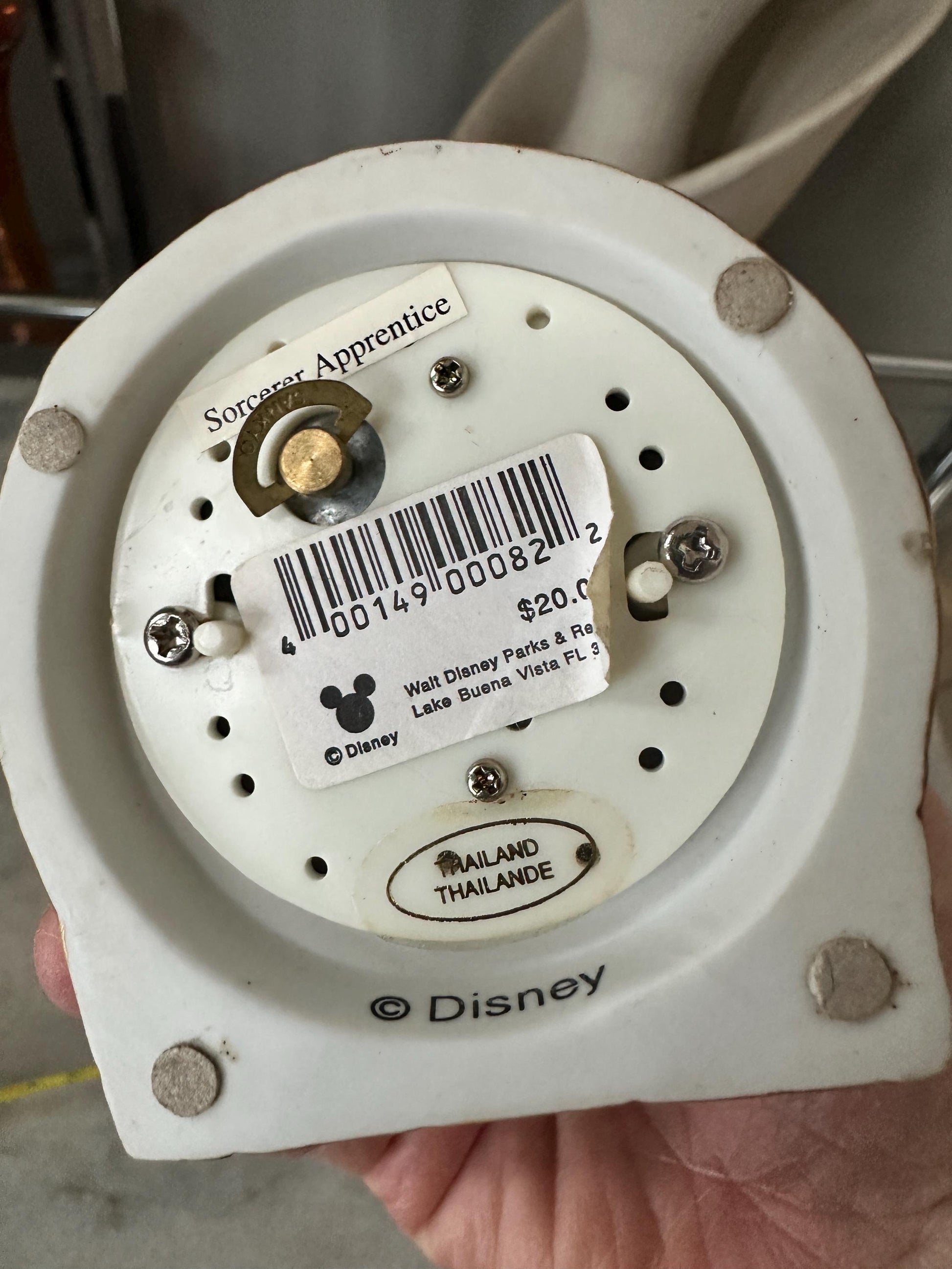 Step into the magic of Disney with this charming vintage Sorcerer Apprentice music box featuring Mickey Mouse and his enchanted brooms from Disney’s beloved film, Fantasia.This beautifully detailed ceramic piece stands approximately 3.5 inches tall and depicts Mickey in his iconic sorcerer’s hat conducting the marching brooms. Crafted in Taiwan, this collectible likely dates to the 1980s–early 1990s, a period when many Disney ceramic music boxes were produced for gift shops and collectors.A wonderful nostalgic display piece for Disney lovers, music box collectors, or anyone who adores classic animation memorabilia.Features: