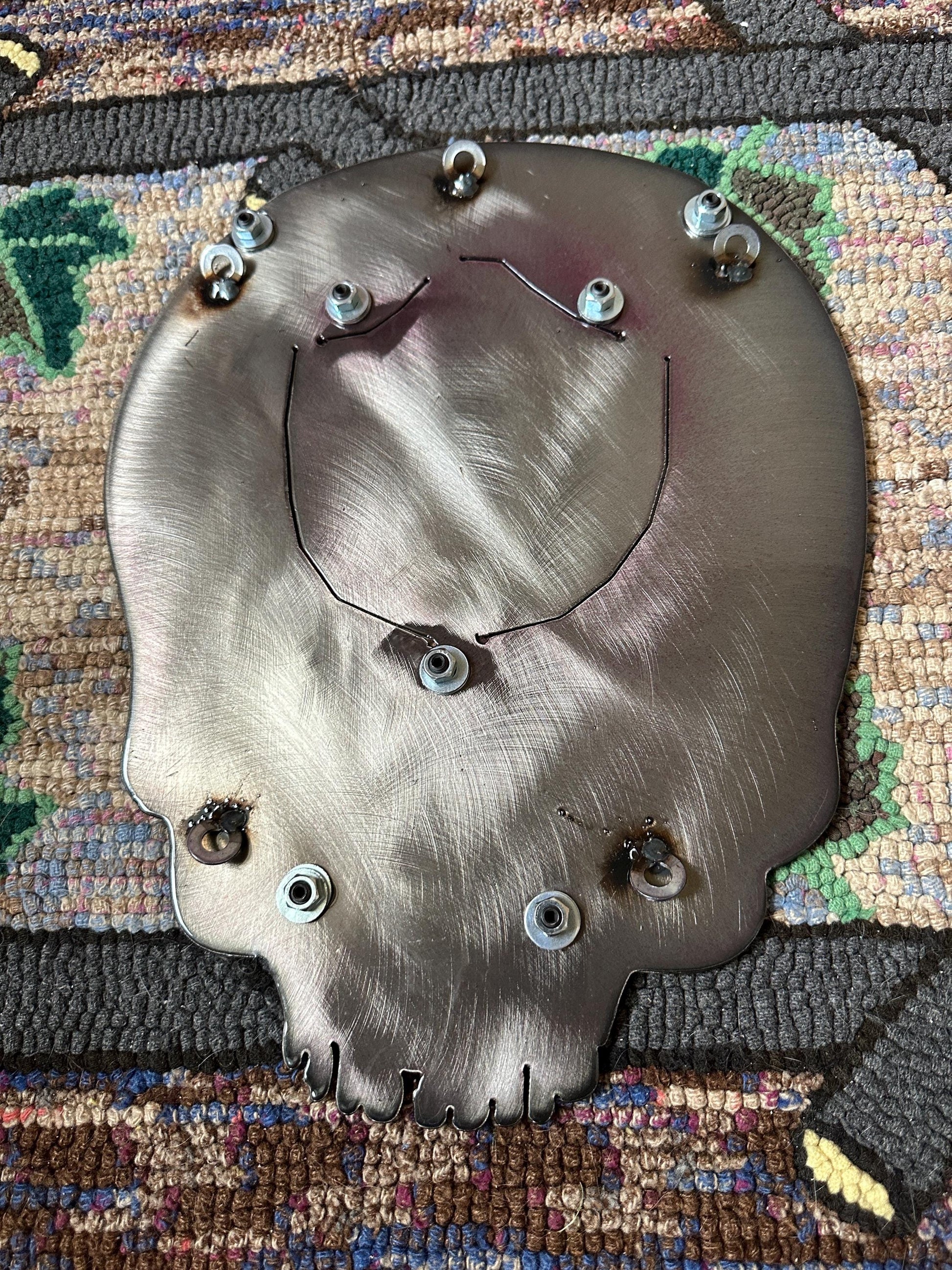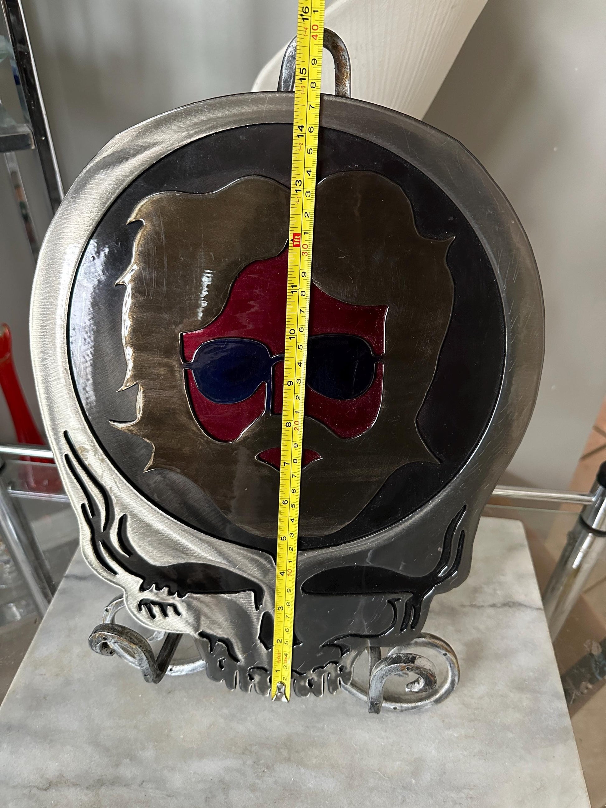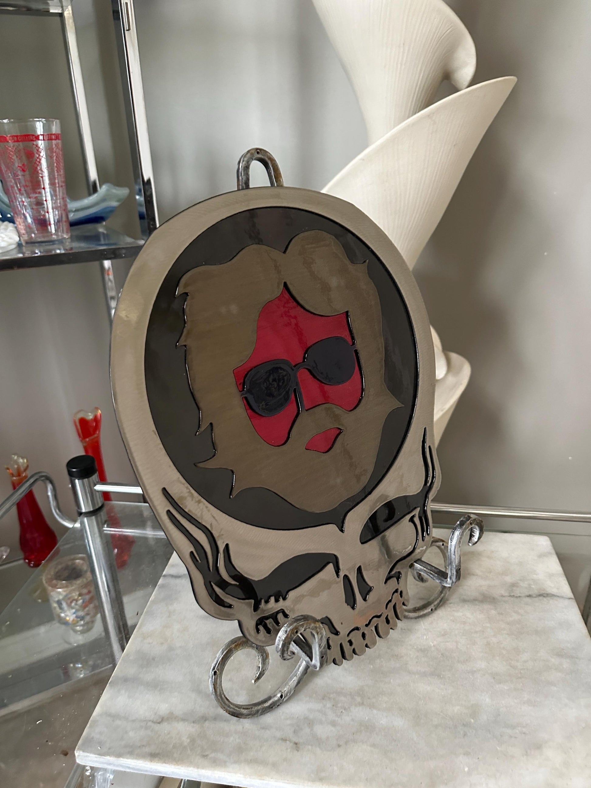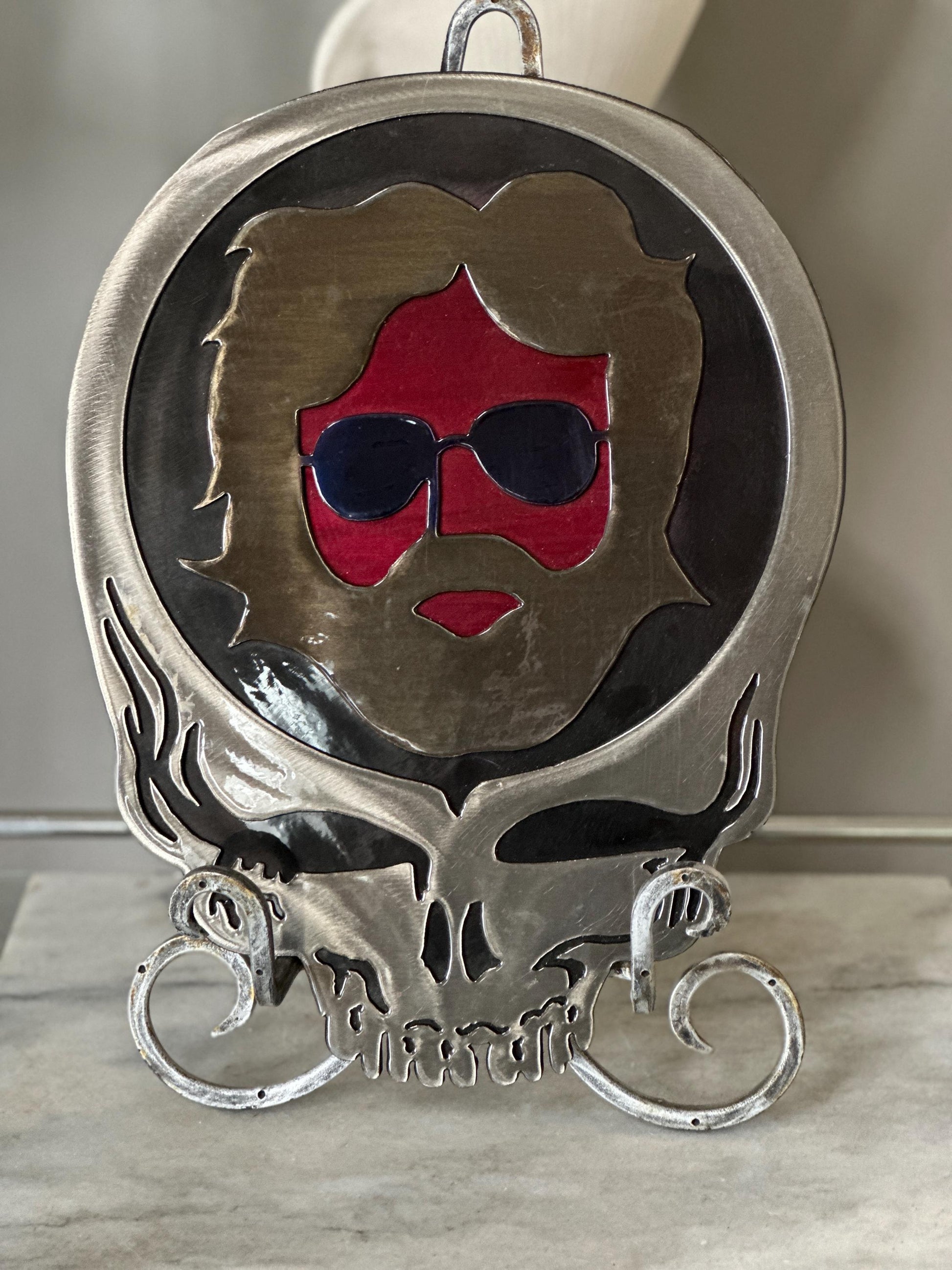 Celebrate the spirit of the Grateful Dead with this striking metal wall art featuring a cool likeness of Jerry Garcia, artfully integrated into the iconic Grateful Dead logo. Precision-cut from durable coated steel, this piece blends industrial edge with a psychedelic vibe — perfect for music lovers, Deadheads, or anyone drawn to unique statement decor.Key Features:Jerry Garcia-inspired silhouette within the classic Grateful Dead "Steal Your Face" logoMaterial: Laser-cut steel with a thin, protective resin coatingDimensions: Approximately 15" wide x 15" highColors: Silver, red and black with subtle sheen from the resin overlay — adds depth while protecting the surfaceGood vintage ckndition with some minimal loss of finish near the bottom. Please see last photo.Ready to hang – lightweight and sturdy for indoor wallsThis handcrafted piece is a perfect tribute to the music and legacy of Jerry Garcia, perfect for music rooms, studios, or as a standout gift for a fellow fan.