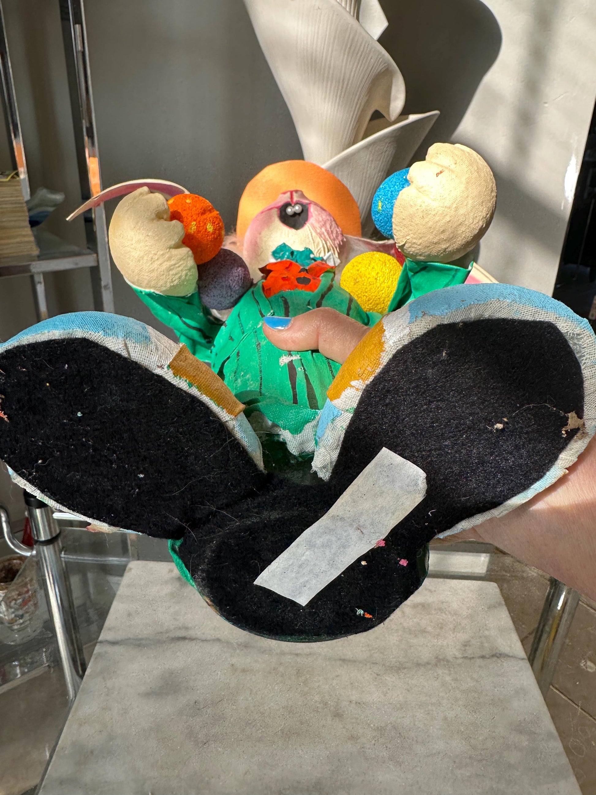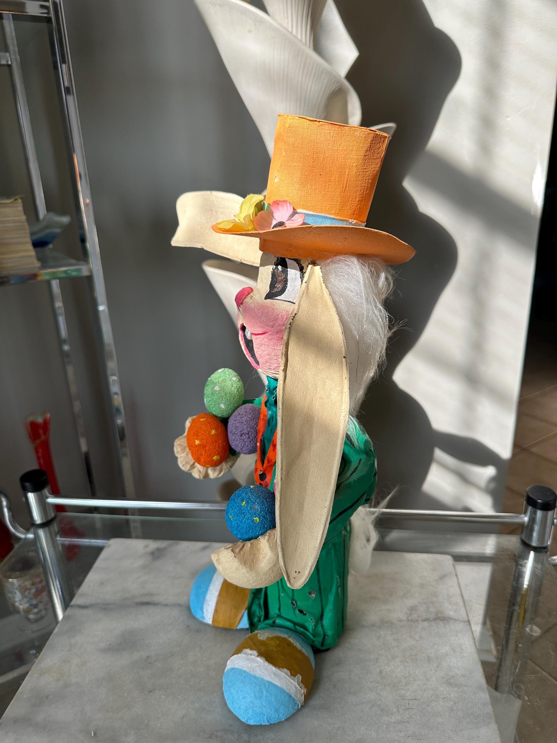 Welcome spring with this one-of-a-kind handcrafted paper mâché Easter bunny, lovingly created to bring a touch of whimsy and charm to your seasonal décor!🌸 Item Details:Height: Approximately 18 inches tallMaterial: Hand-sculpted paper mâché with hand-painted details and faux fur, floral and bead accents.Outfit: Dapper green suit with coordinating bright green top hat.Features: Anthropomorphic face with expressive, lifelike eyes and a delightful personality.This charming bunny is ready to hop into your home, making a perfect centerpiece for your Easter table, mantel display, or springtime vignette. His classic yet quirky look makes him a favorite for collectors and lovers of vintage-inspired holiday décor.One-of-a-kind design – no two are exactly alike!