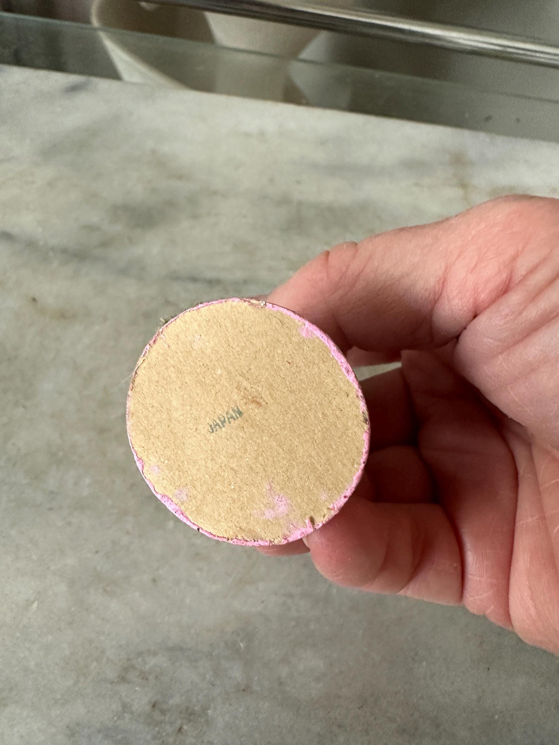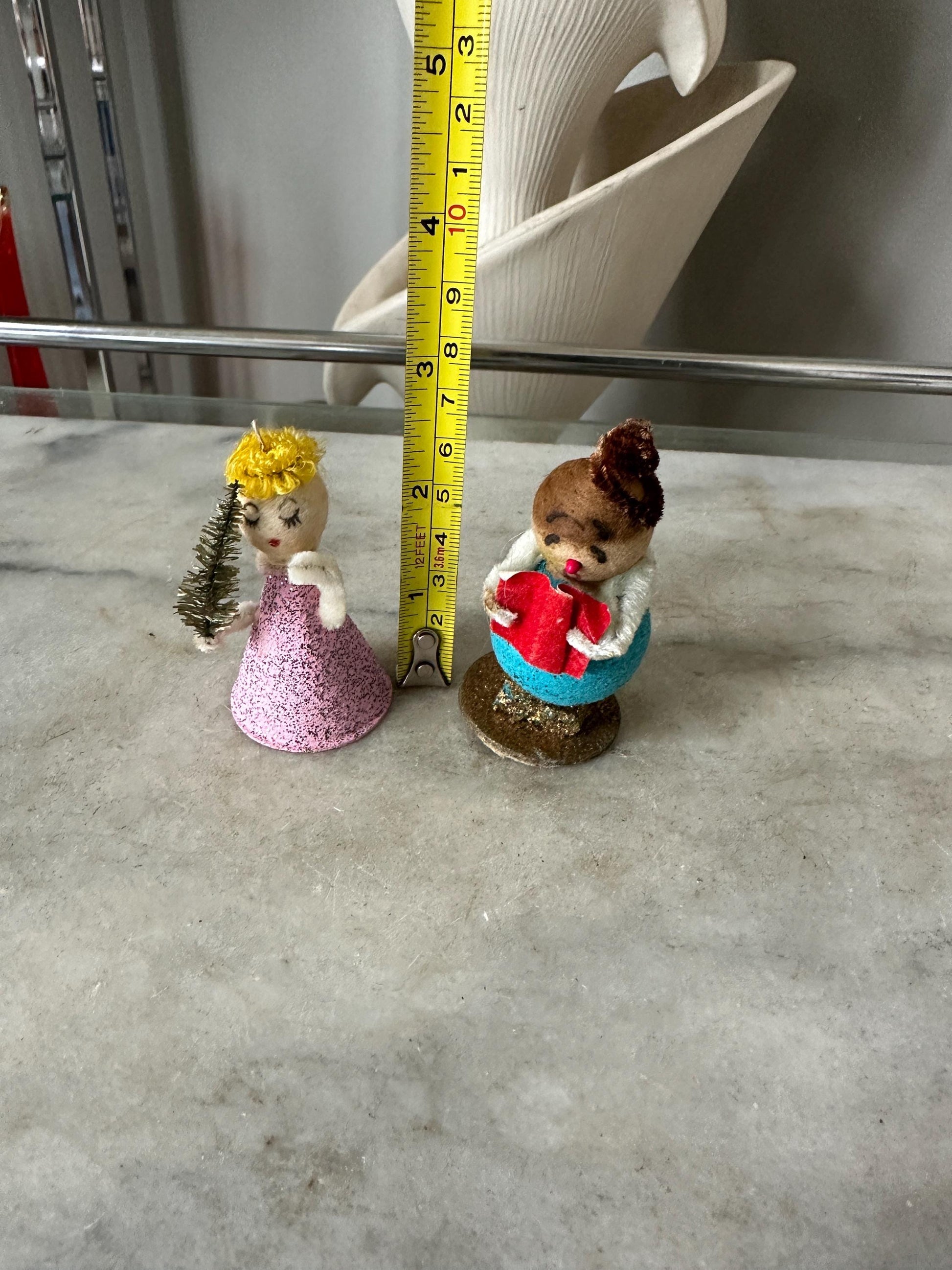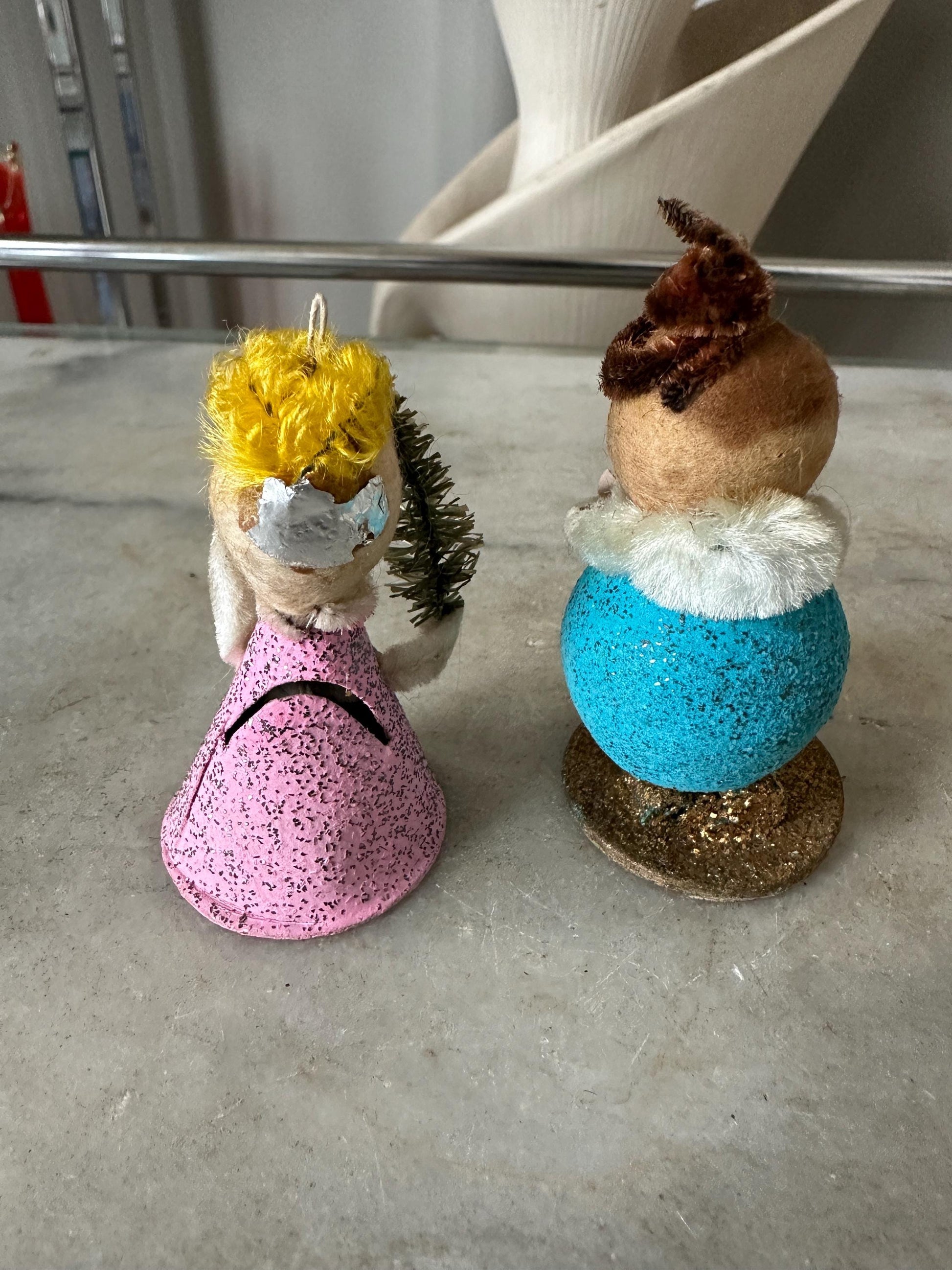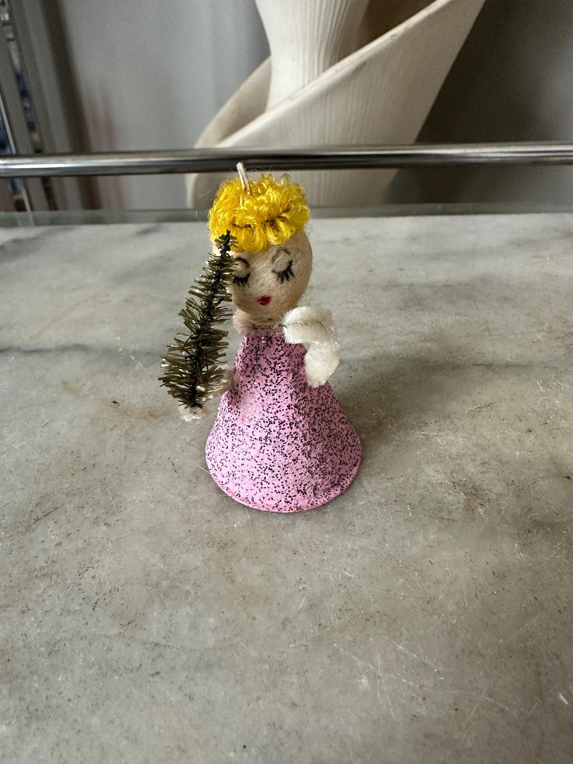 A whimsical set of 3 kitschy vintage ornaments - Made in Japan- in the 1950s.Inclides is a small pink mercury glass ornament tree adorned with silver cardboard leaves and mini Pinecones.Also inclides is a cute pink putz style angel with micah glitter and spun yarn for hair. She is also holding a Mi i bottle brush tree.Finally we are including a small putz style figurine of a man. Please see photos for condition and size approximation.A wonderful addition to your retro Christmas display.