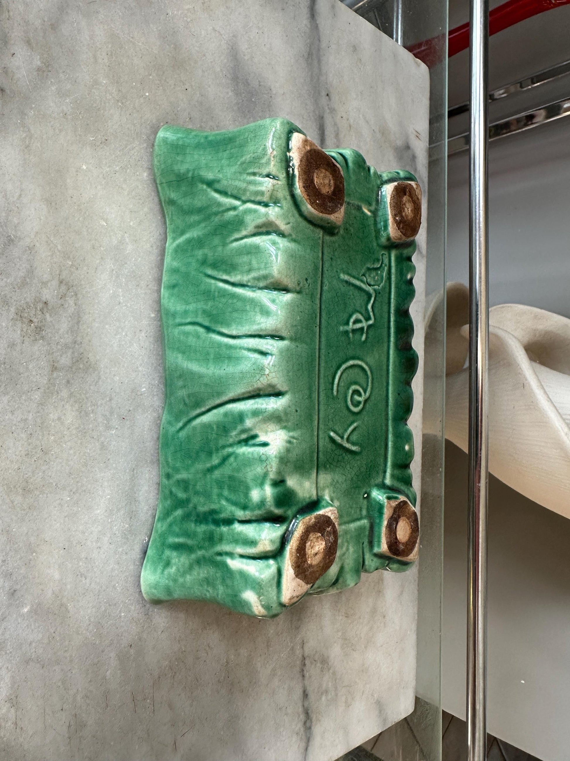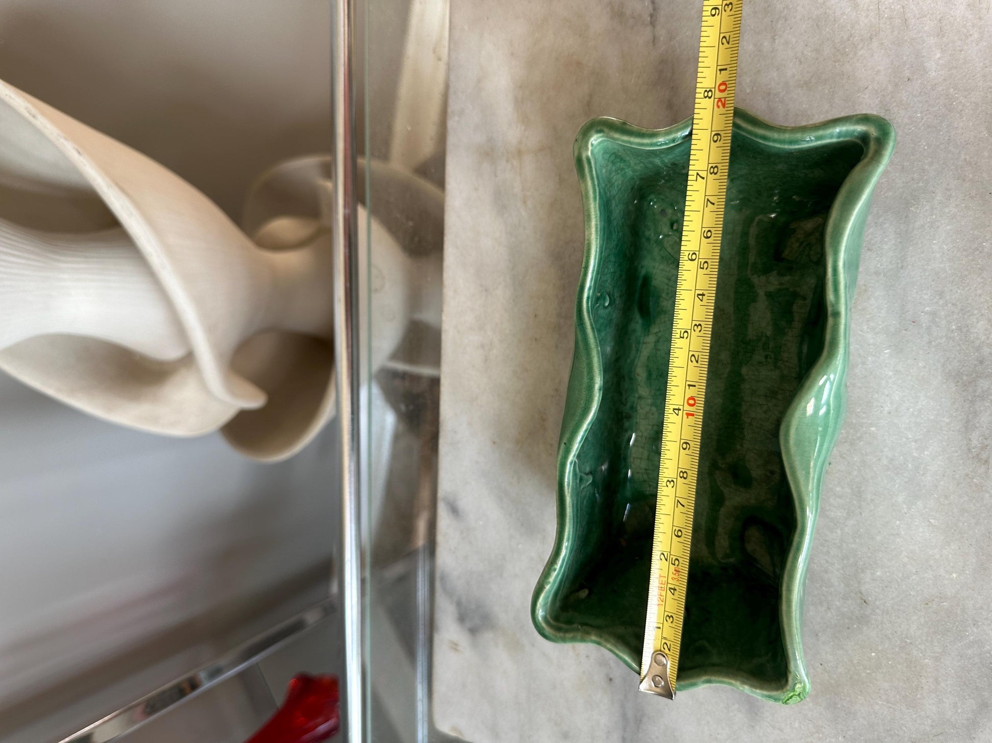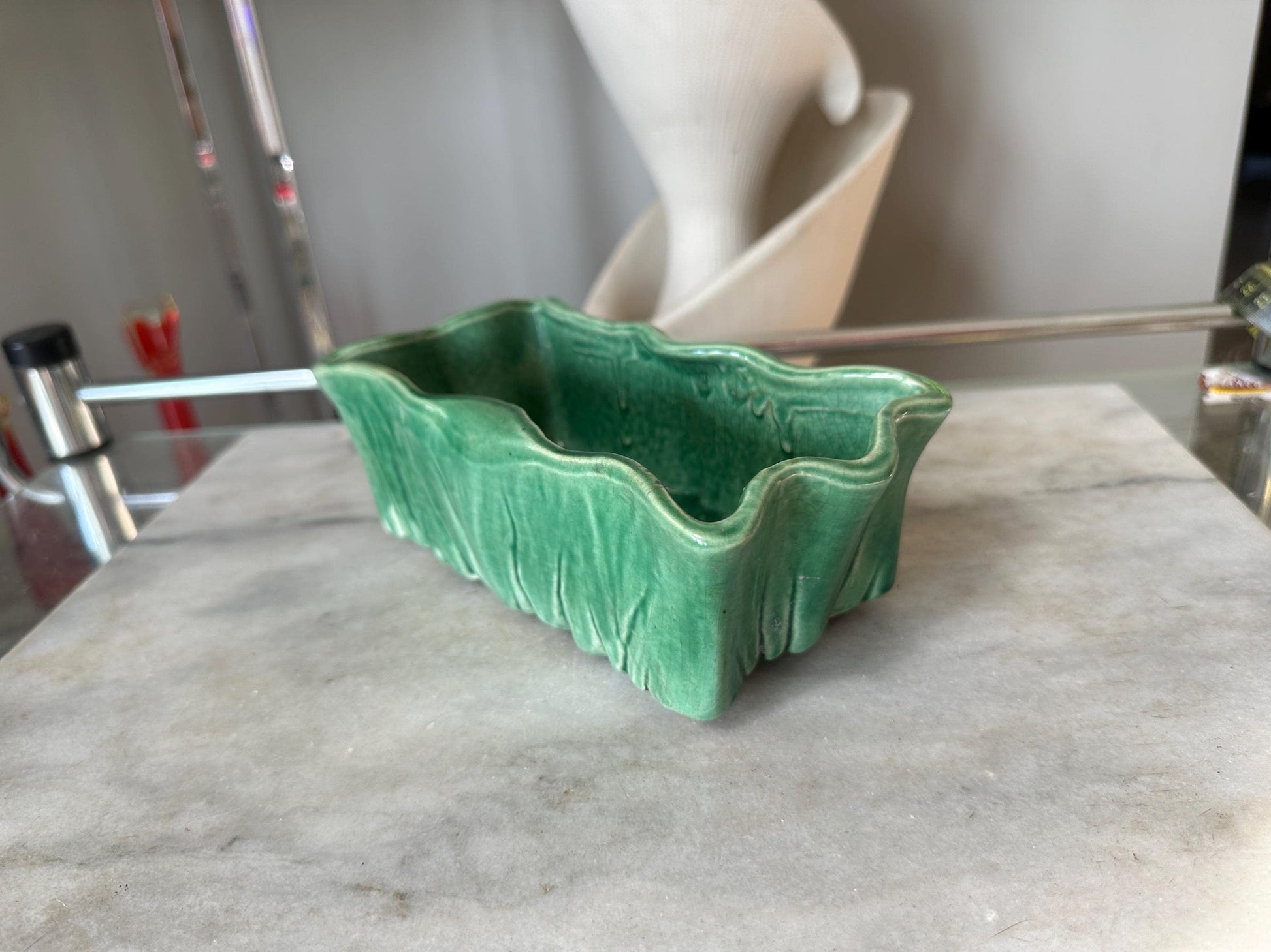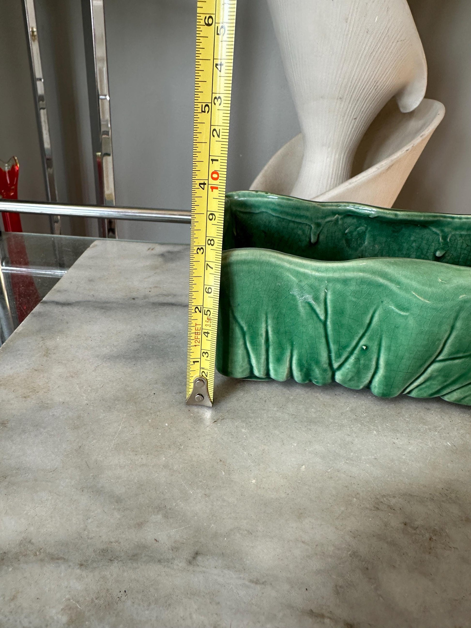 McCoy Green Rectangular Pottery Planter Signed Made in USA, 7 3/4x4x2 3/4 inchWe are offering a McCoy green planting dish. This was made in 1953. The base is clearly marked with McCoy.Features a lovely green glaze and unique design.Good vintage condition. A glazing defect on one corner and age related l crazing is present. Still displays well.A wonderful addition to a McCoy or USA pottery collection.