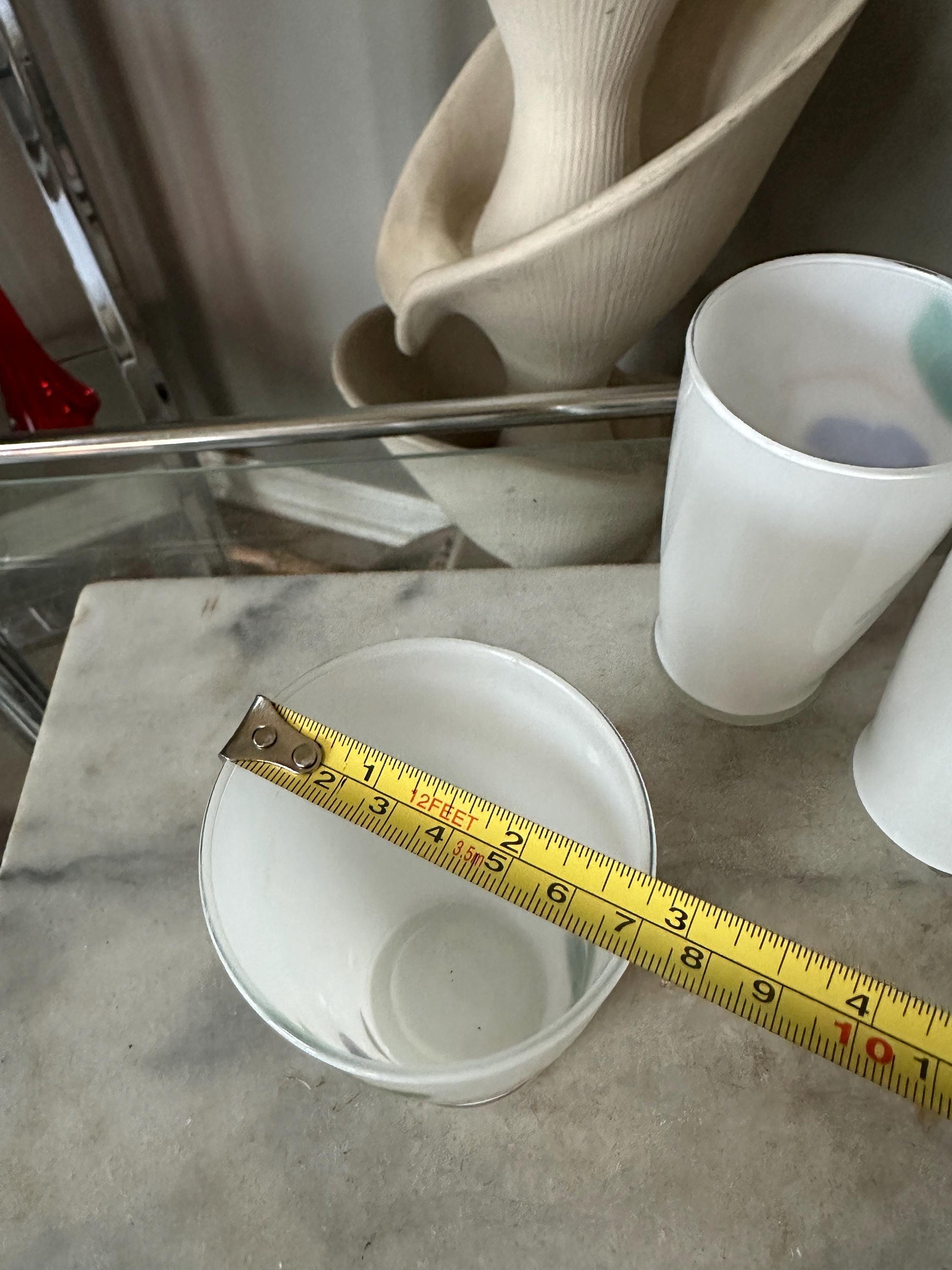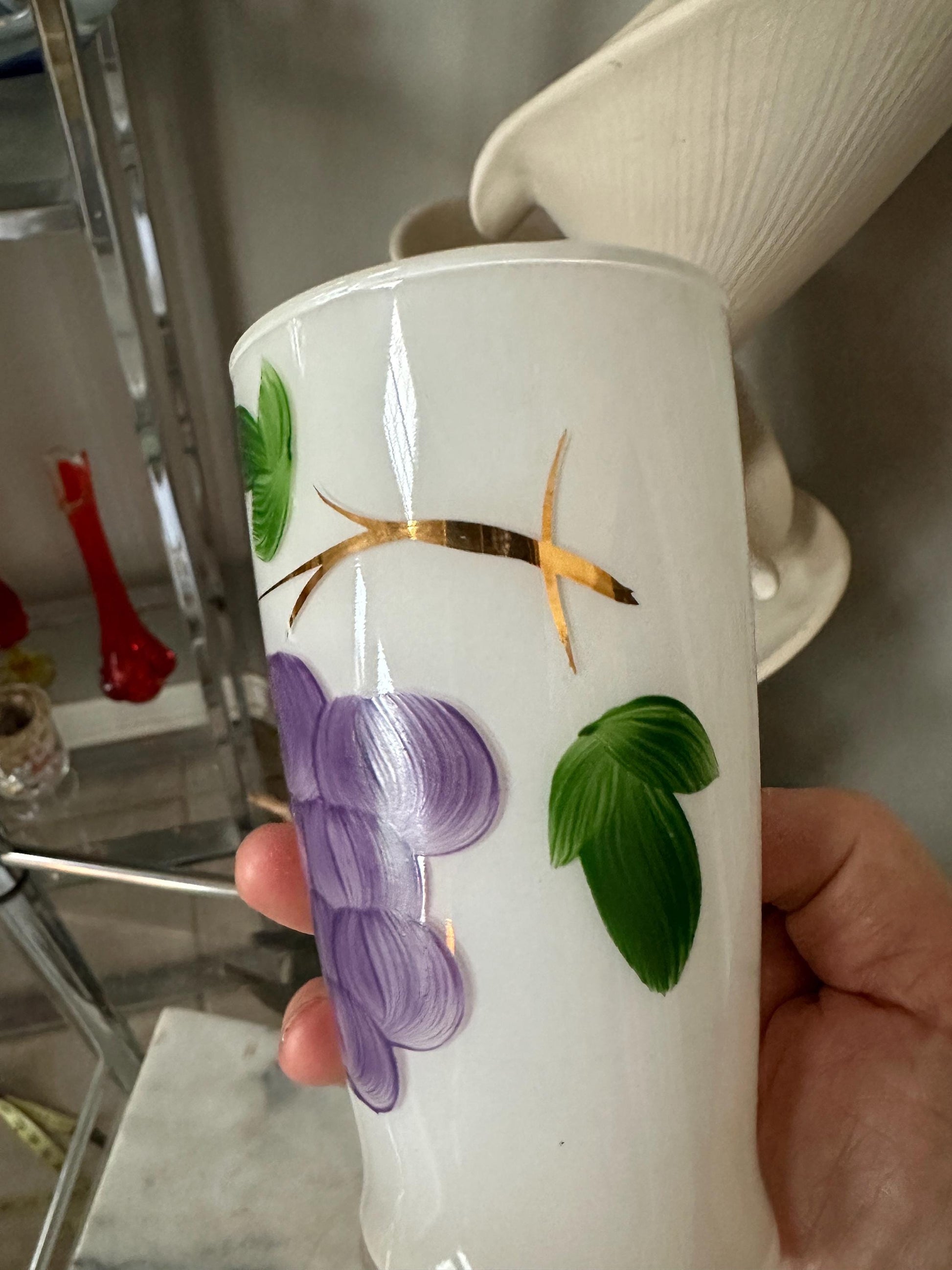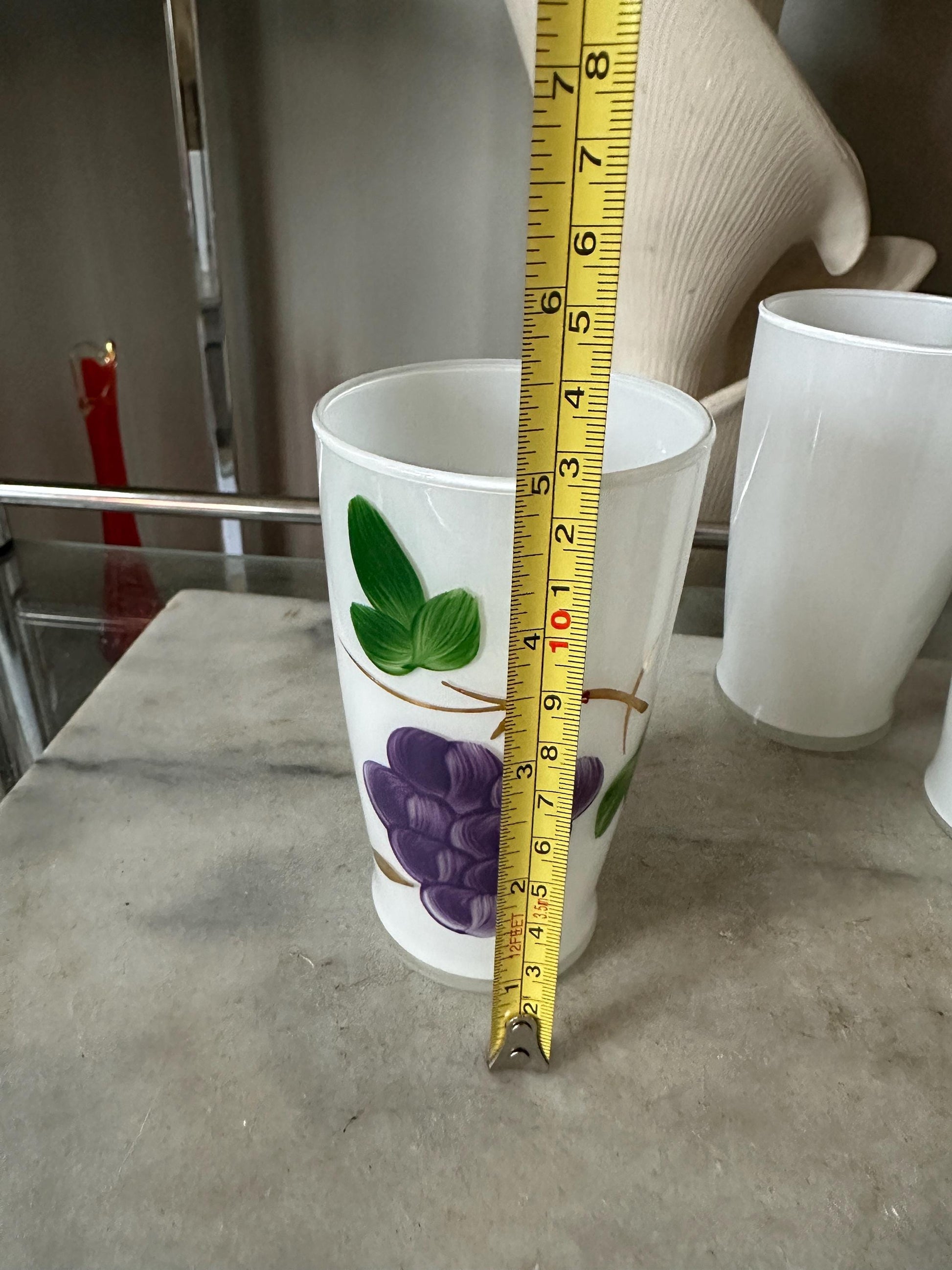 Mid Century Bartlett Collins Frosted Glasses (4) Glass Grape Design Set of 4 from the 1950s.This set was possibly made by Bartlett-Collins Glass Co. and decorated by Gay Fad Studios. The pieces were hand painted with purple clusters of grapes, green leaves, and gold vines. Each tumbler holds 10 fluid ounces of liquids. Hand wash the tumblers.Each tumbler measures 4-7/8" in height by 2-3/4" in diameter across the top opening and 2-1/8" in diameter cross the bottom base. This cluster of grapes pitcher and matching tumbler set is in good condition with no chips, cracks, or breaks.This is a lovely set to use when guests visit or just to have in the spring & summer to serve those who visit ice cold lemonade, iced tea, or your beverage of choice!