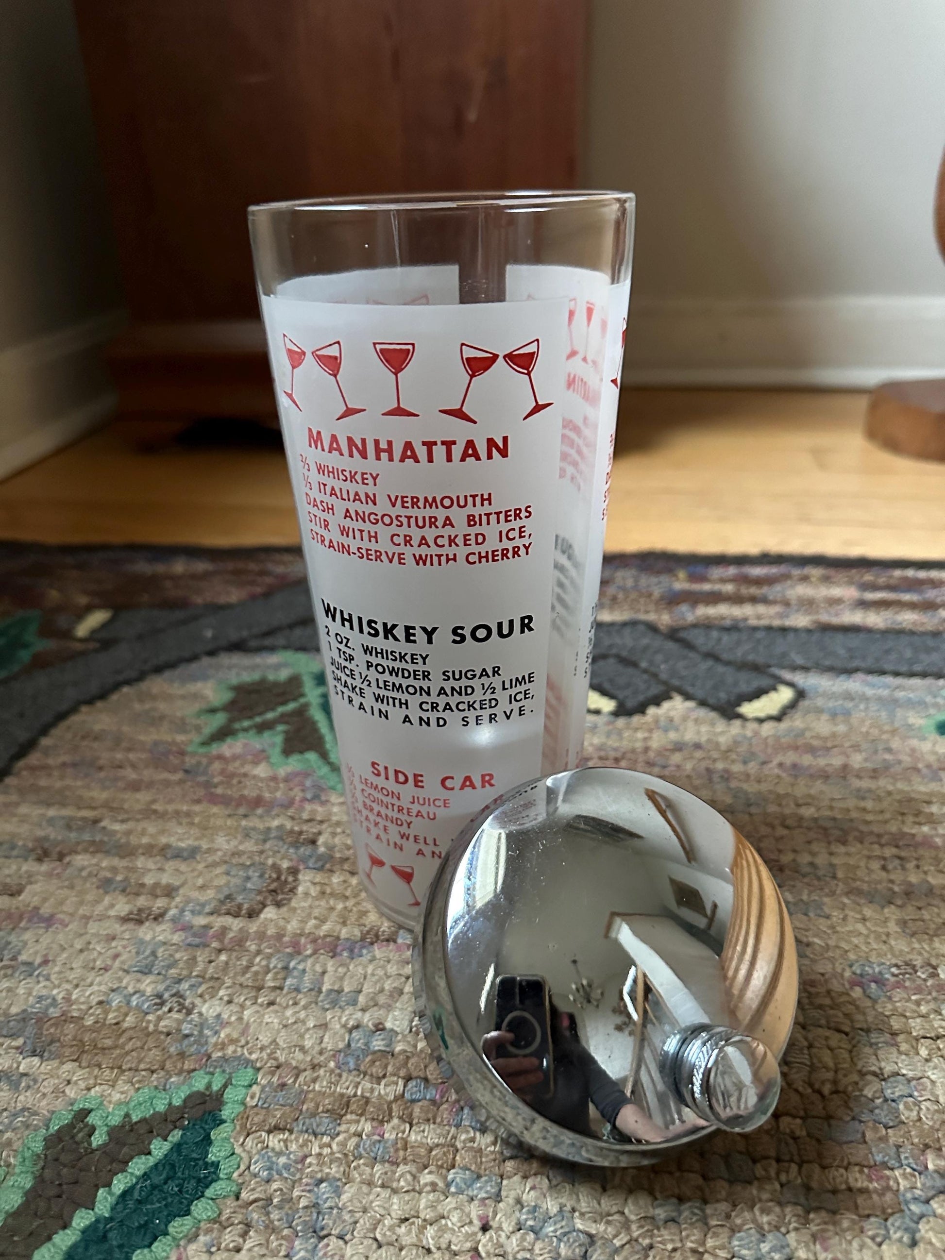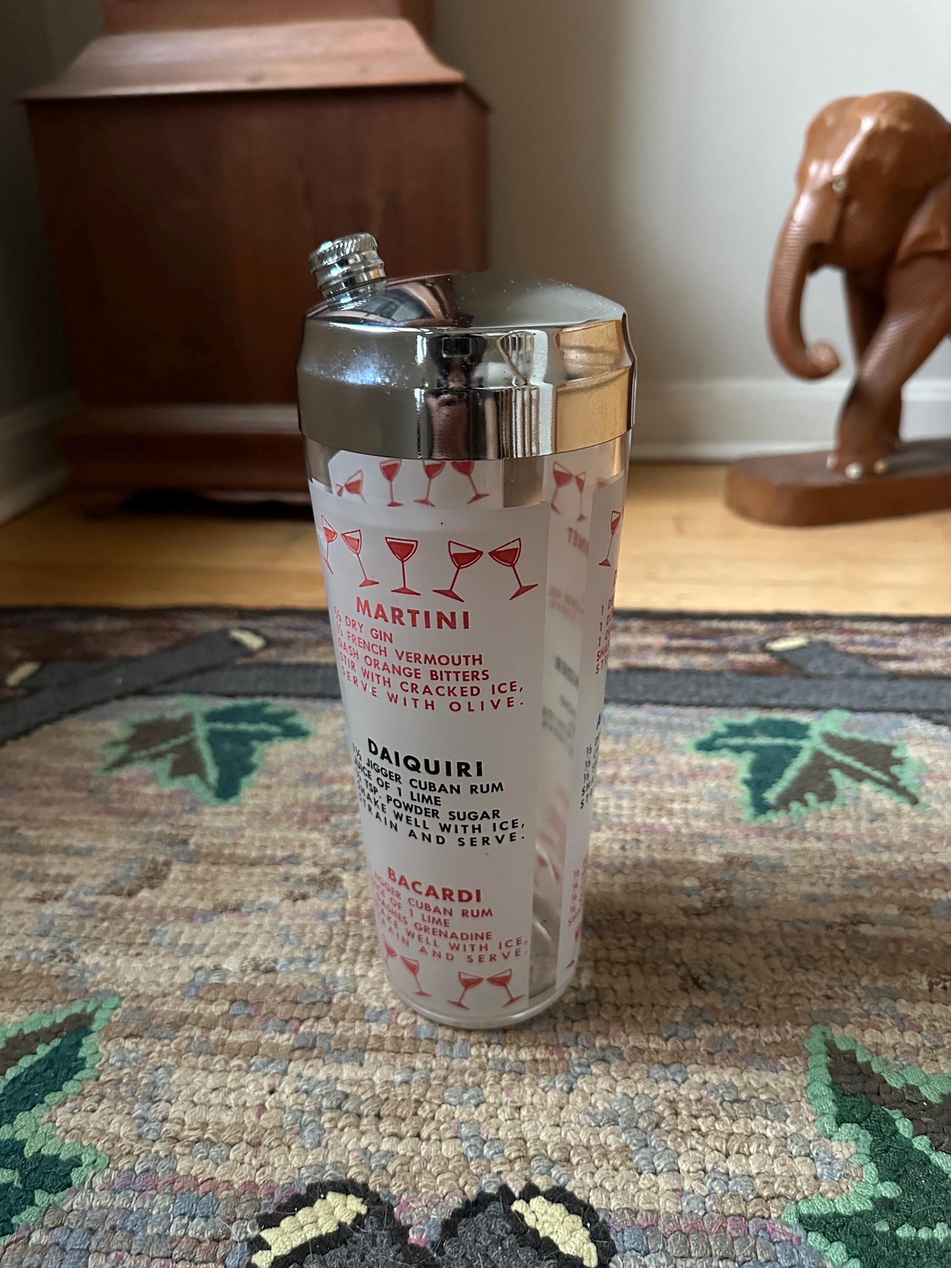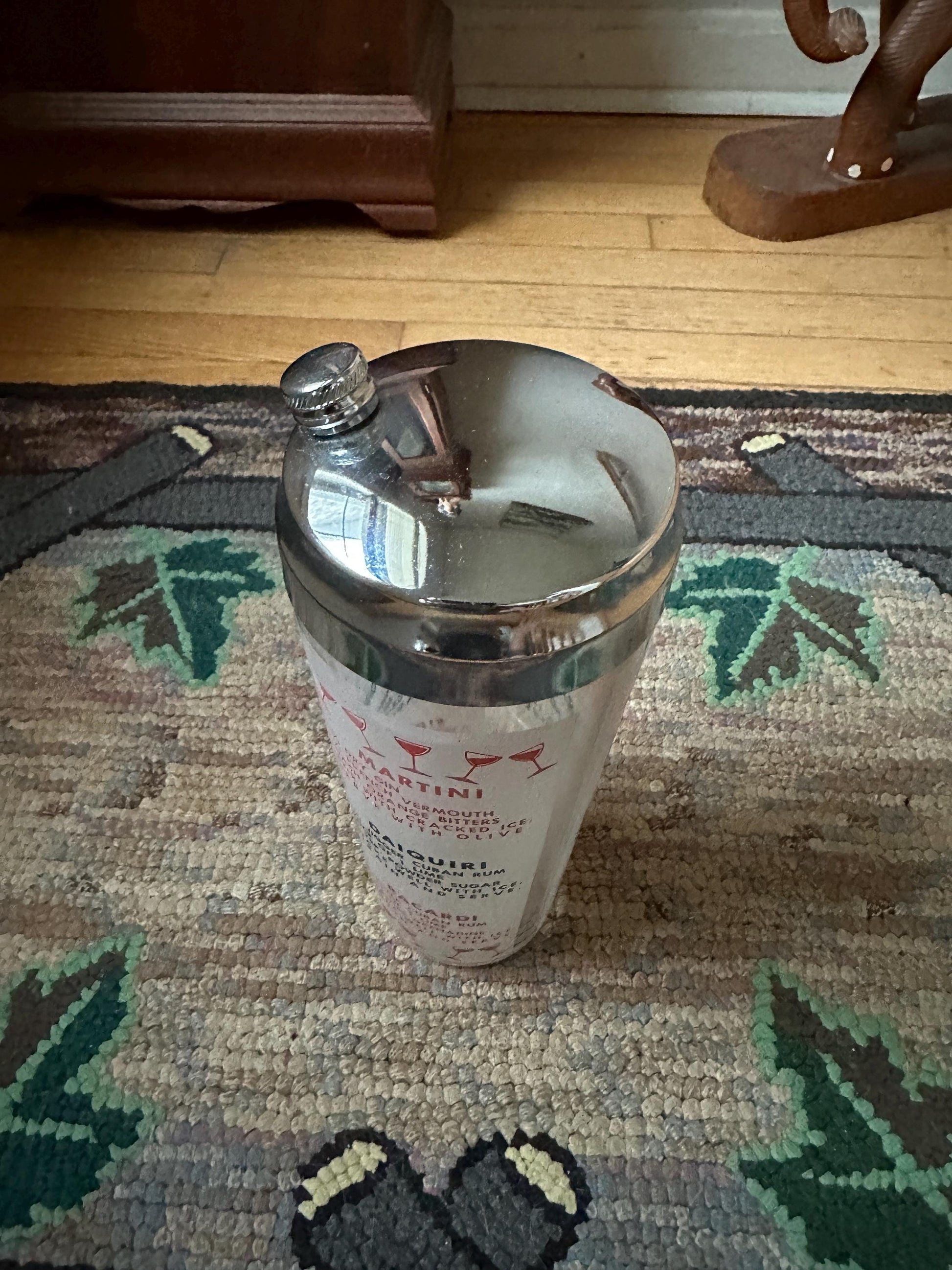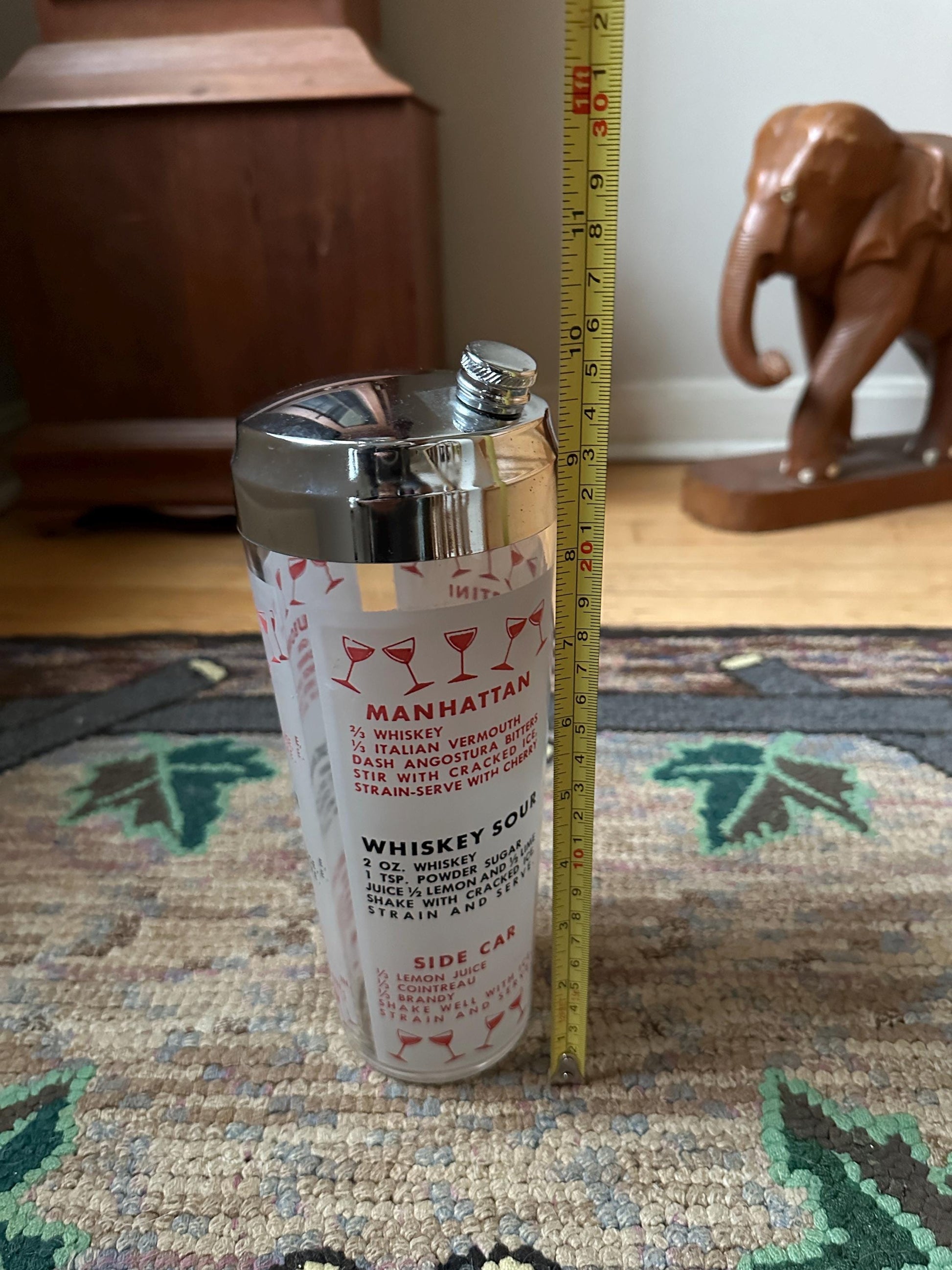 Mid century cocktail shaker with recipes from the 1960s.A cool classic mid-century cocktail shaker with 9 cocktail recipes, Manhattan, whiskey sour, side car, martini and more conveniently printed on outside.Measures approx. 10" tall and 4" across, metal lid fits snuggly on top to shake and has a removable top to pour ingredients in and a screw off cap to pour finished cocktail in your favorite glass. In good vintage condition with expected wear/surface scratches to metal top. Please see all photos for condition. Glass shaker is free from chips and cracks and the graphics and font are crisp and vibrant.A wonderful addition to your bar or wine cart. Makes a great gift.