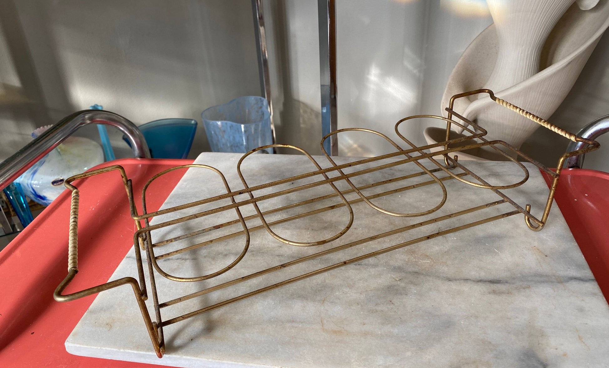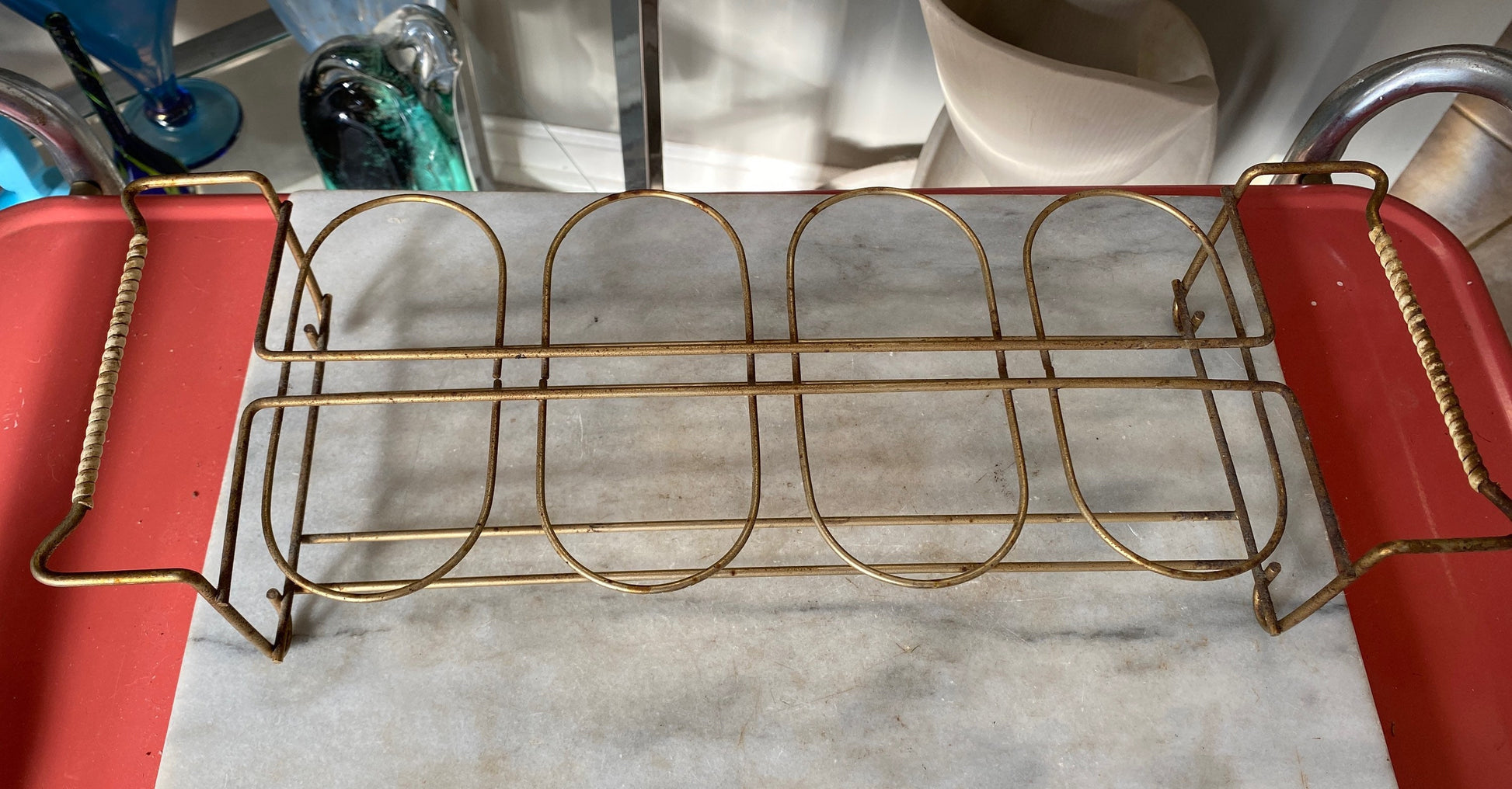 Mid-century Federal Glass tumbler and caddy set from the 1950s.The set consists of 8 Collins glasses with a white and gold floral design. These glasses measure 5" high, 2⅞" round at the top, 2⅛" round at the base and hold 11 fluid ounces. These tumblers feature a gorgeous white floral design around the glass and a gold floral band under the rim. May be used to serve your favorite Collins cocktail or use them as all purpose glasses to serve water, soda, lemonade, iced tea or coffee. The caddy holds the 8 glasses and features handle ends that are adorned with white gimp. The caddy measures 17” x 6” x 3.5”. The caddy has some age related loss of finish and patina. Could use a good cleaning. Being sold as found.Please check out our other listings for more mid century modern pieces as well as our other unique vintage listings.Our shop sells vintage items that might show wear. We strive to post accurate photos and descriptions to ensure you're happy with your purchase. We encourage you to contact us with any questions you have about this item.Please check our shop for hundreds of vintage, mid-mod, and antique items: