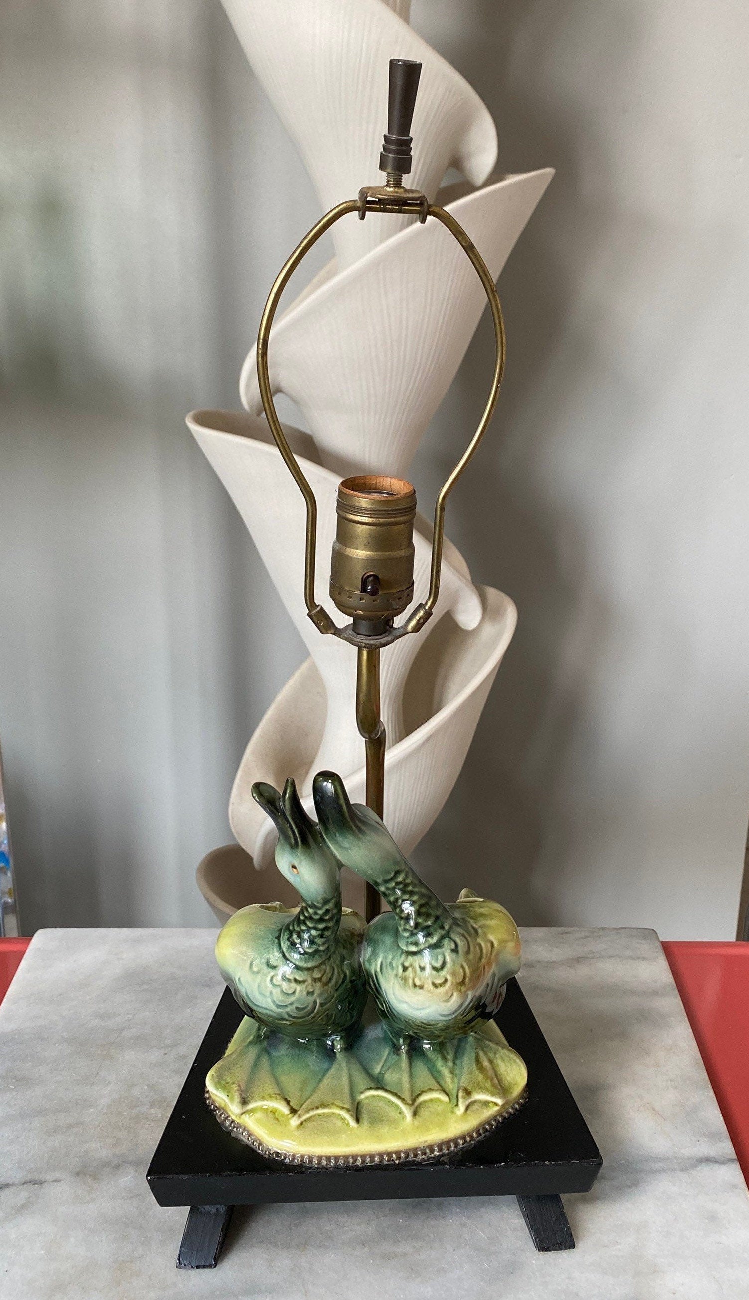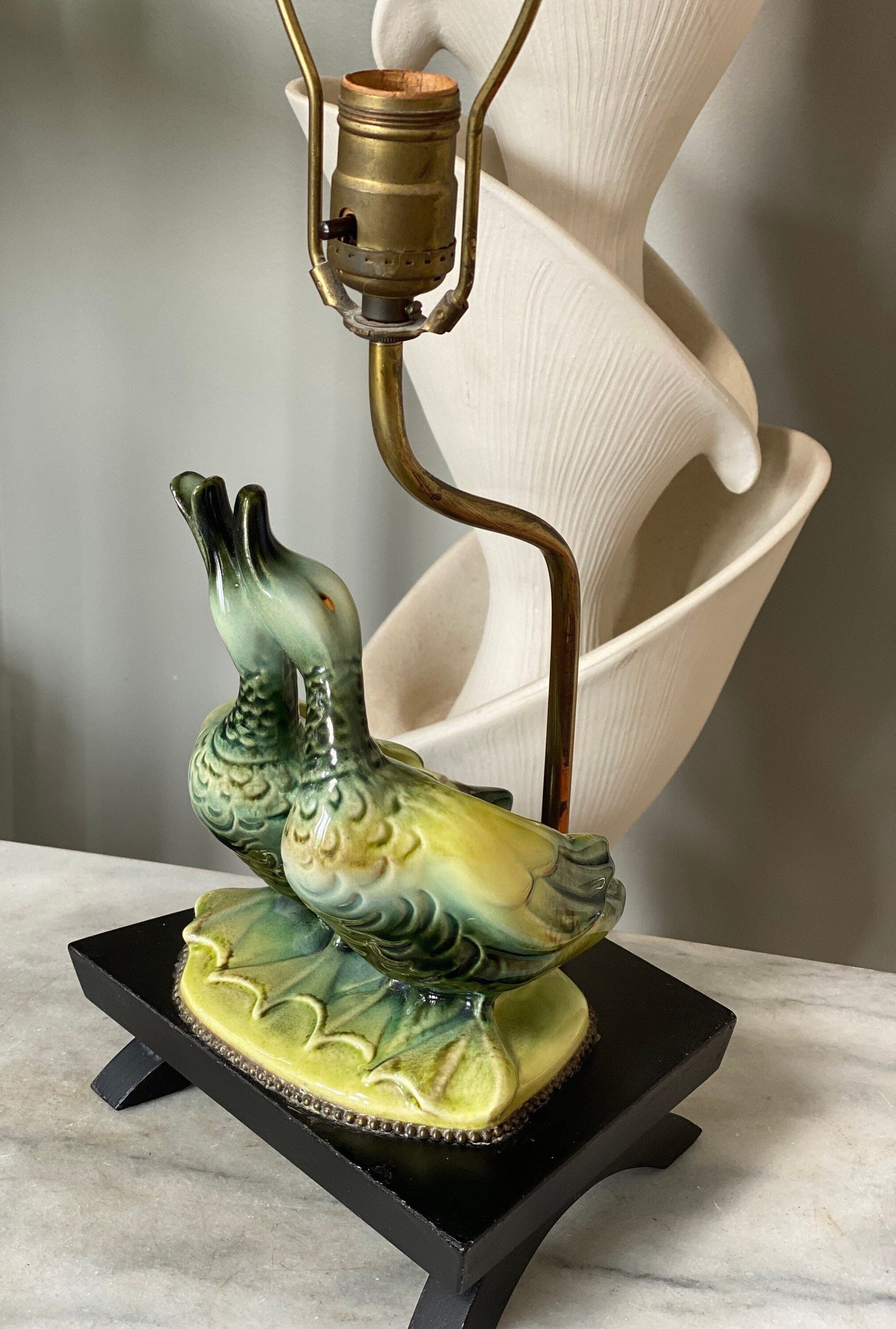 A gorgeous and unique mid century Hull Pottery Asian Ducks planter/lamp and shade from the 1950s.Features two green and yellow Asian ducks with majolica glaze. The ducks are planters and are set upon a black wooden base.The lamp “arm” and finial is gold toned metal. Lamp measures:20.25” to top of finial