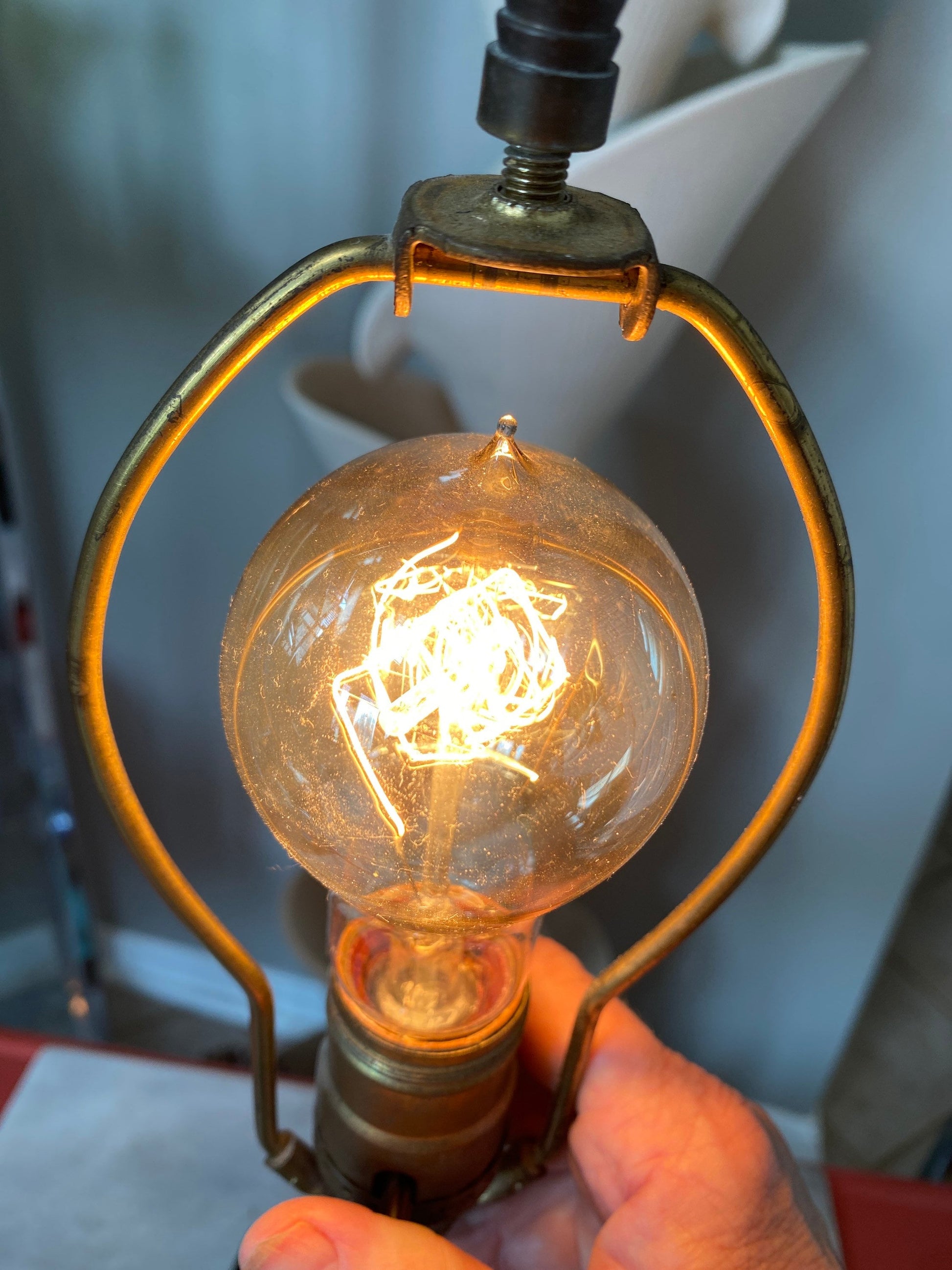 14” to top of socket 8” wide at base 6”deepLamp has been tested and works.Lamp is in overall good vintage condition. There are some minor signs of wear to the paint on the wood base.Displays beautifully. Please note, will be disassembled prior to shipping to avoid it being broken in transit.A wonderful addition to your mid century decor.