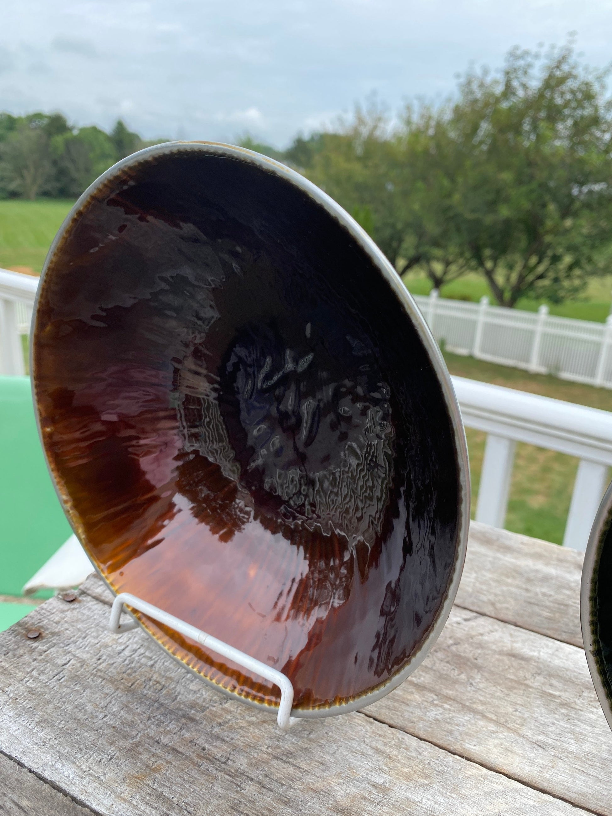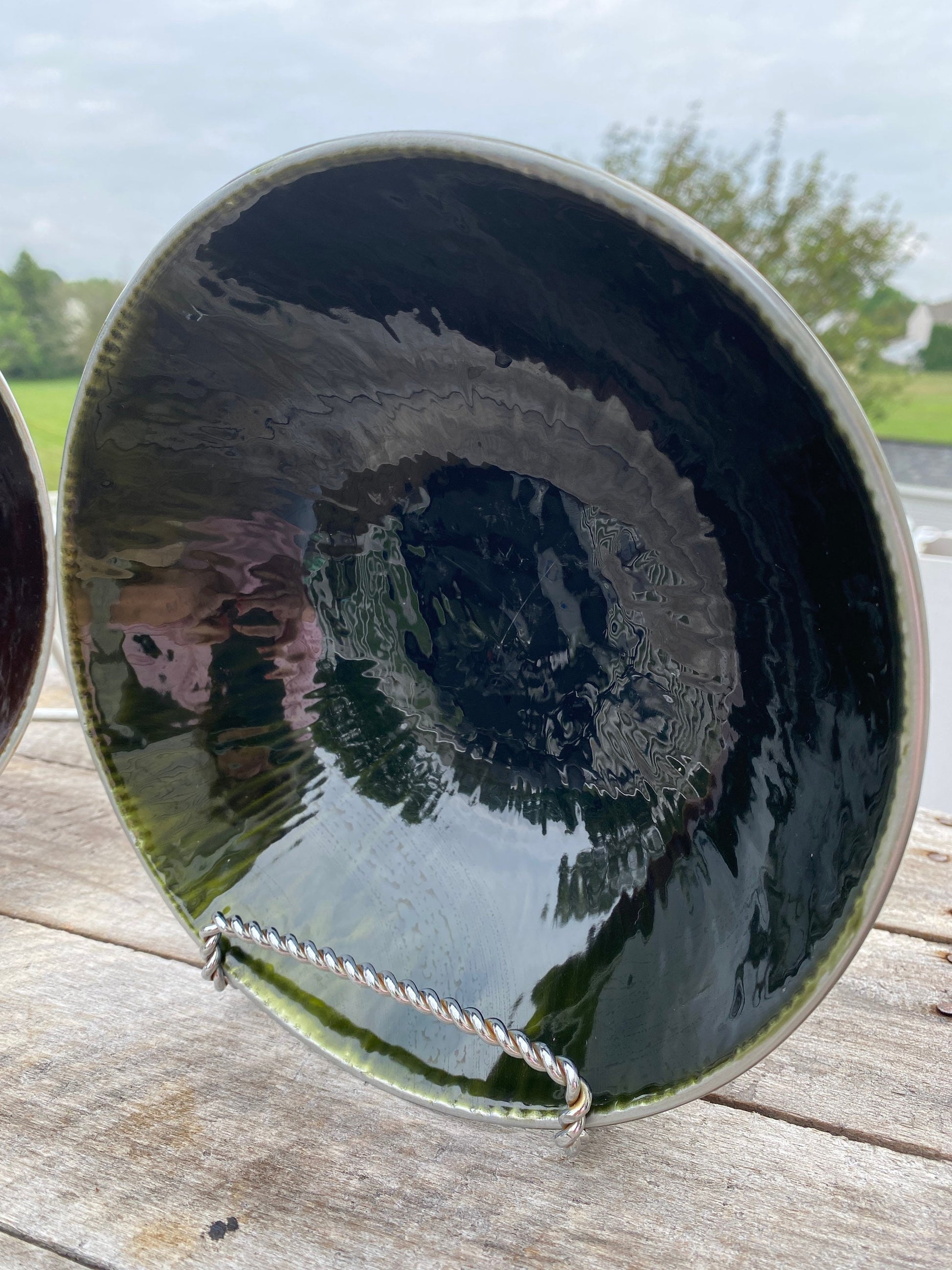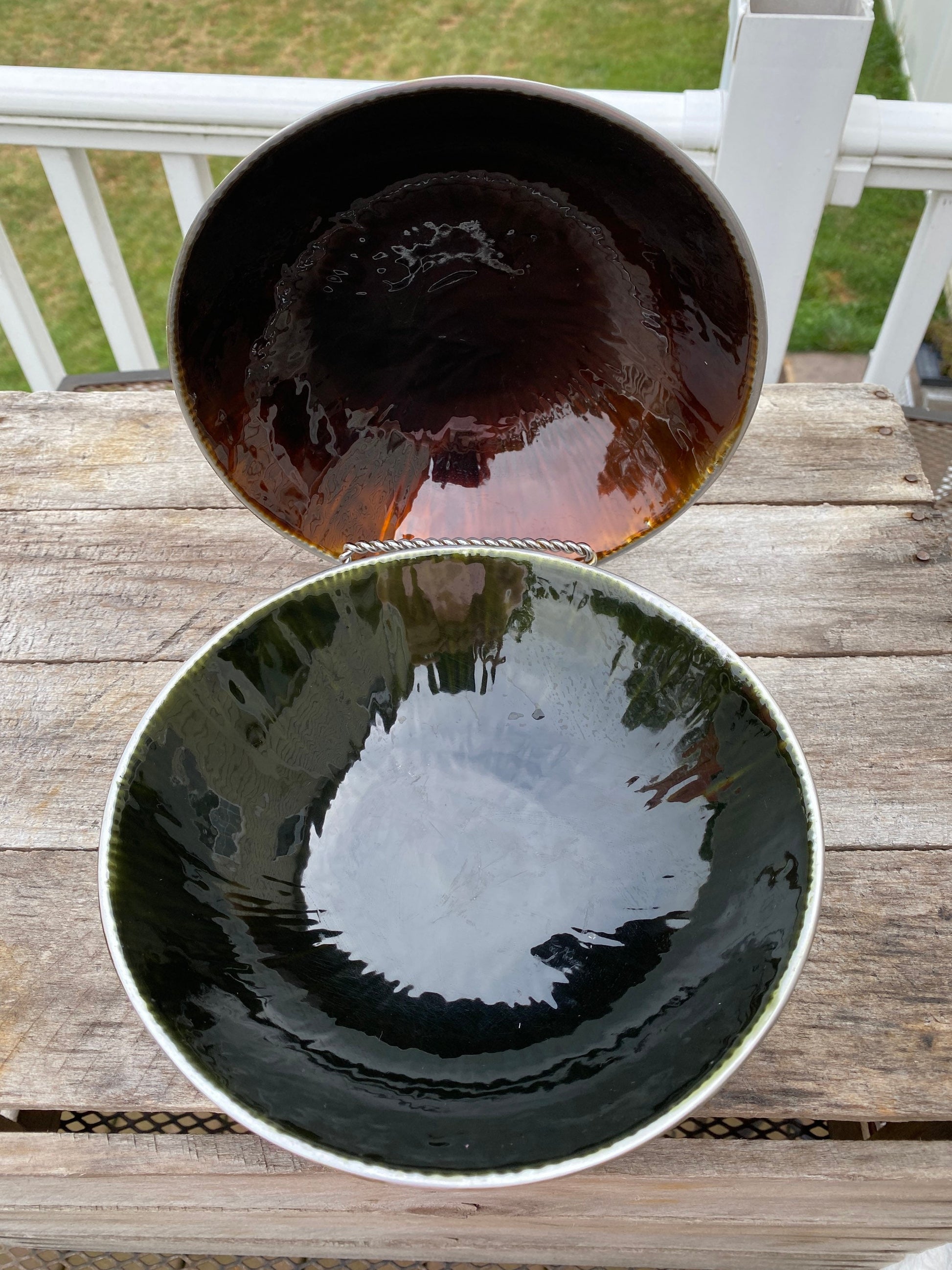 A pair of two mid century modern pewter bowls lined with ore descent porcelain. The interiorporcelain in the bowls are green and a copper brown tone and both have iridescent shine.Each pewter bowl Measures 7.75” . 2.25”A great set to display with your mid century modern decor. In very good vintage condition with no chips cracks or crazing. Shines brilliantly in the light.Please check out our other listings for more mid century modern decor as well as our other unique vintage items.