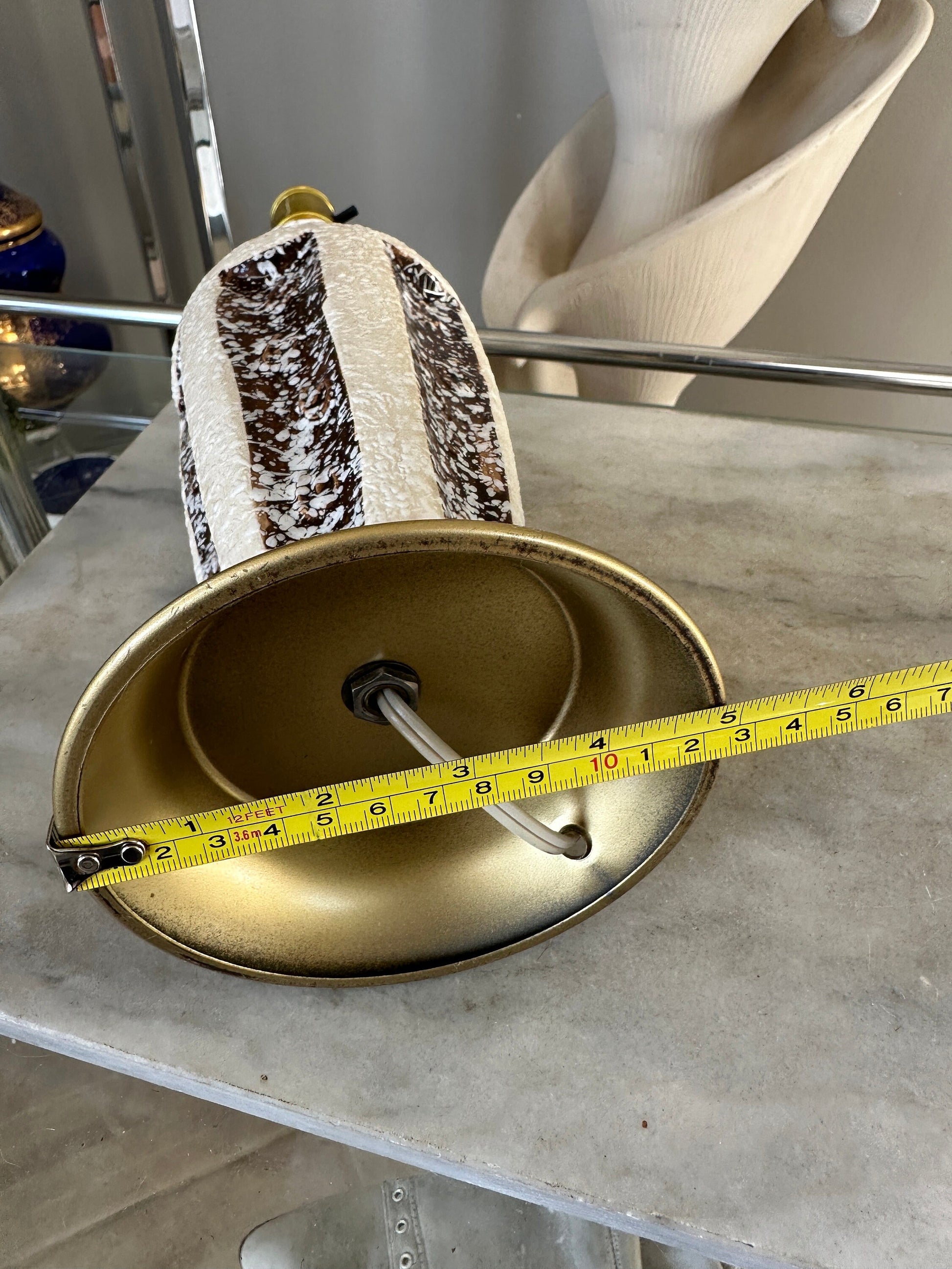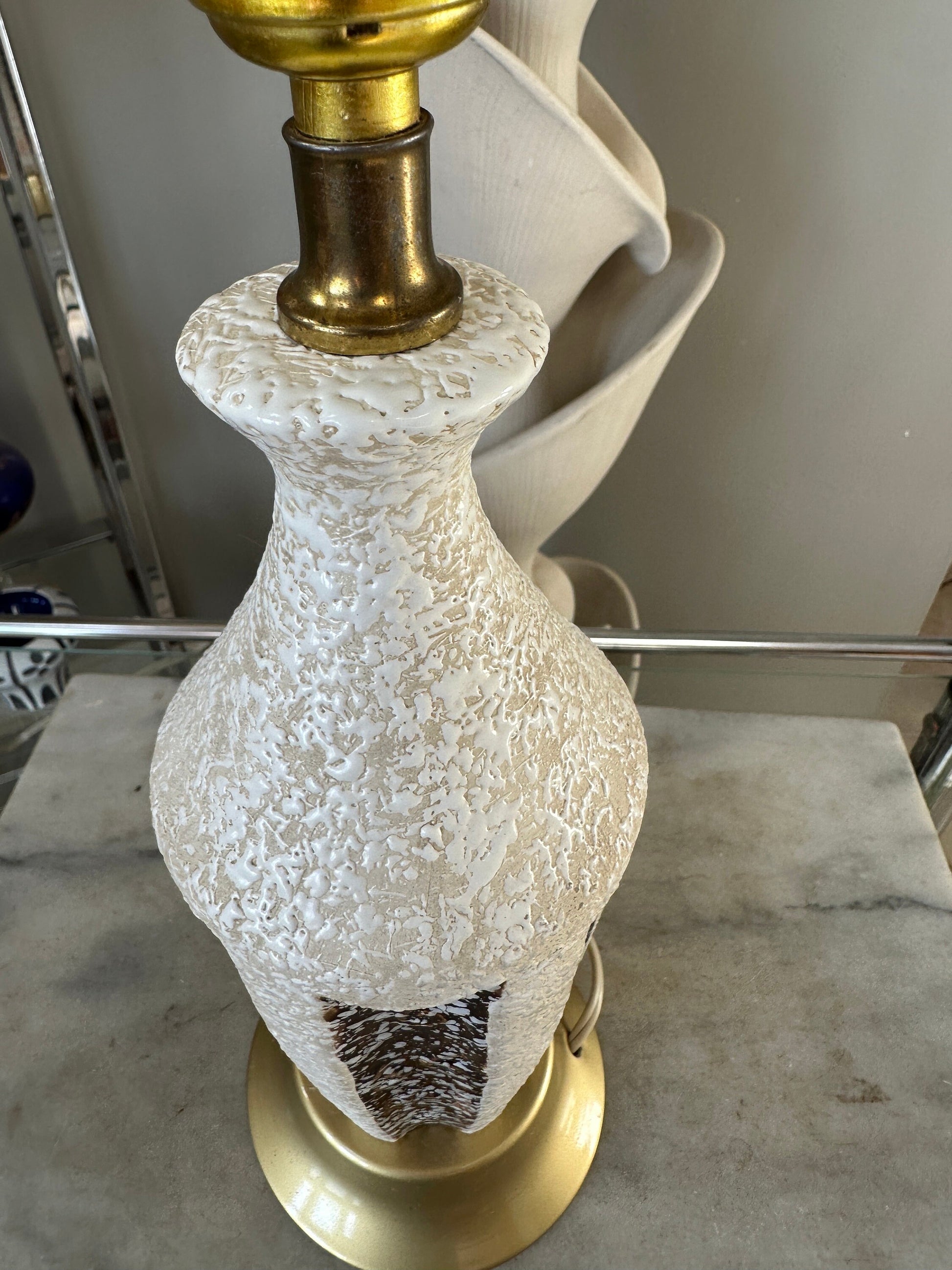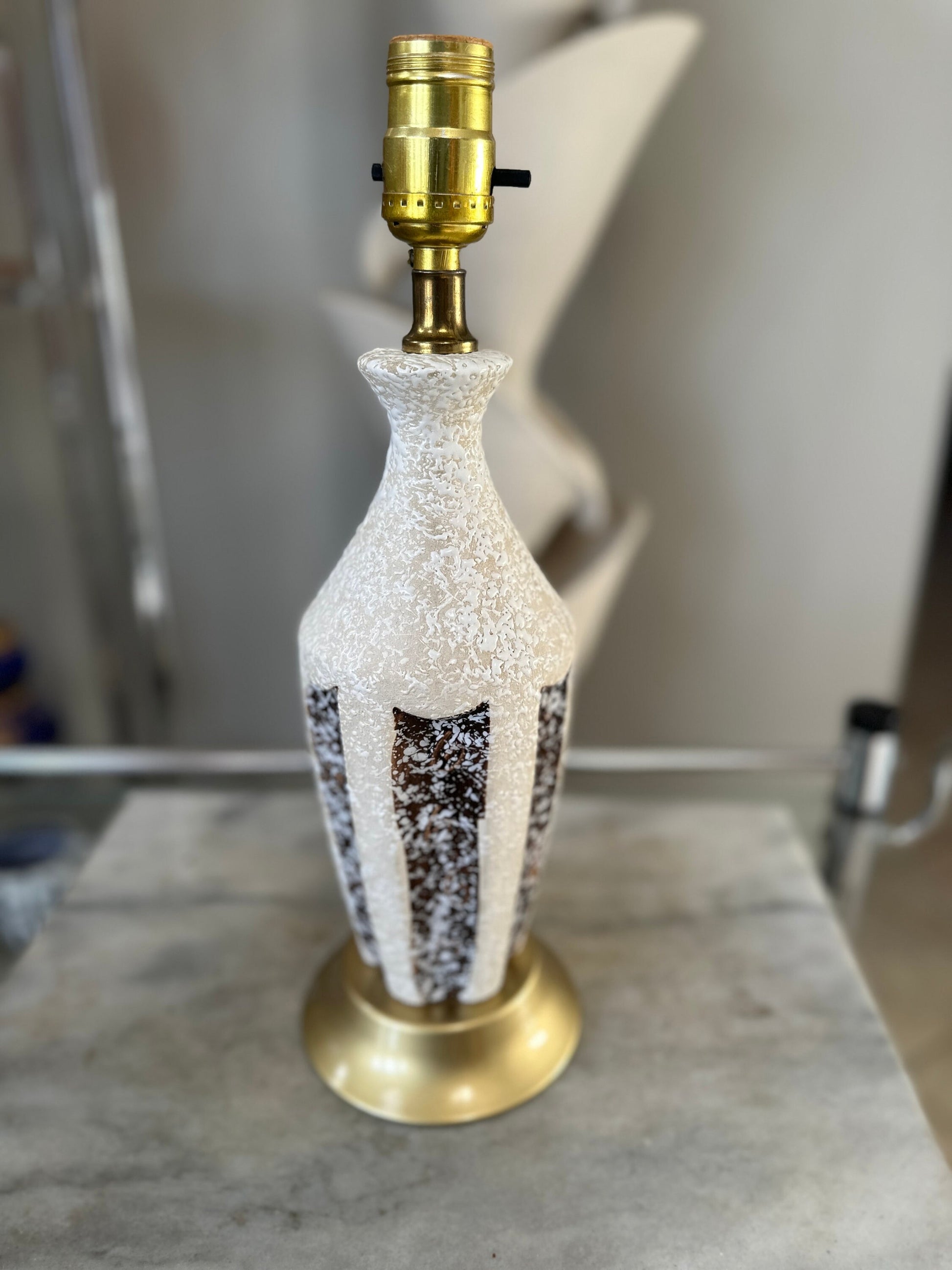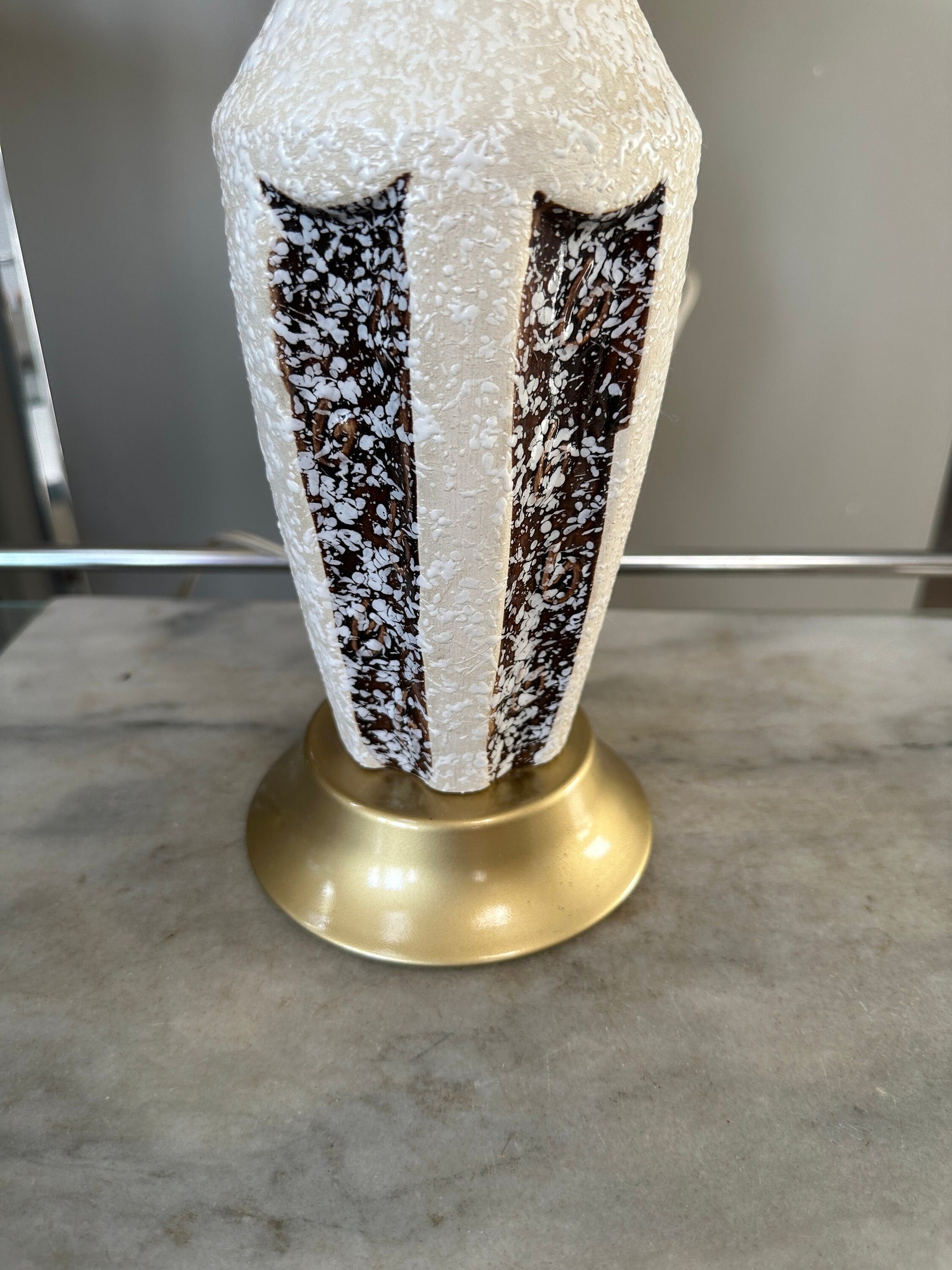 Mid Century Atomic Table Lamp Brown and White Textured Chalkware Plaster MCM Vintage Original Stunning, iconic, mid century modern lamp that features a textured plaster lamp body with paneled design of white and brown.Original anti-scratch fabric on underside of baseLamp is in very good vintage conditionThere are a couple of very small spots of color lossLamp stands almost 15” tall from foot to socket and measures 5” diameter at baseOriginal wiring is in good working order but should be replaced to ensure safety Vintage 1960s.Listing is for only the lamp. Shade is not included.A wonderful addition to your mid century modern decor.