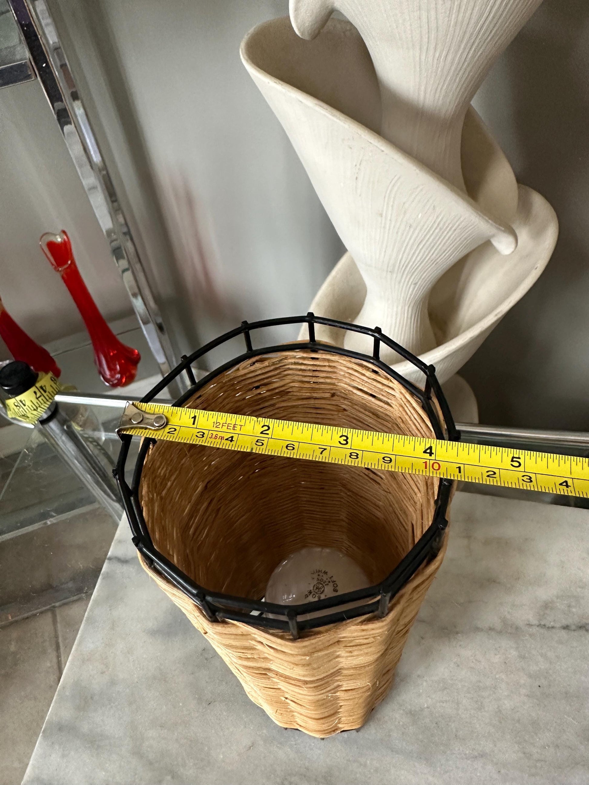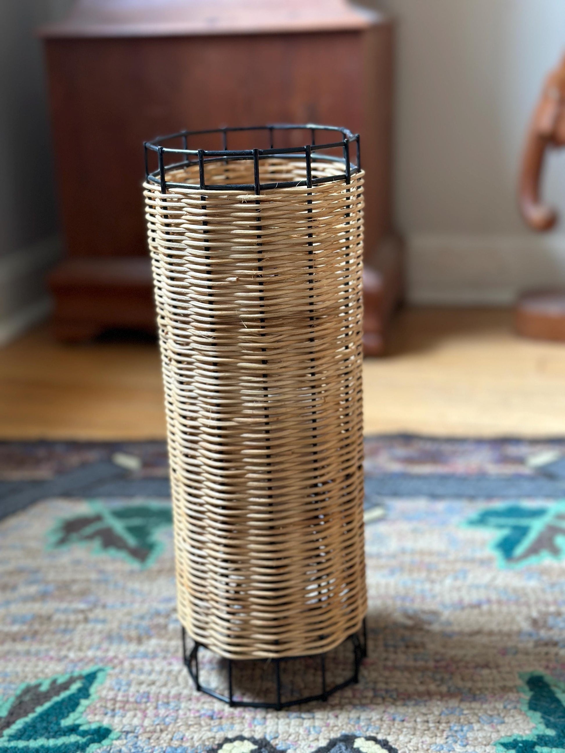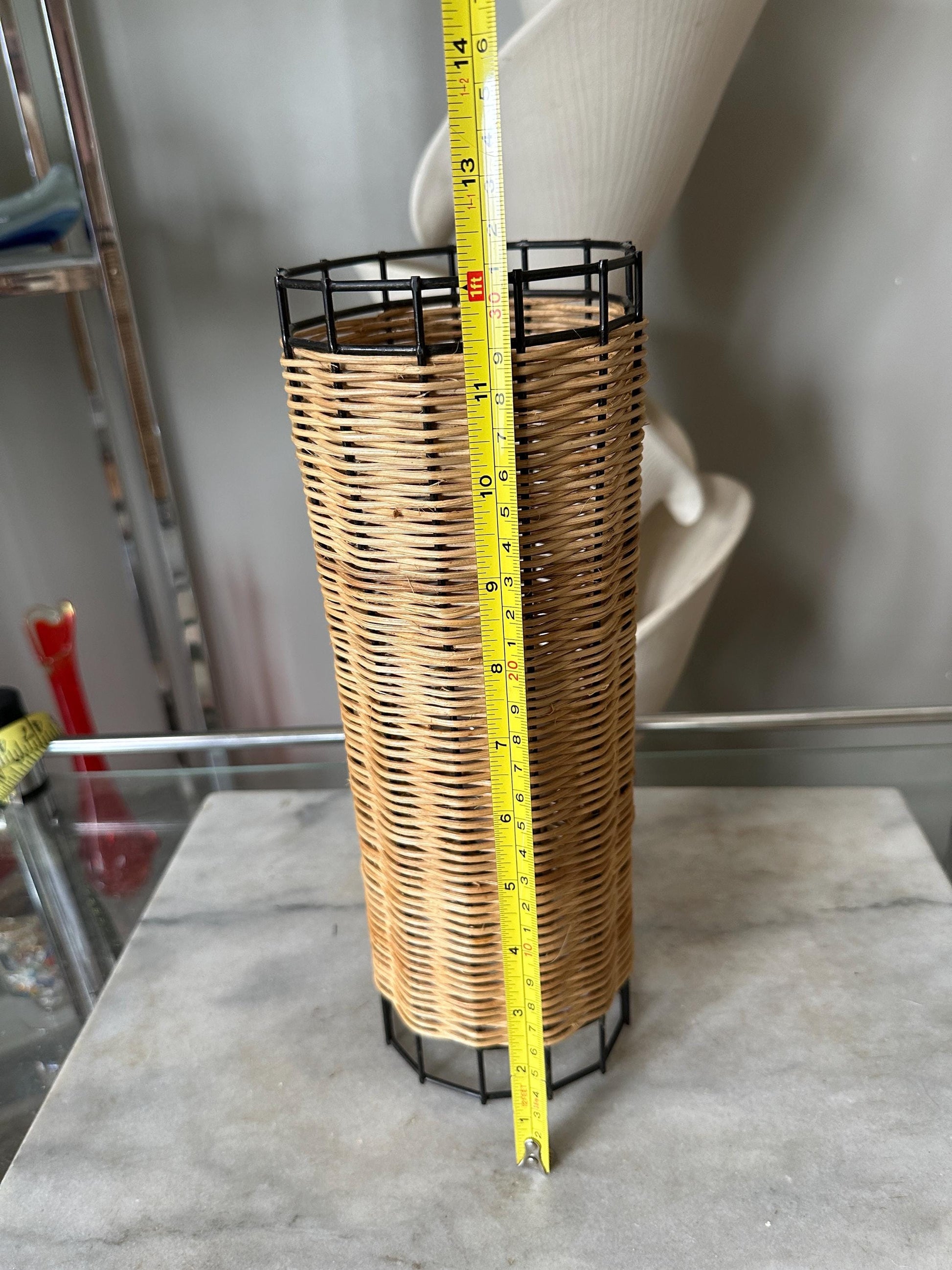 • Attributed to Paul Mayen for Habitat (unmarked) • Black powder-coated metal wire frame • Handwoven rattan cylindrical shade • Warm, ambient light diffusion • Tested and in excellent working condition • Ideal for use as a side table lamp, accent light, or statement decorDimensions: • Height: 12” • Diameter: 4.25”Condition:Very good vintage condition with minimal signs of wear consistent with age. No breaks or unraveling in rattan. Wiring is functional and safe for use.Pair with minimalist decor, teak furniture, or boho-inspired accents to enhance its midcentury-meets-natural charm.