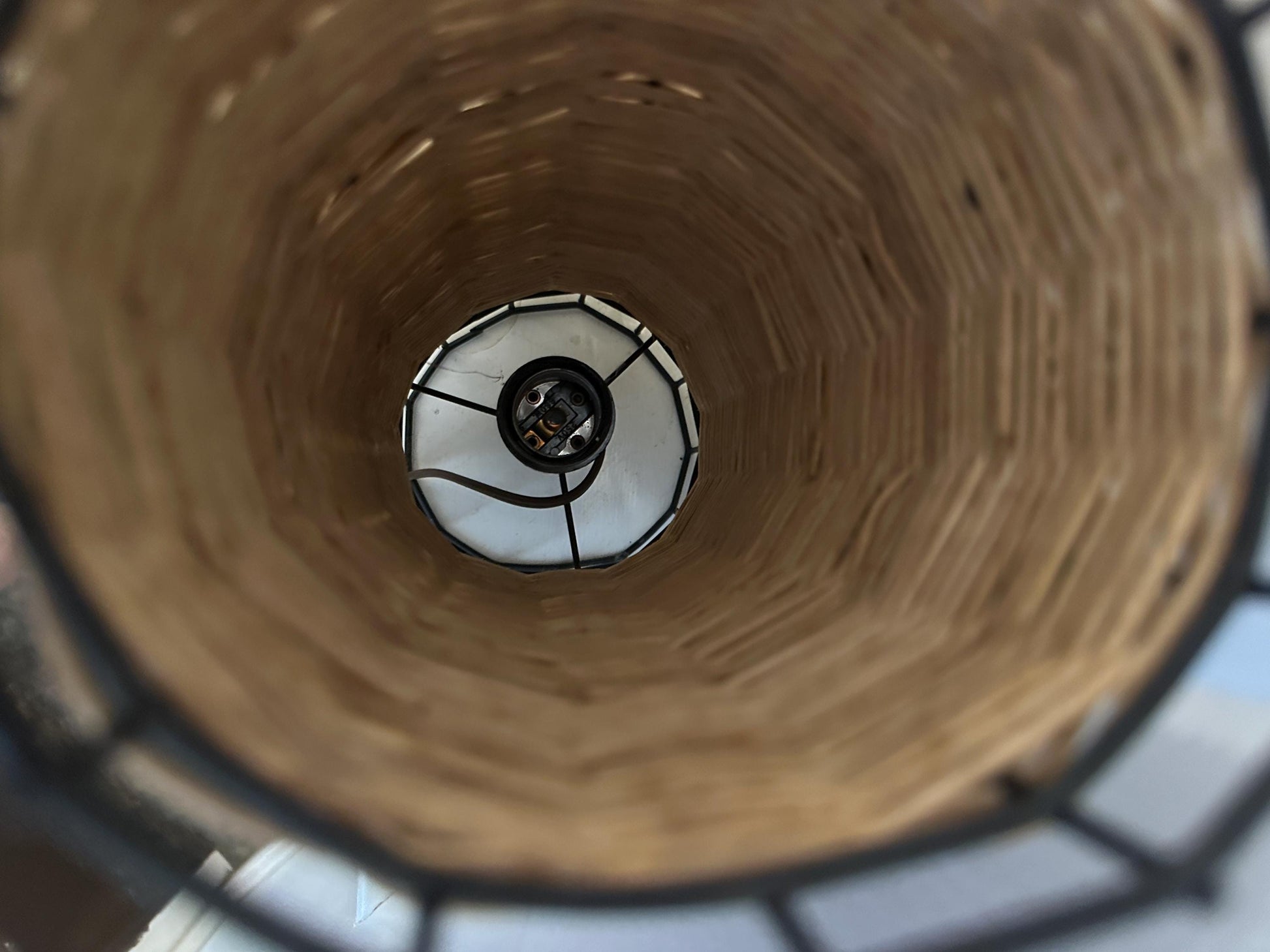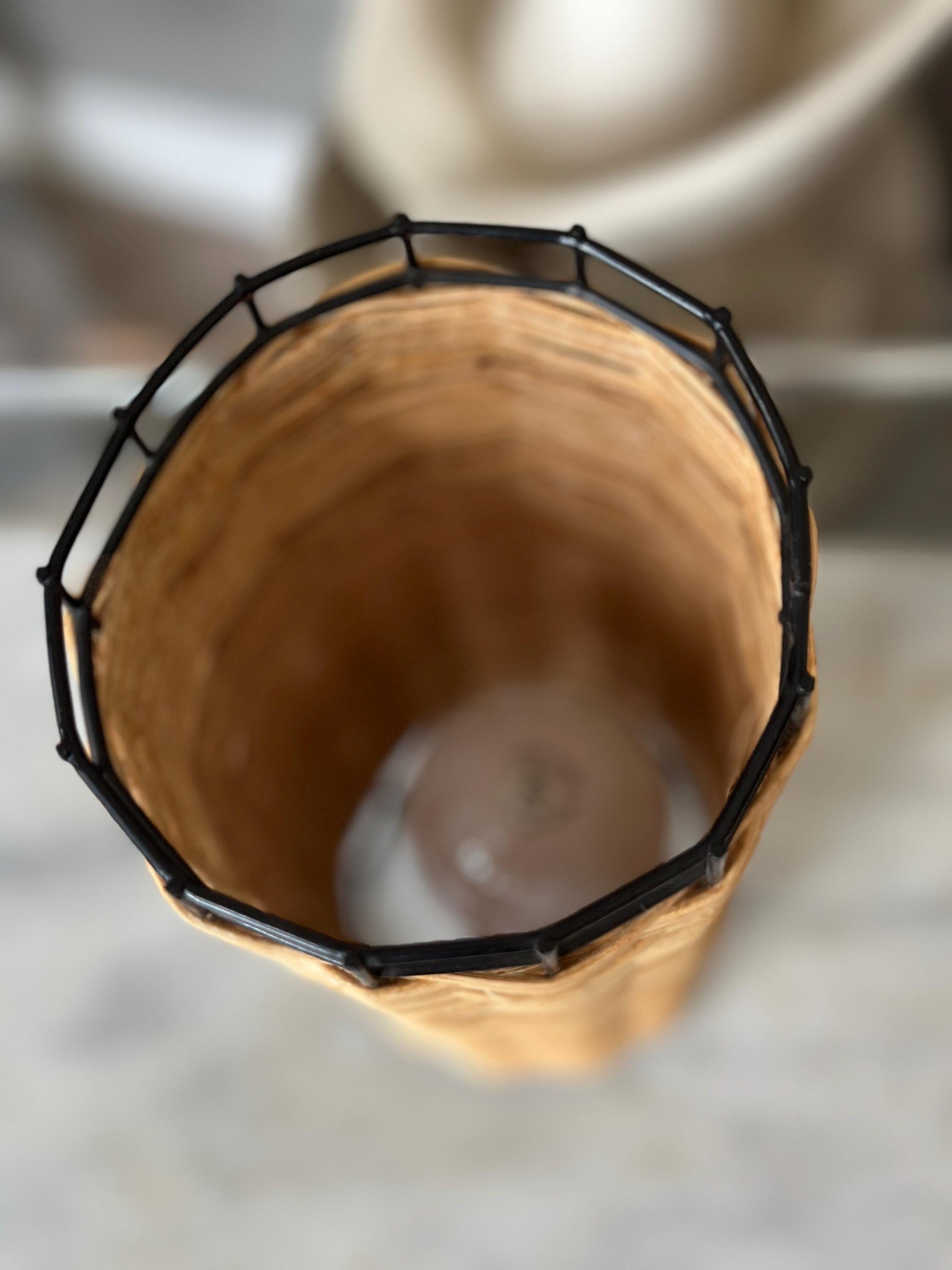 Midcentury Paul Mayen Habitat Style Black Wire & Woven Rattan Table Lamp | 1960s Vintage LightingAdd a striking touch of midcentury elegance to your home with this Paul Mayen-style wire and rattan table lamp, circa 1960s. A perfect blend of industrial form and organic warmth, this piece features a black powder-coated wire frame and a hand-woven natural rattan shade—classic hallmarks of the Habitat design aesthetic.Key Features:• Authentic midcentury modern style