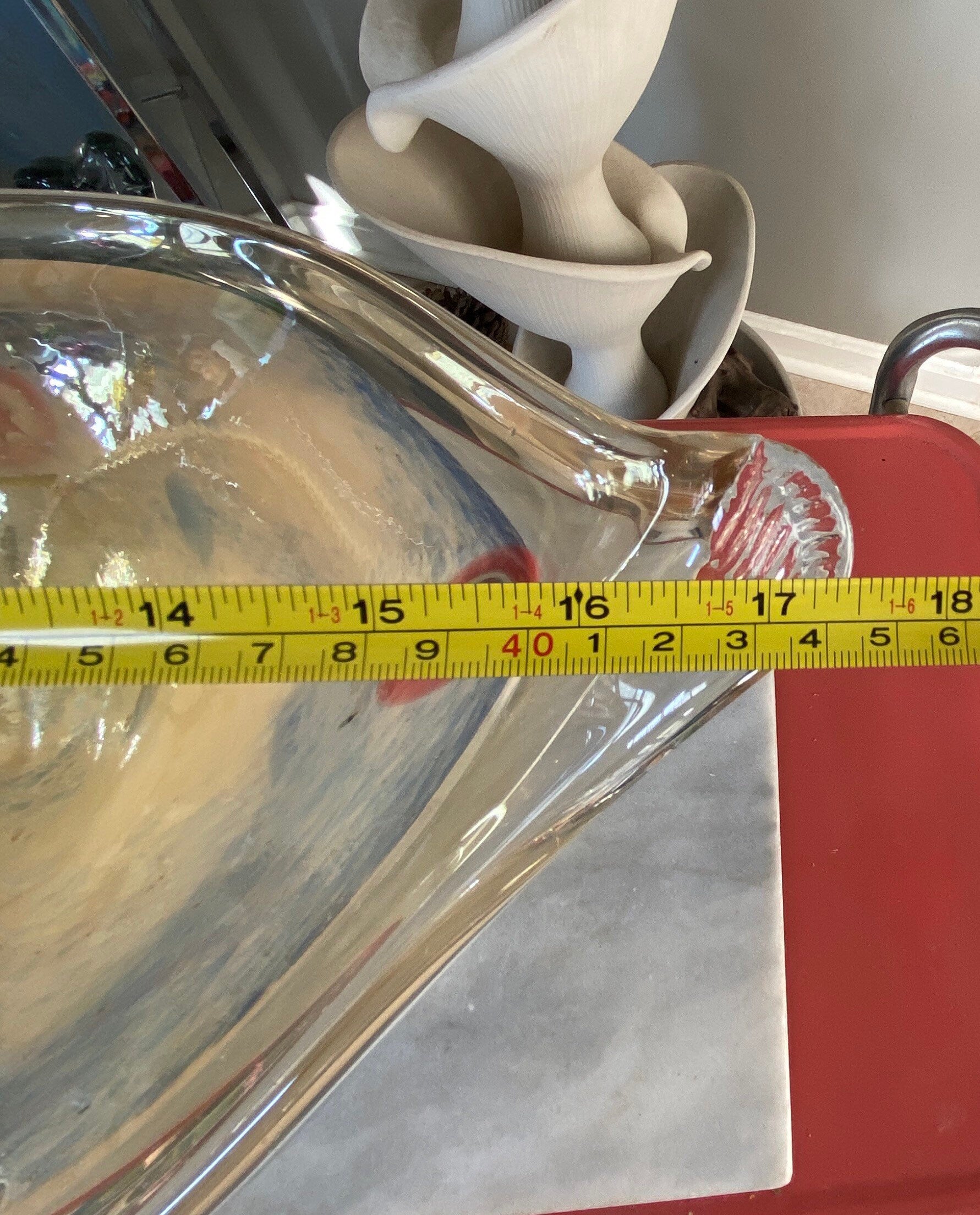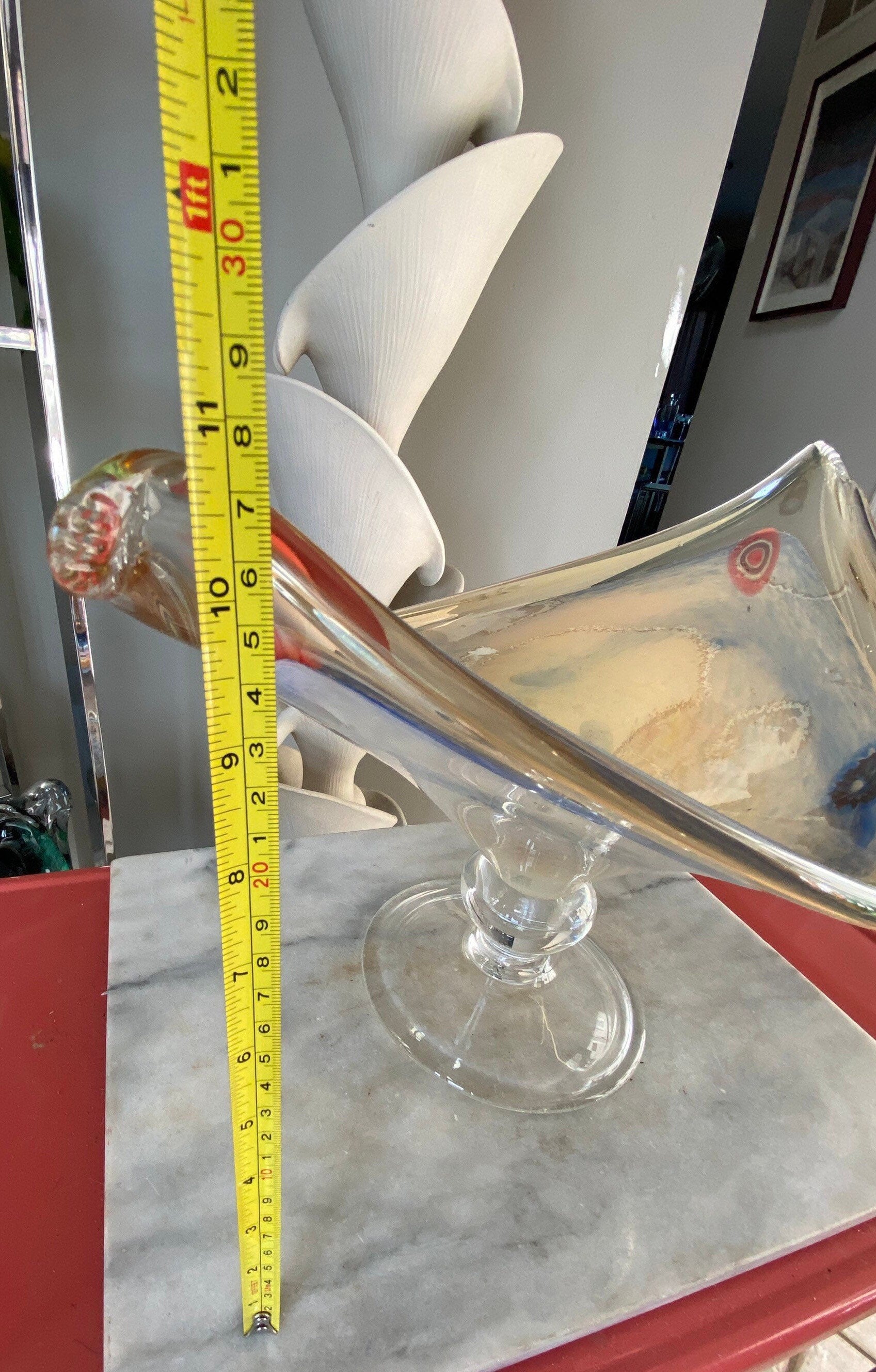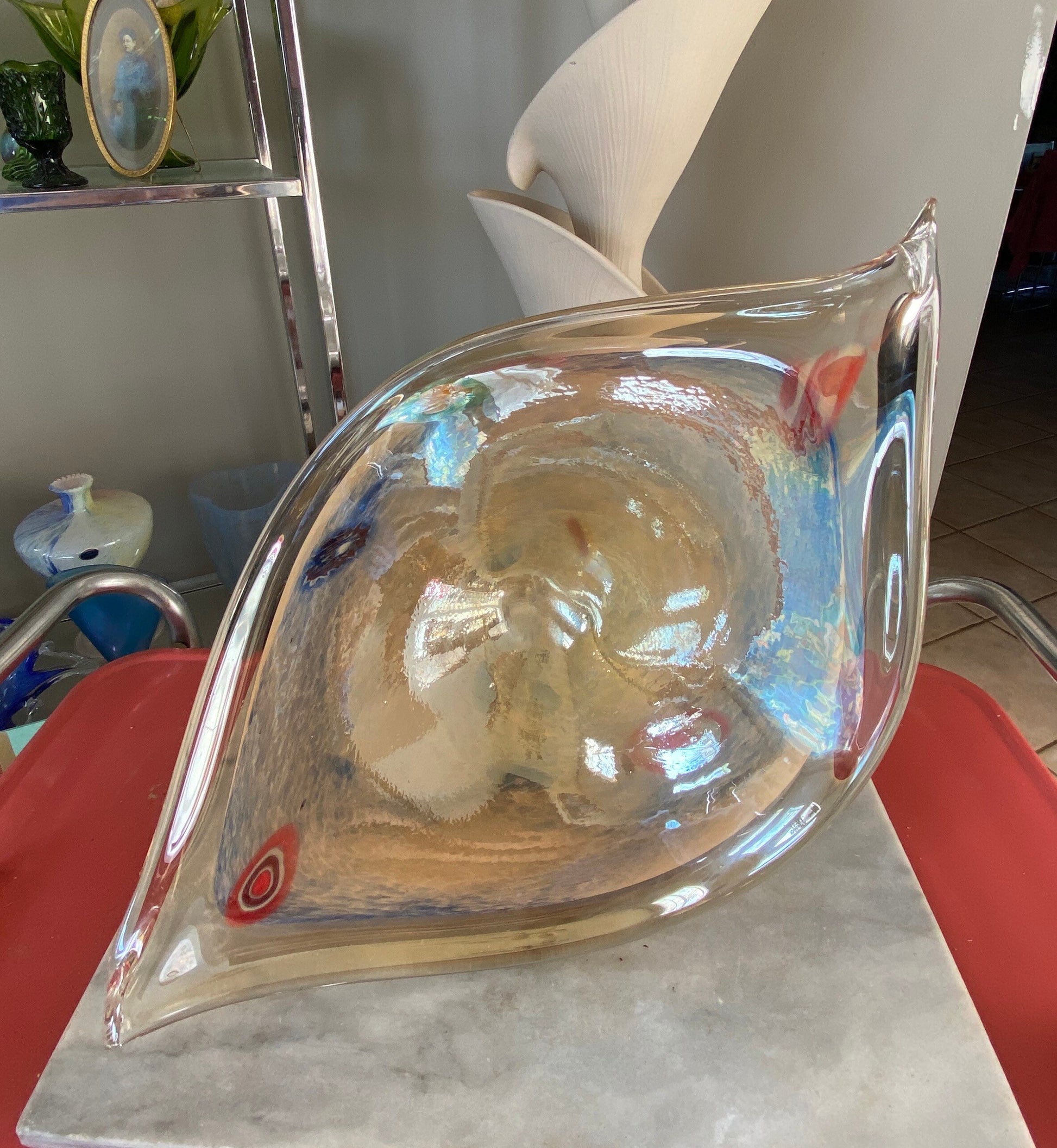 Absolutely stunning 1950’s or 60’s made in the Murano style - fancy large art glass bowl hand blown in clear with with a luster finish and gold and blue coloration in the center.This was acquired at an estate auction in York, PA from an avid Murano glass collector. Although this piece does not have the original Murano sticker, we believ that it os authentic.Abstract millefiore accents in orange, purple, yello and red. Interesting and unique.Would be a fantastic centerpiece bowl - a great conversation piece. Abstract oval design - measuring 17” x 22” x 11”A wonderful addition to an art glass collection. Perfect for your mid century modern decor.