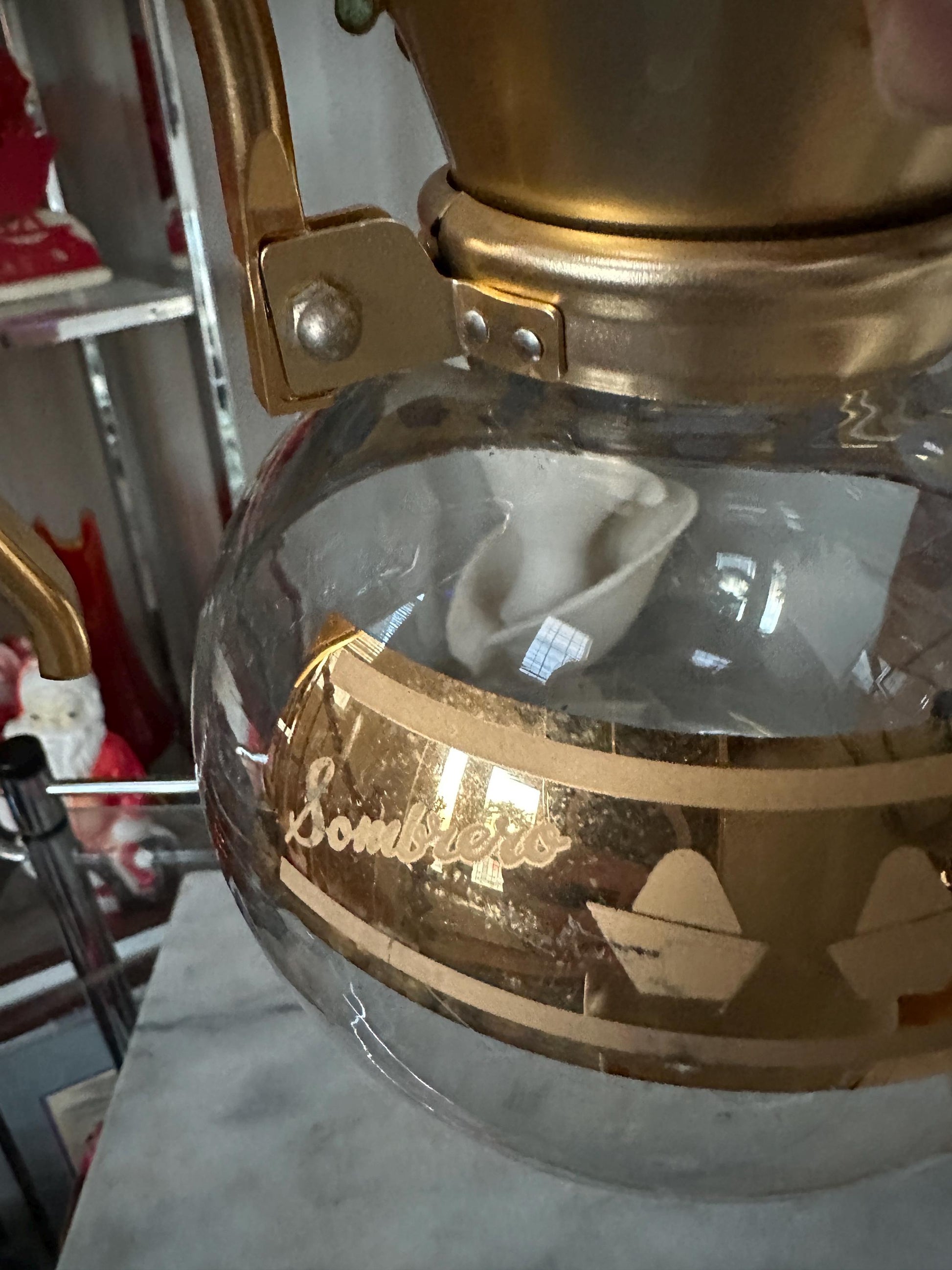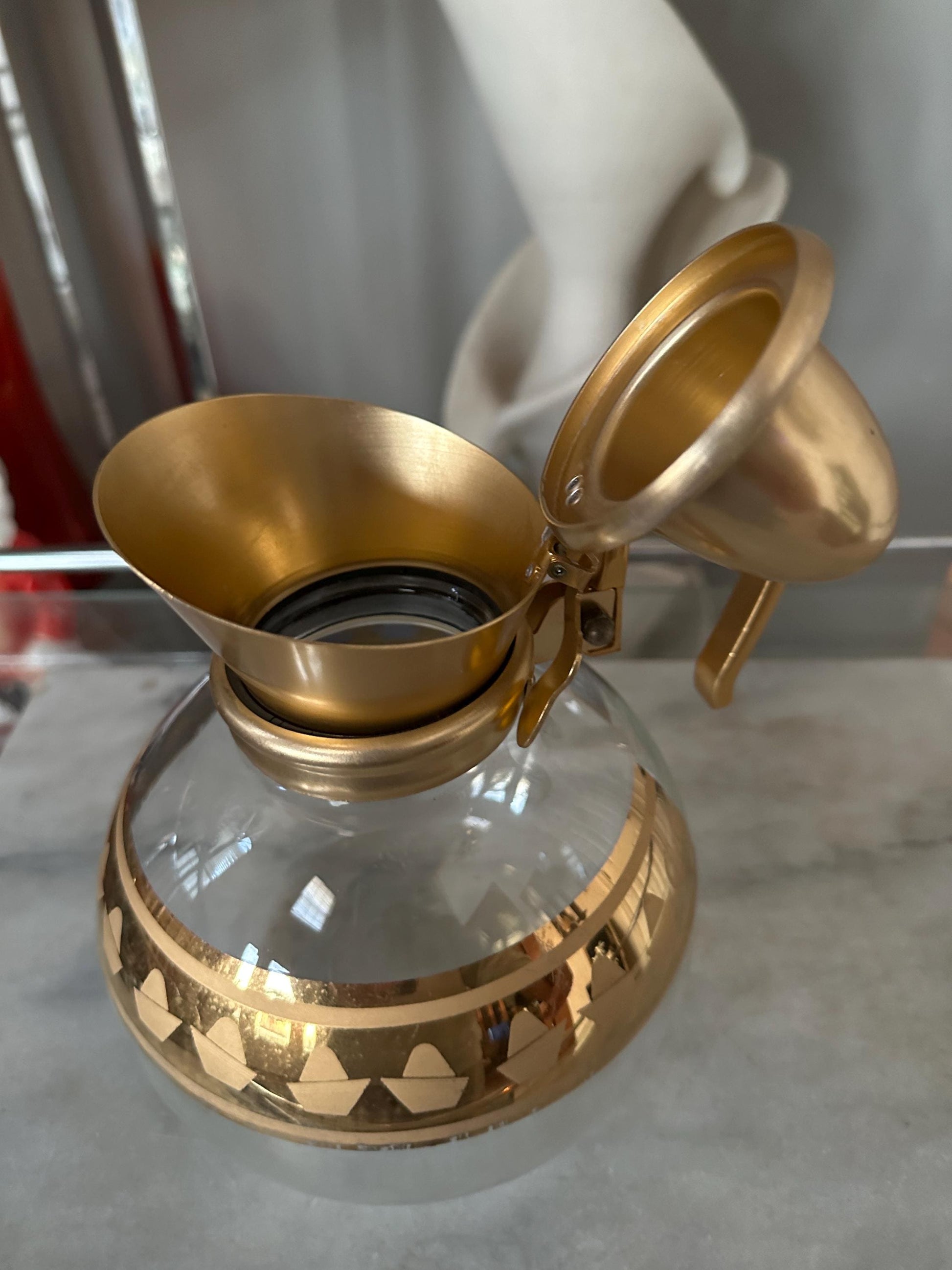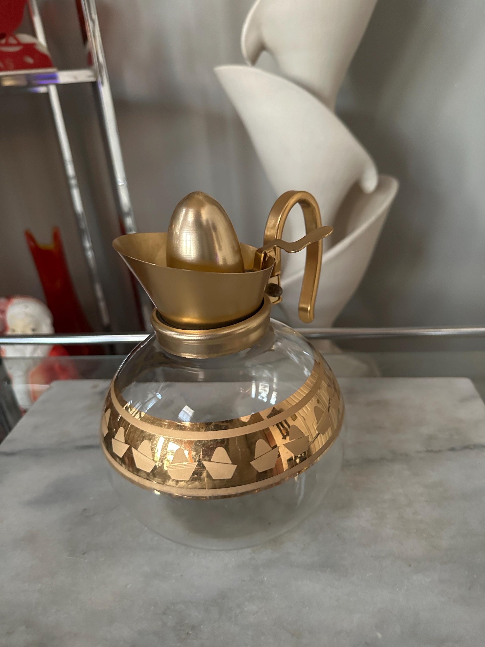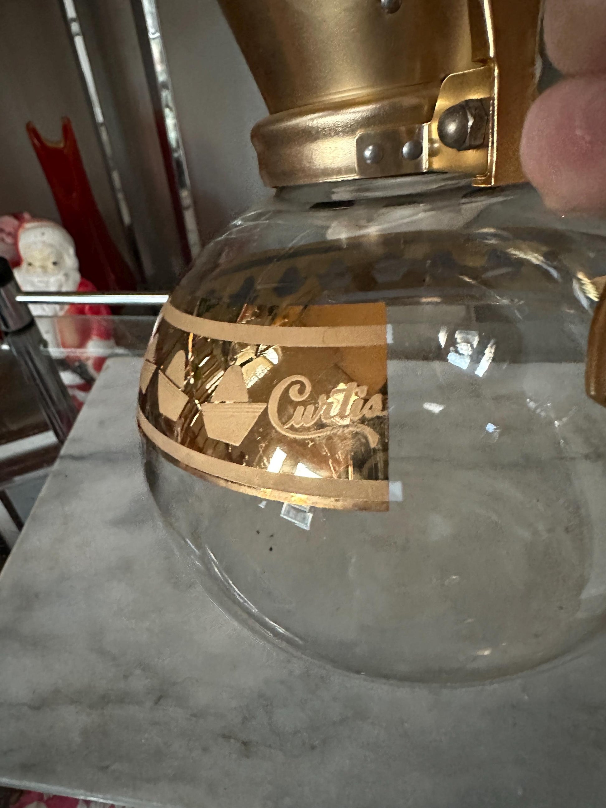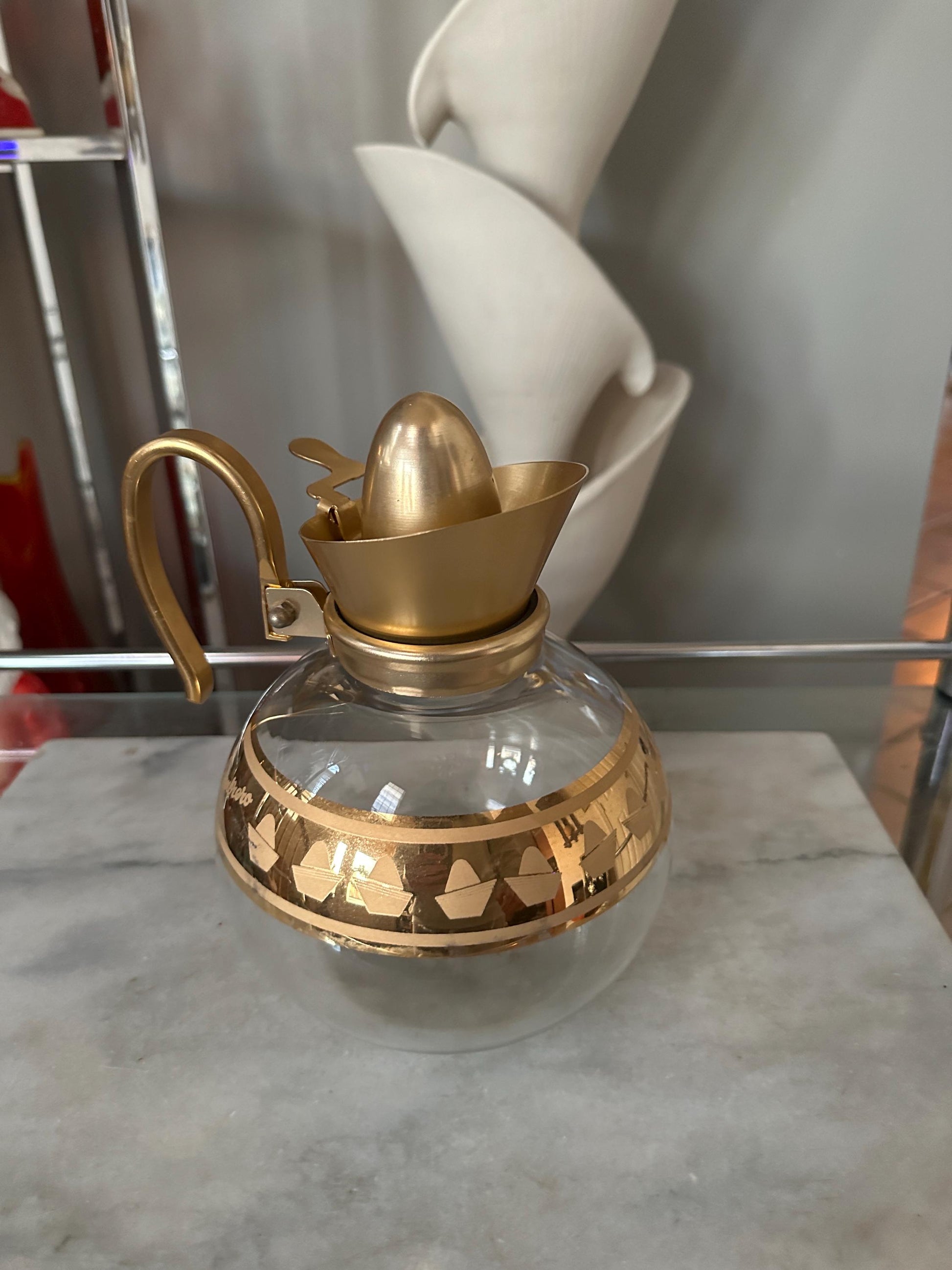 A fun and interesting MCM Curtis Sombrero coffee carafe from the 1950s/60s.Features a clear glass coffee carafe with gold gild graphics of sombreros all around. The gold toned metal lid is designed to look like a sombrero as well. Measures approximately 8” tall x 6.5” across.In good vintage condition with some minor age related wear to the gold gild accents.A wonderful addition to your MCM or retro kitchen.