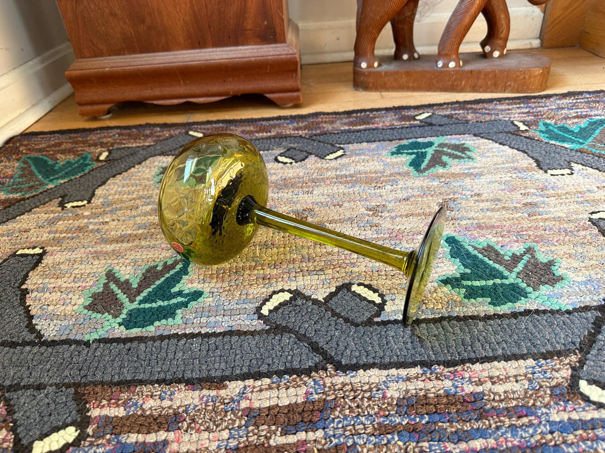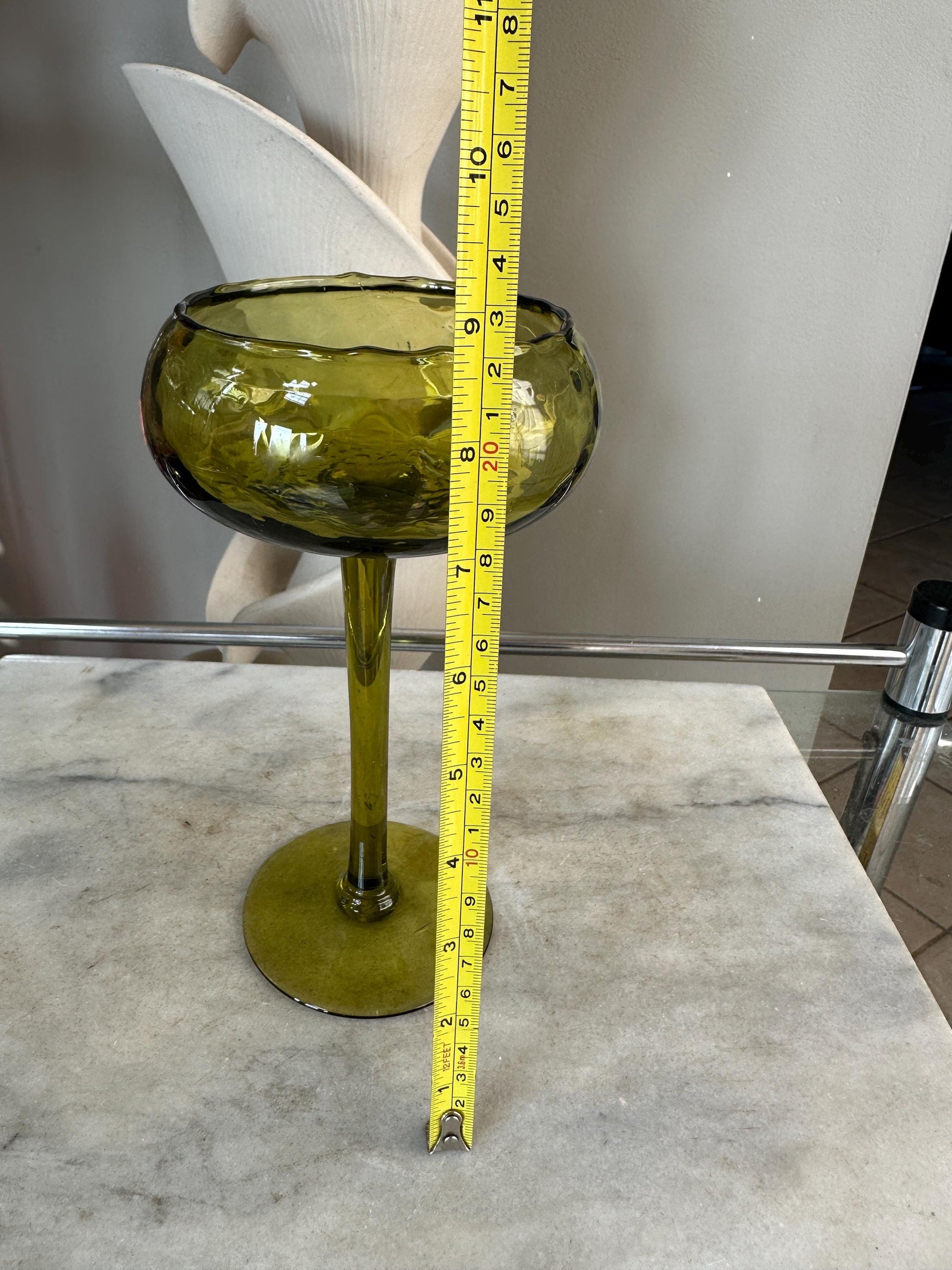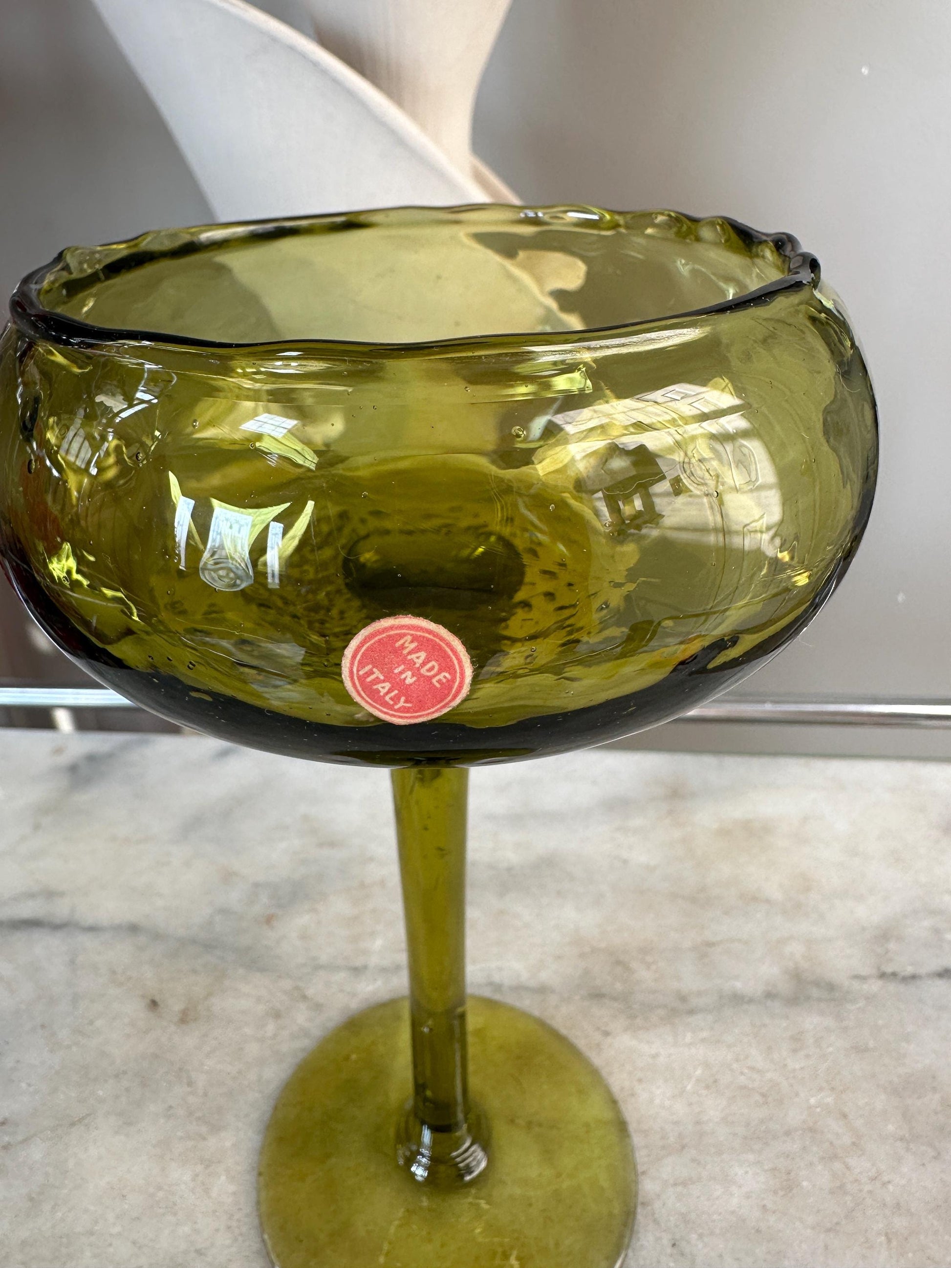 A gorgeous Green Optic Quilted Pair Compote from the 1960s.Features a sleek MCM style with an olive green Empoli glass with a diamond pattern as well as a pedestal bowl, long thin stem and round base.Made in Italy sticker is present.Measures 8 3/4" tall x 4 7/8 top diameter, 3 7/8" bottom diameter.In very good vintage condition with no chips or cracks.A wonderful addition to your mid century modern decor.