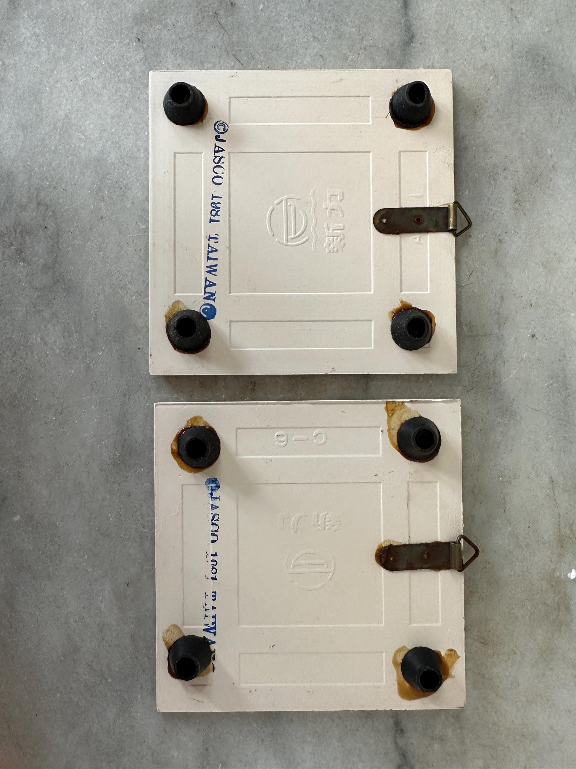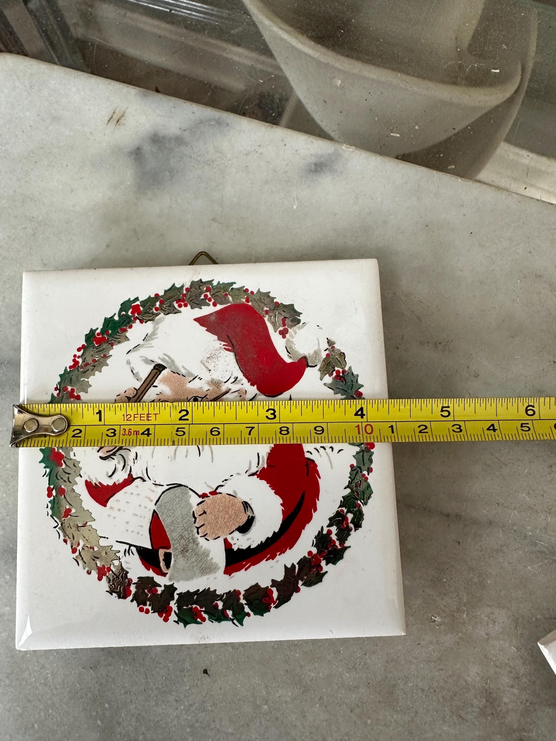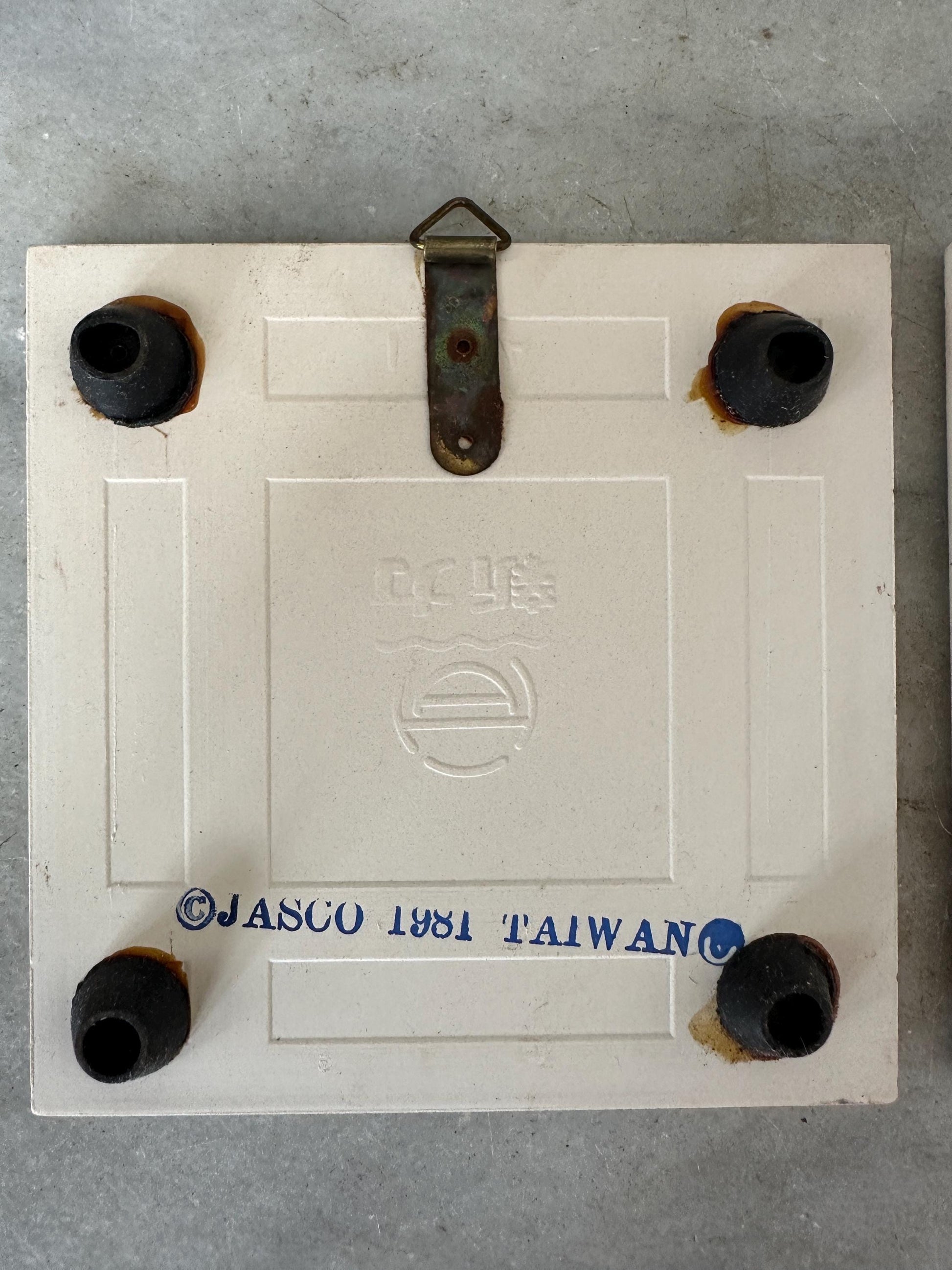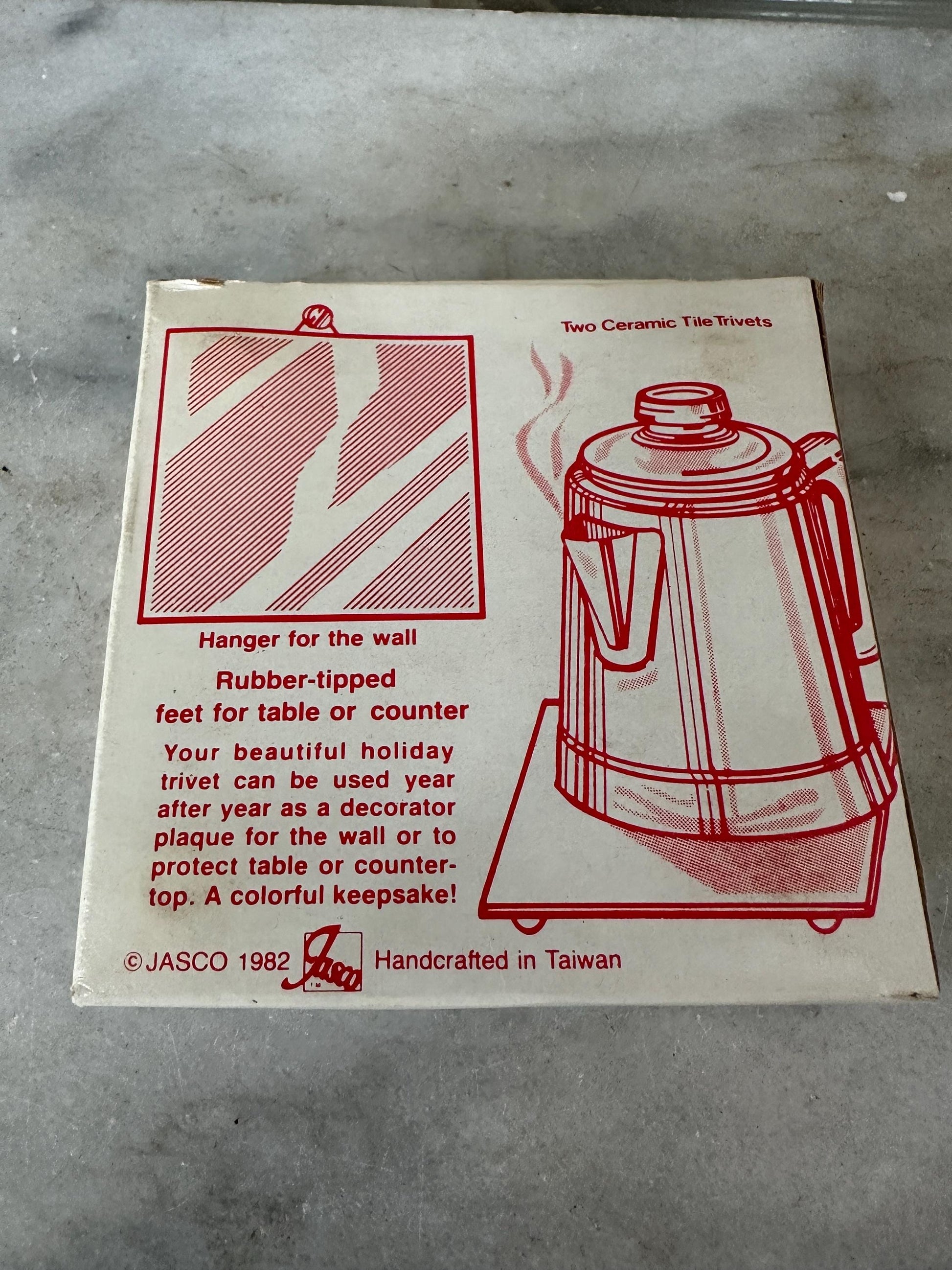 Pair of Vintage 1981 Jasco Sdanta Christmas Ceramic Tile Trivets - Set of 2 - In original box.Vintage 1981 Jasco Ceramic Tile Trivets (2) with Santa and his List in their Original Box.Each Measures Approximately 4.25 inches Long and 4.25 inches Wide. Set weighs about 8 oz.Trivets are in GOOD VINTAGE CONDITION with no signs of Wear except for one tiny chip as seen in the detailed photos which are an integral part of the description. Box is ripped and marked jn jnk at the top. Please see last photo.Perfect for your kitschy vintage decor.
