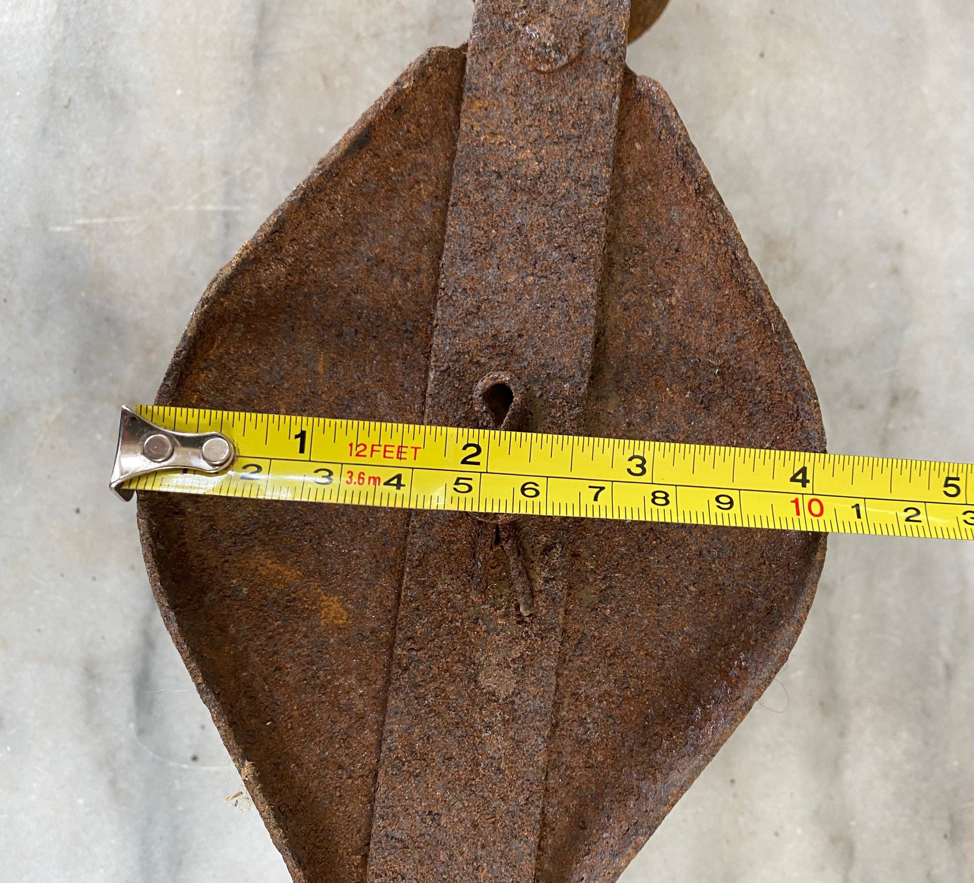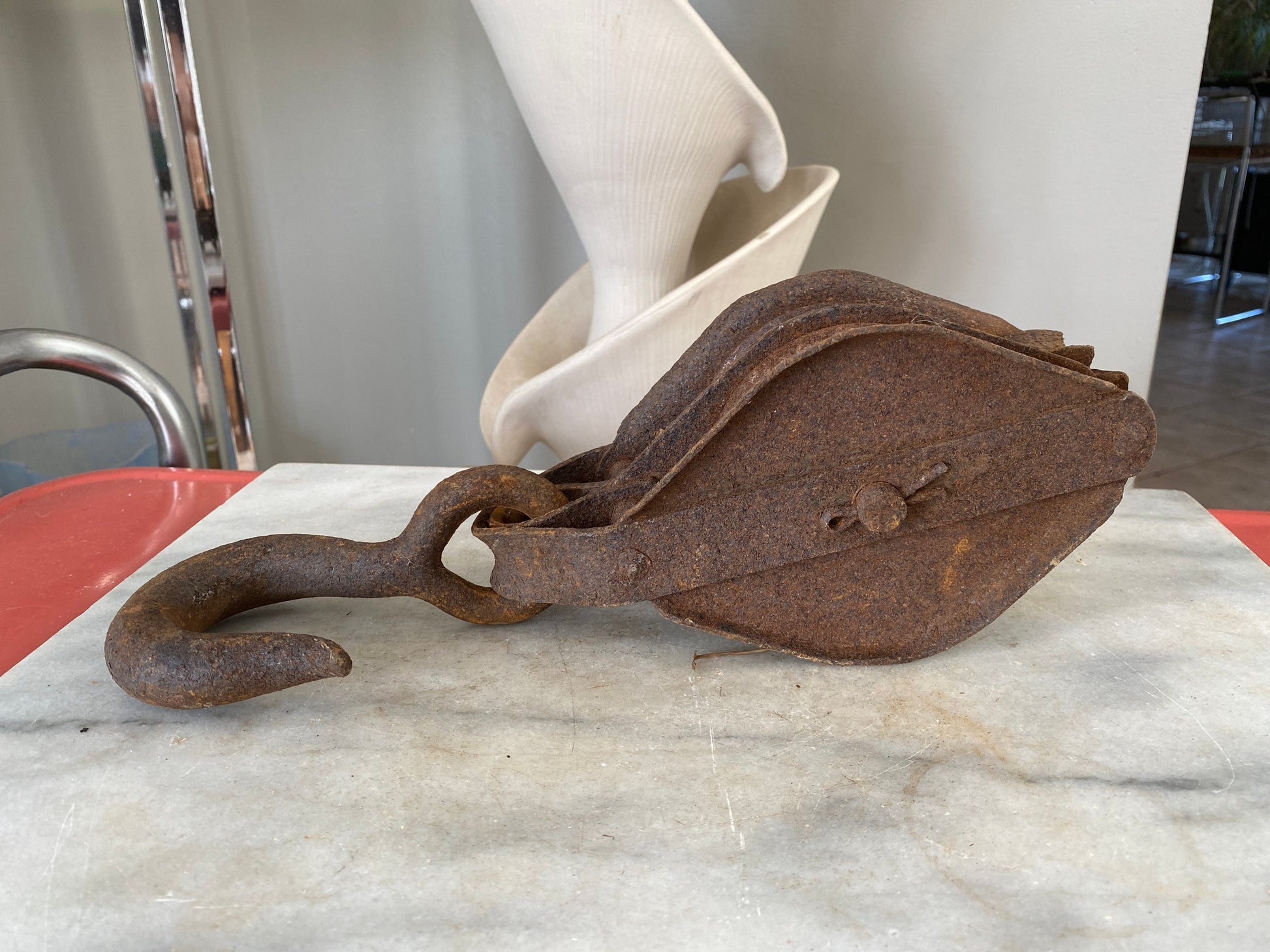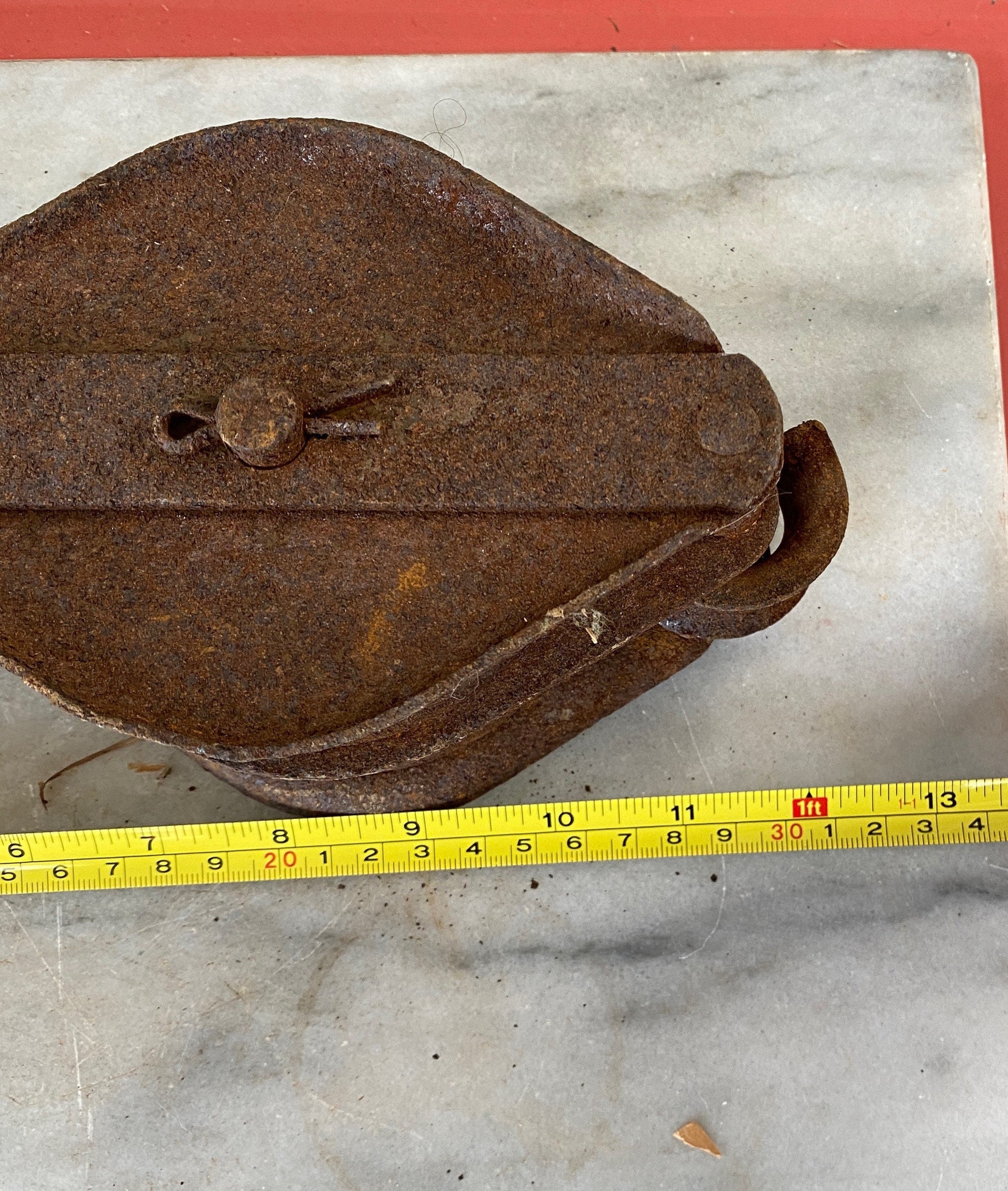 Unique and Interesting Primitive Cast Iron Barn Pulley with a Heavy Duty Hook for your Rustic Decor. This consists of a forged metal band that straps around from bottom to top to bottom that holds the Sheaves together and the hook and buckle in.This measures about 11.75” long, about 4” wide and 3.25” deep.Please see pictures for more details.In very good vintage display condition - this piece is sturdy and substantial. Please note that We have not cleaned it in any way to preserve the beautiful rustic, industrial appearance of this pulley.This pulley would be great used in steampunk objects, sculpture, assemblage or for their intended purpose as functional pulleys.Please check out our other listings for more rustic architectural and industrial pieces as well as our other unique vintage items.