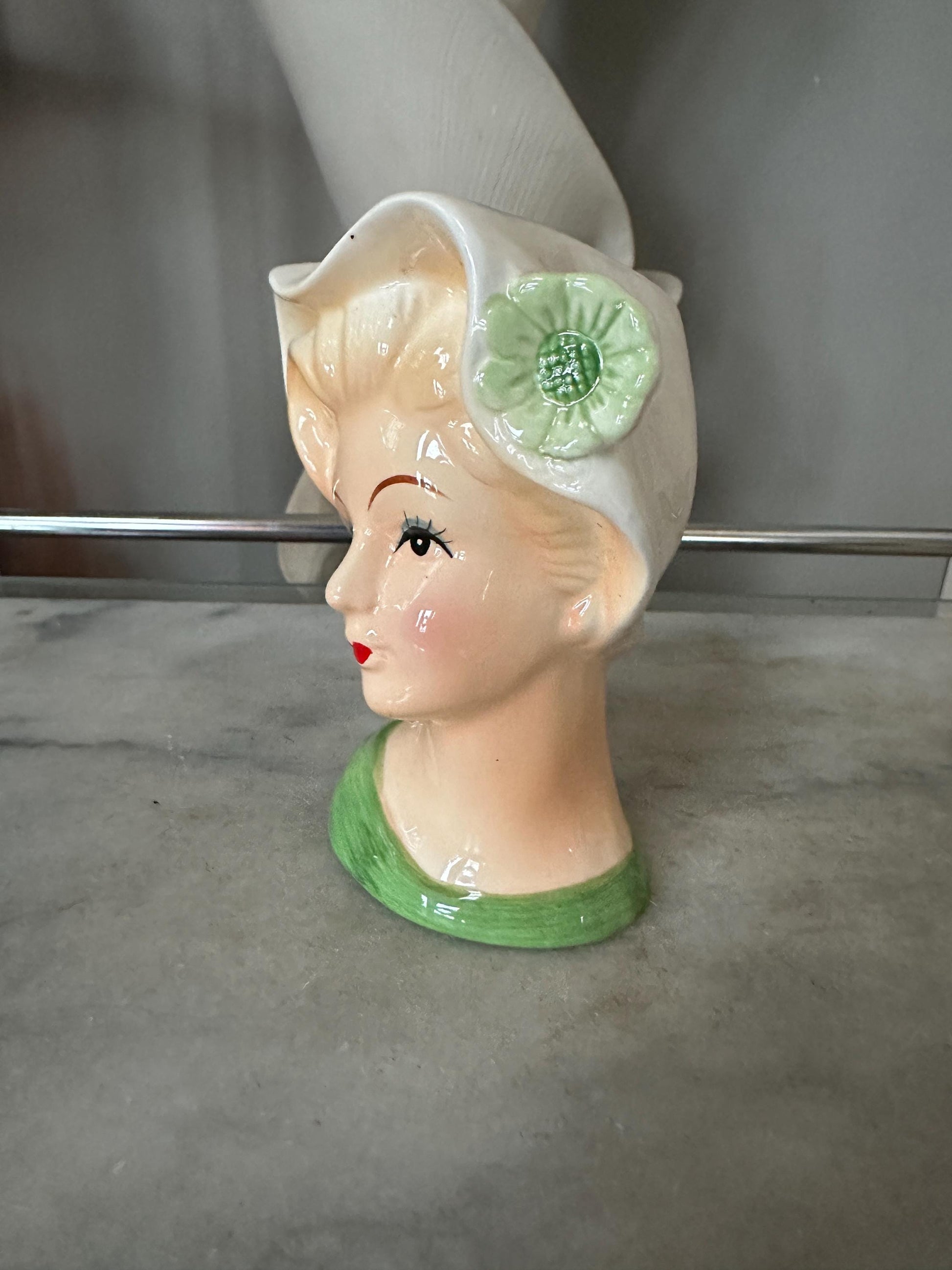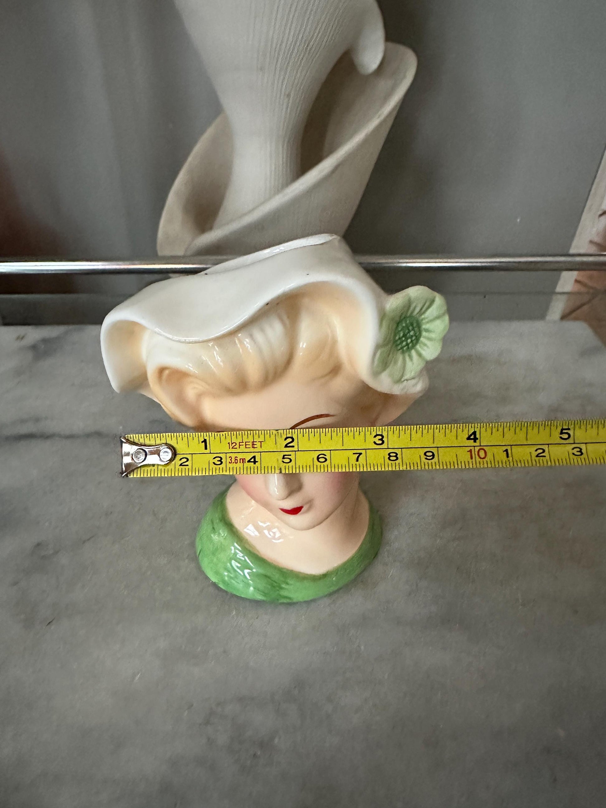 Relpo t961 Brinn’s Head With Green Shawl Head Vase 5.5 In TallWonderfully detailed with blonde hair, brown eyes, red lips, a green flowered hat and green dress. In very good vintage condition with no chips or cracks.Marked on underside A wonderful addition to a collection. Perfect to your Mid Century Modern decor.