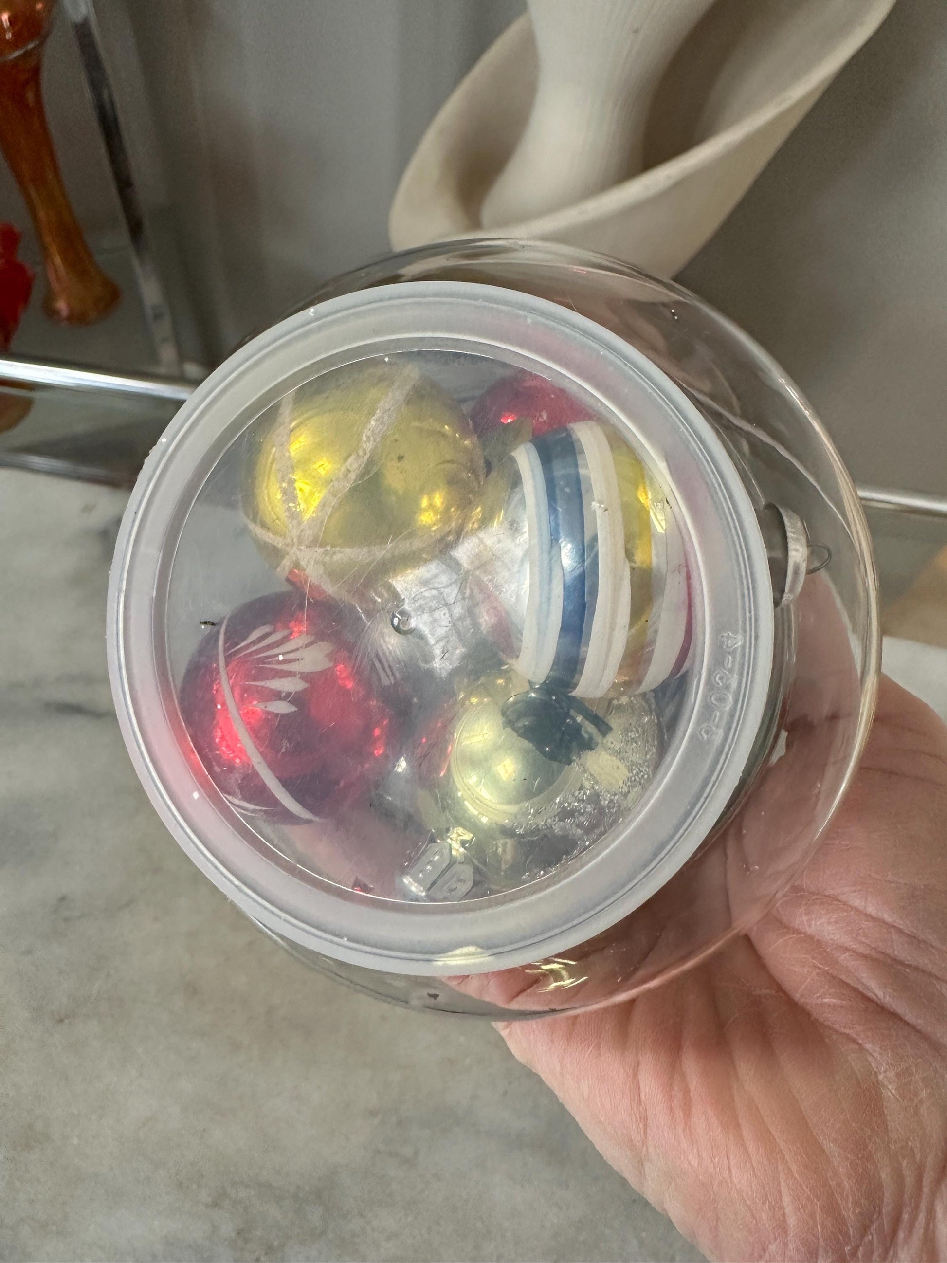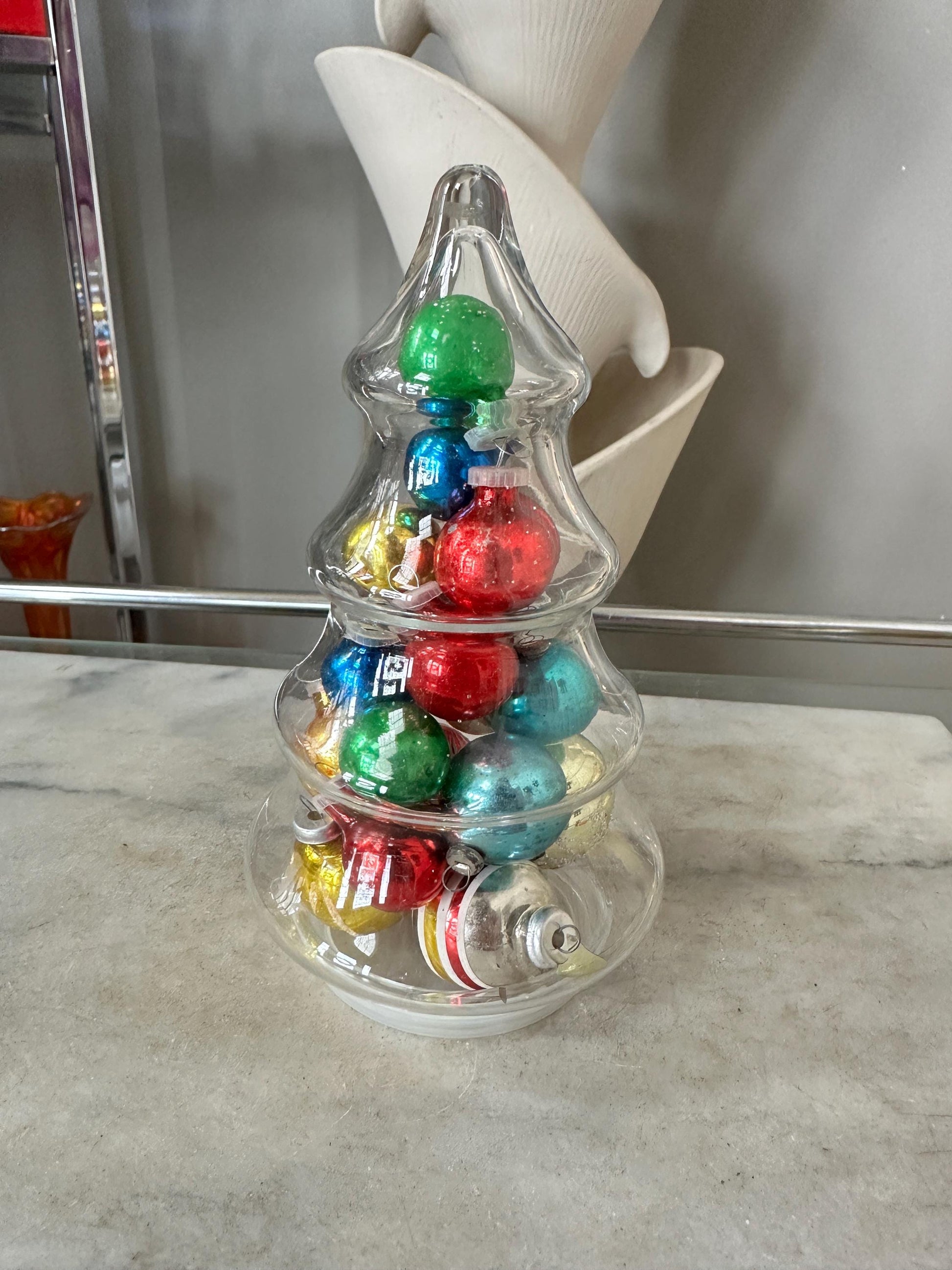 Vintage Small Christmas Tree Jar w Assorted Mini Mercury Glass Ornaments.Jar measures 8” x 4”and has a lid at the bottom. It is holding approximately 18 mini mercury glass ornaments. Jar and ornaments are in good vintage condition. Jar has no chips or cracks. Ornaments show some signs of finish loss but still display well.A wonderful addition to your retro Christmas display.