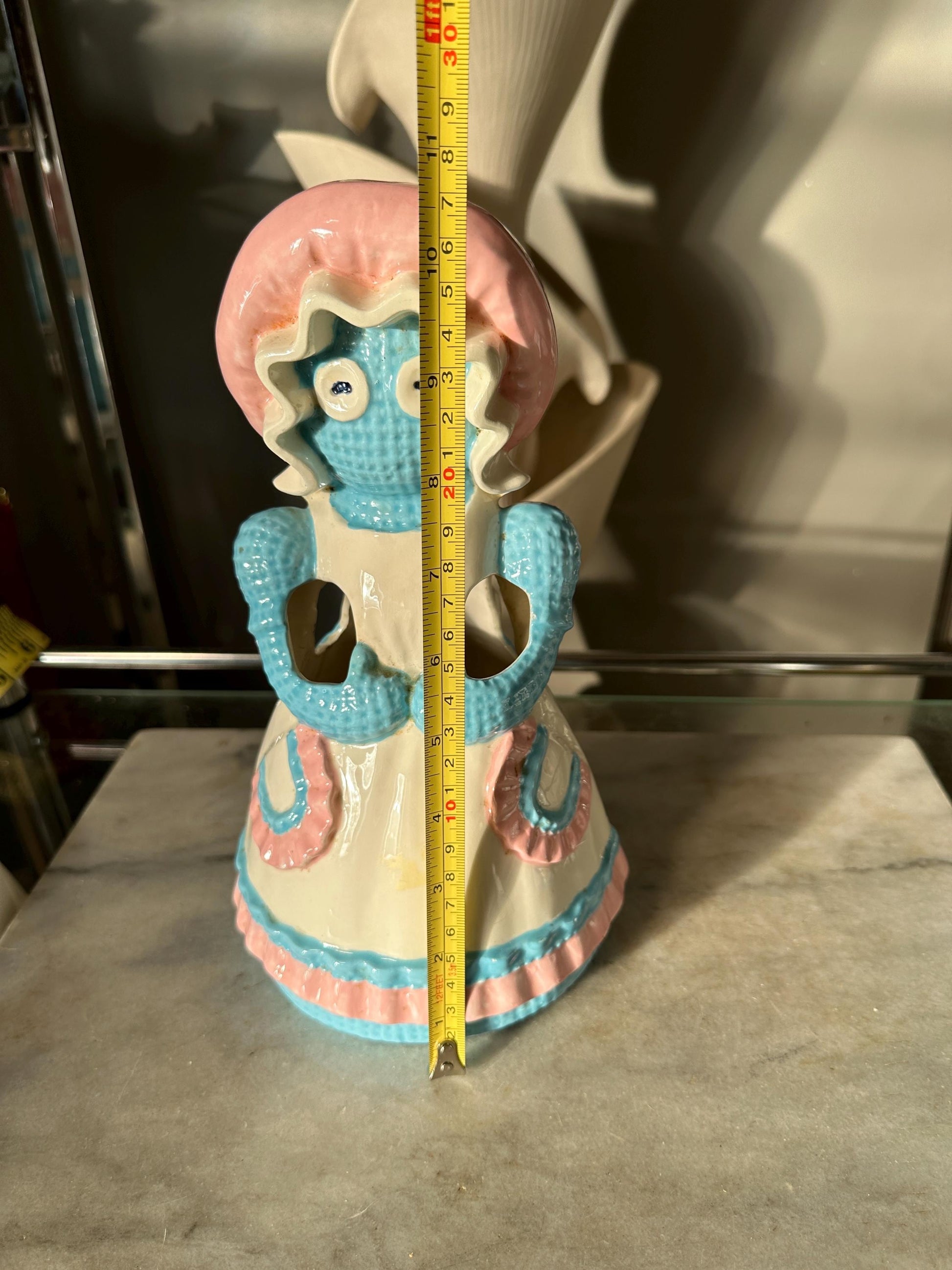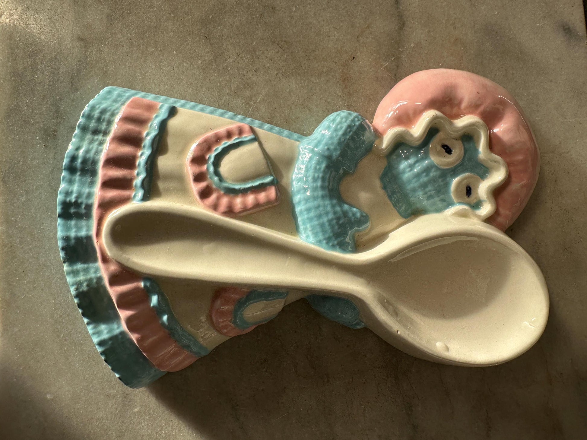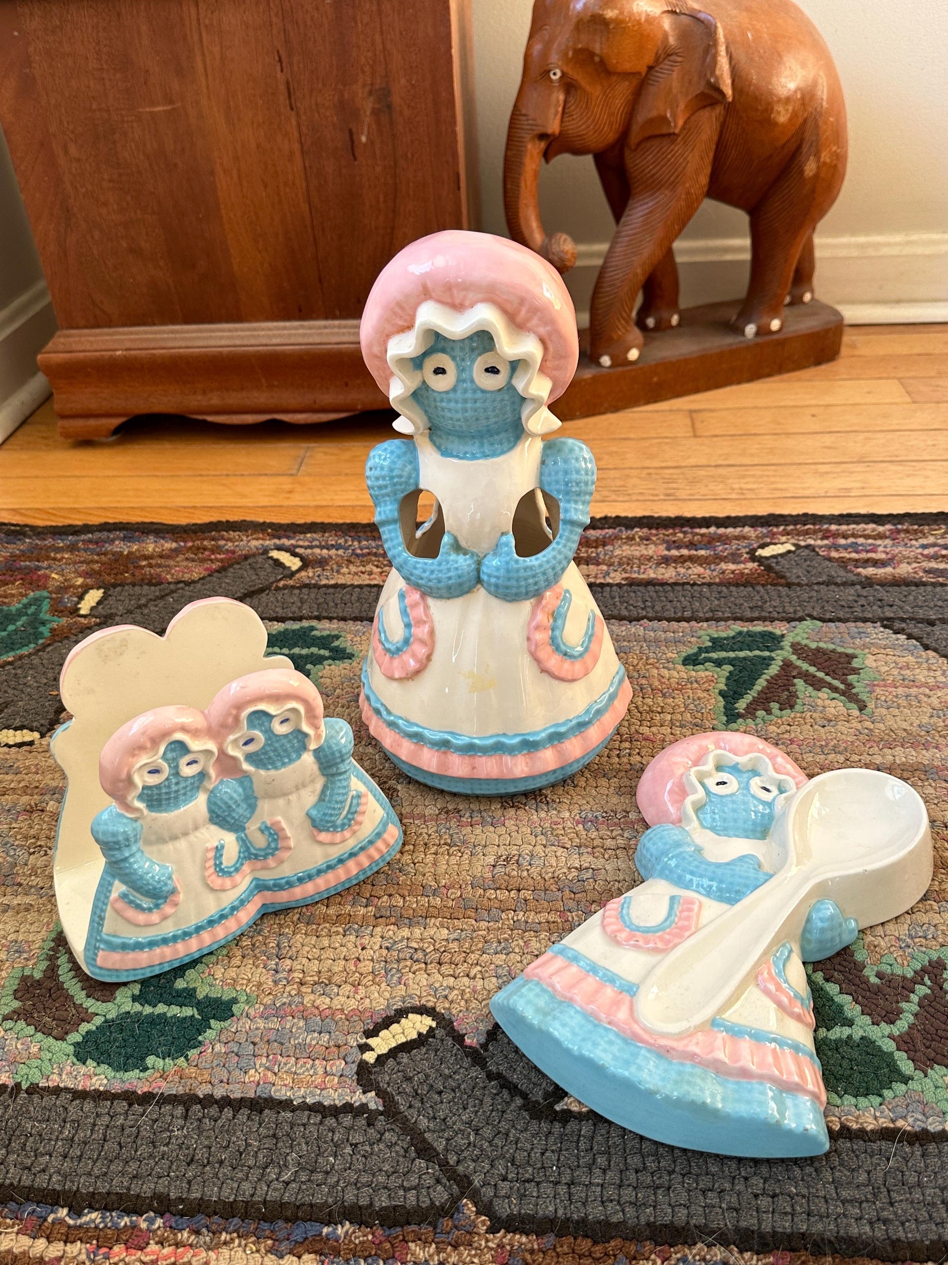 Vintage 1970s Ceramic Rag Doll Four Slot Kitchen Utensil Spoon or Spatula Holder, Napkin Holder and Spoon Rest by Sittre Ceramic USAKitschy and cute ceramic Rag Doll decor from the 1960s by Sittre Ceramic USA.Glazed in blue, pink and white - this set includes a four slot spatula or spoon holder, a napkin holder and a spoon rest.Please see photos for size approximations.Each piece is in good vintage ckndition. No chips or cracks but does have some signs of age related wear to the finish.A whimsical addition to your retro kitchen.