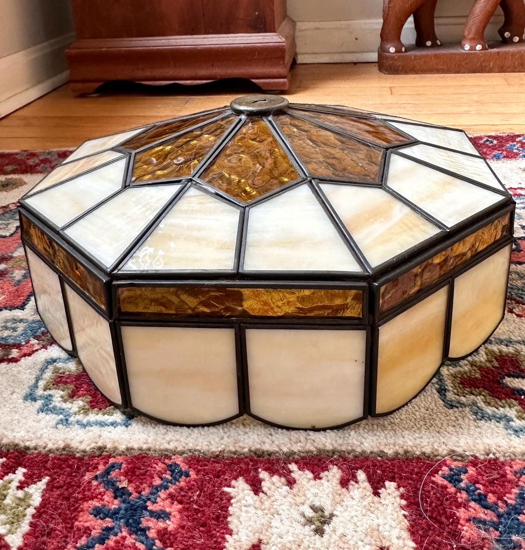 Vintage 1970s Tiffany Style Stained Glass Lamp Shade | Amber & Cream Slag Glass | Geometric Leaded Shade | Replacement Lamp Shade