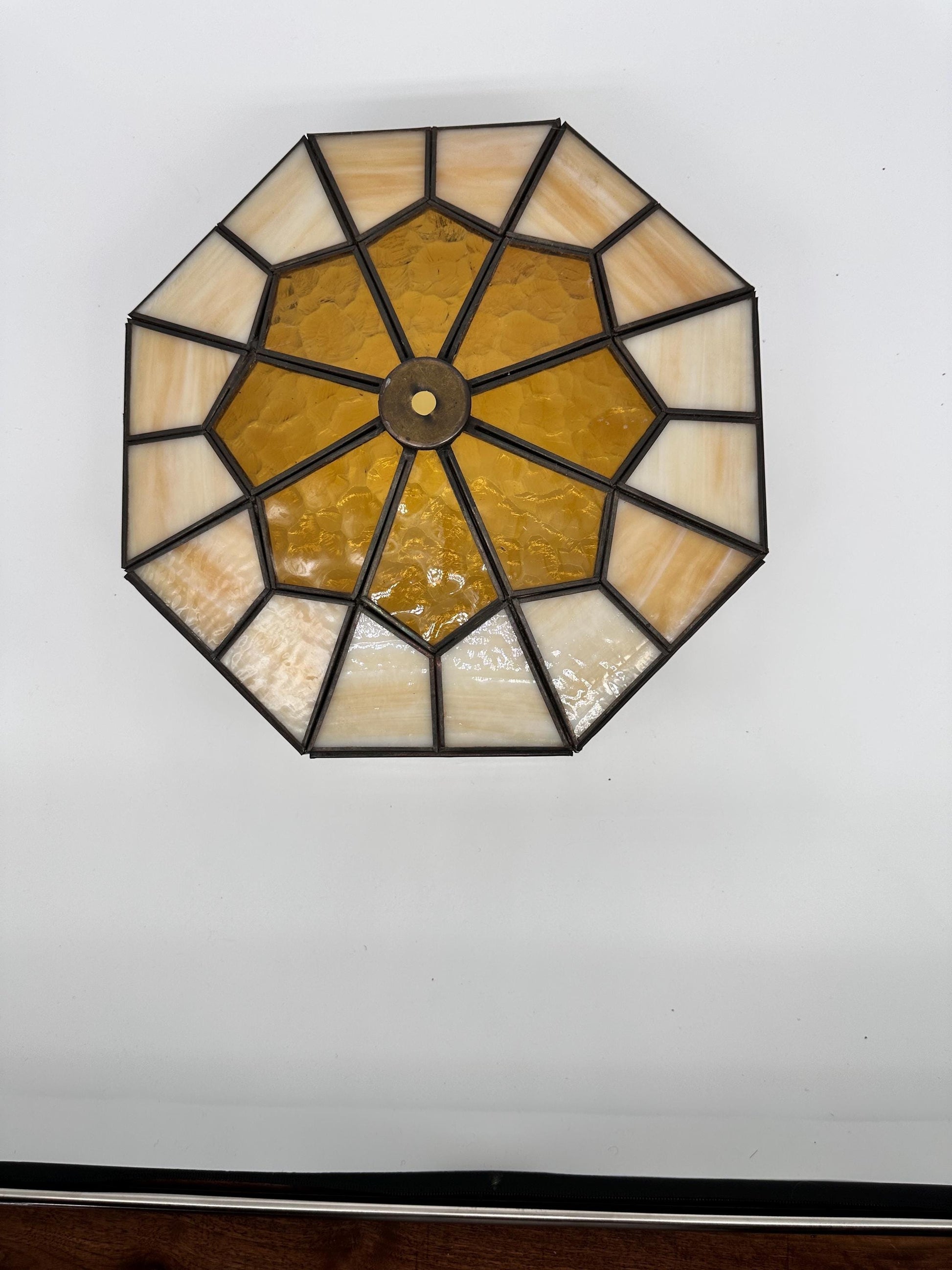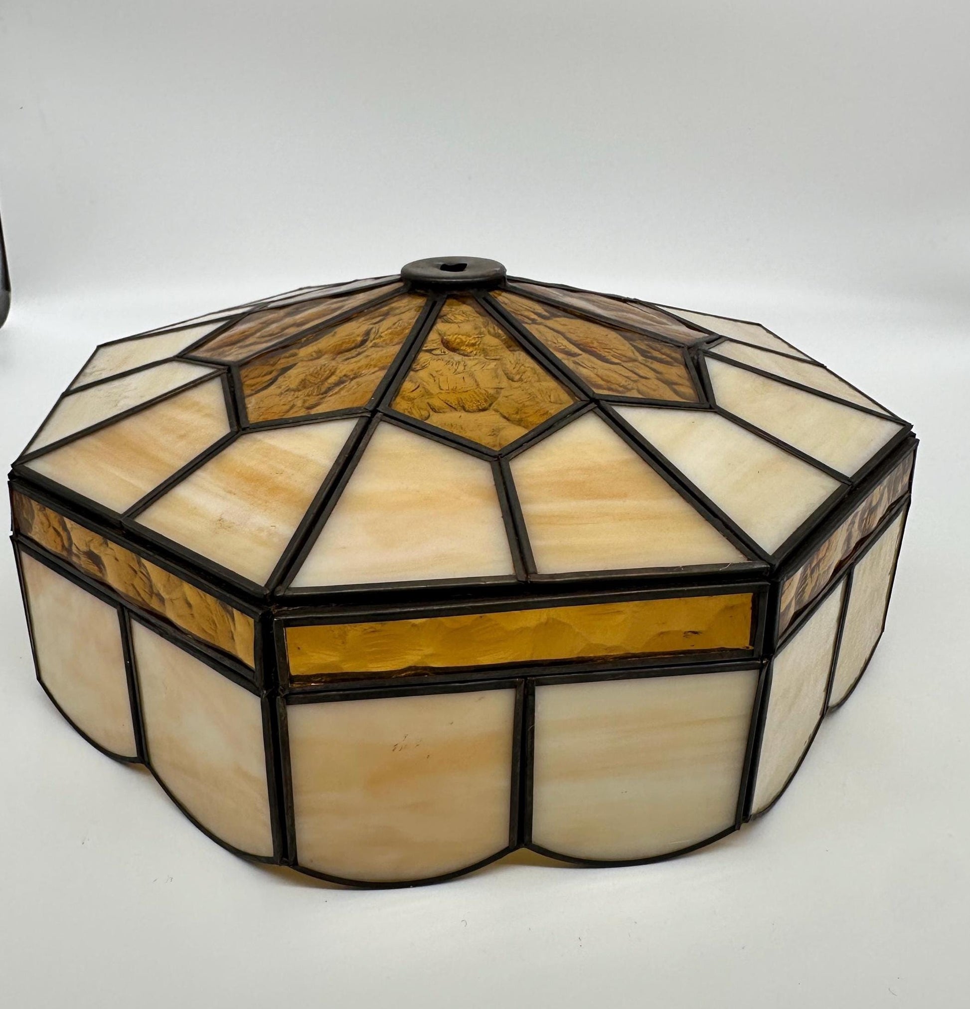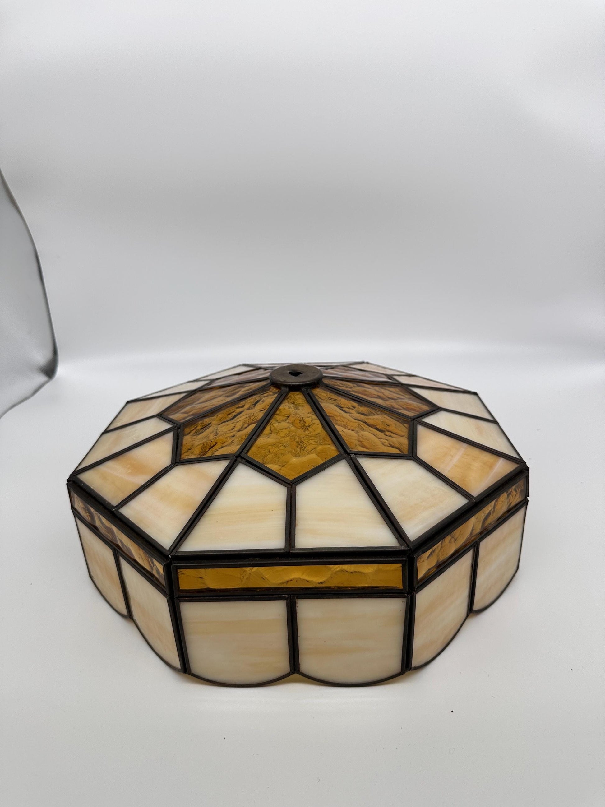 Beautiful vintage 1970s Tiffany-style stained glass lamp shade featuring a warm blend of amber and cream slag glass panels arranged in a classic geometric pattern. The leaded glass construction creates a lovely glow when illuminated, giving the shade a cozy vintage ambiance perfect for a table lamp, accent lamp, or vintage décor display.This shade has a domed, faceted design with textured amber glass accents that add depth and character. The creamy panels have a subtle marbled look that mimics traditional slag glass often seen in Tiffany-inspired lighting from the mid-century era.A great replacement shade for a vintage lamp base or a beautiful piece for collectors of stained glass lighting.Details: