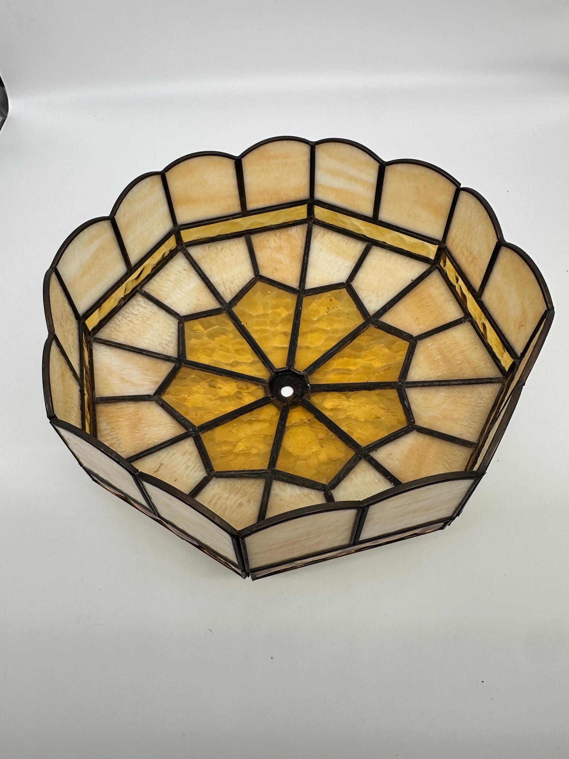 • Style: Tiffany style / stained glass • Era: Circa 1970s • Materials: Leaded glass panels with metal framework • Colors: Cream / ivory with amber accents • Shape: Domed geometric shade • Mounting: Center hole with metal cap (spider fitter style)Approximate Size: • Diameter: 13 inches (estimate based on photo) • Height: 6inchesCondition: Good vintage condition with normal age-related wear. The glass panels appear intact and the lead framework is solid. Light patina on the metal adds vintage character. Please review photos for details and overall condition.Perfect For: • Vintage or retro lamp restoration • Mid-century or cottage décor • Tiffany-style lighting collectors • Warm ambient lighting in a living room, bedroom, or reading nook