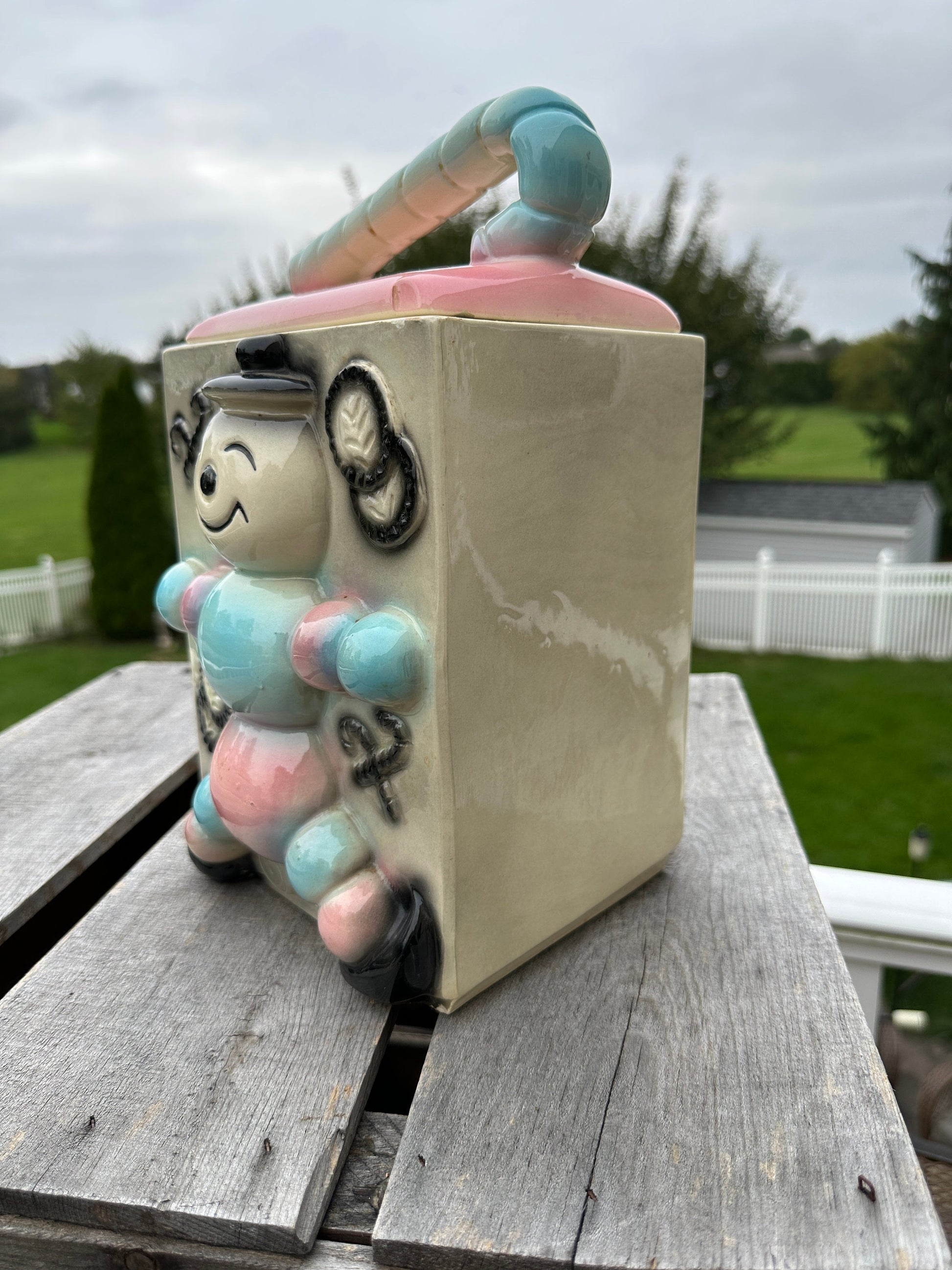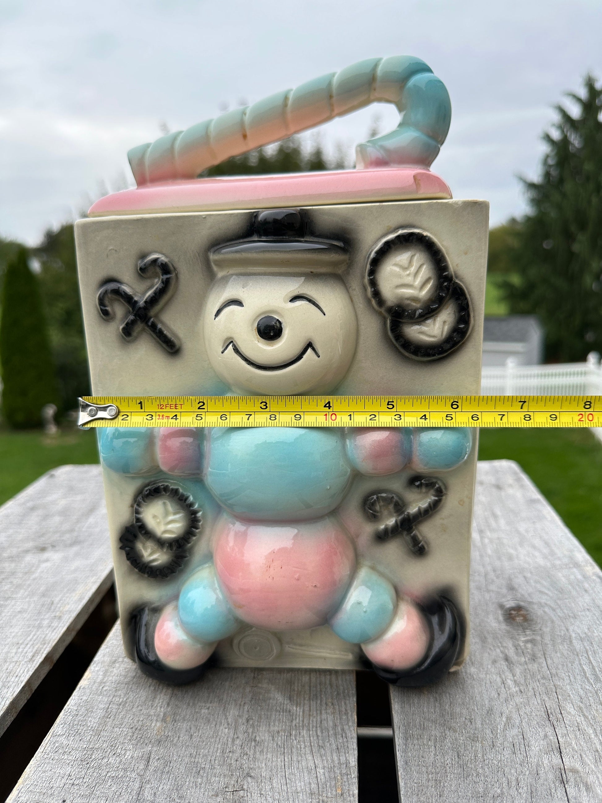 Vintage American Bisque Candy Cane Baby Cookie Jar Blue Pink Gray BlackThis adorable American Bisque Cookie Jar features a Blue Candy Cane as the lid's handle and the front of the jar is adorned with a 3D figuring that resembles a snowman in Blue w/Pink Gray & Black Made in the USAPlease see photos for size approximations.Pre owned very good vintage condition, small imperfections consistent with a piece of this age, no major flaws, see all pictures for views. There are some manufacturing defects on the lid as well as some slight crazing here and there.A wonderful addition to a USA Pottery to Cookie Jar collection. Perfect to display with your kitschy Christmas display.
