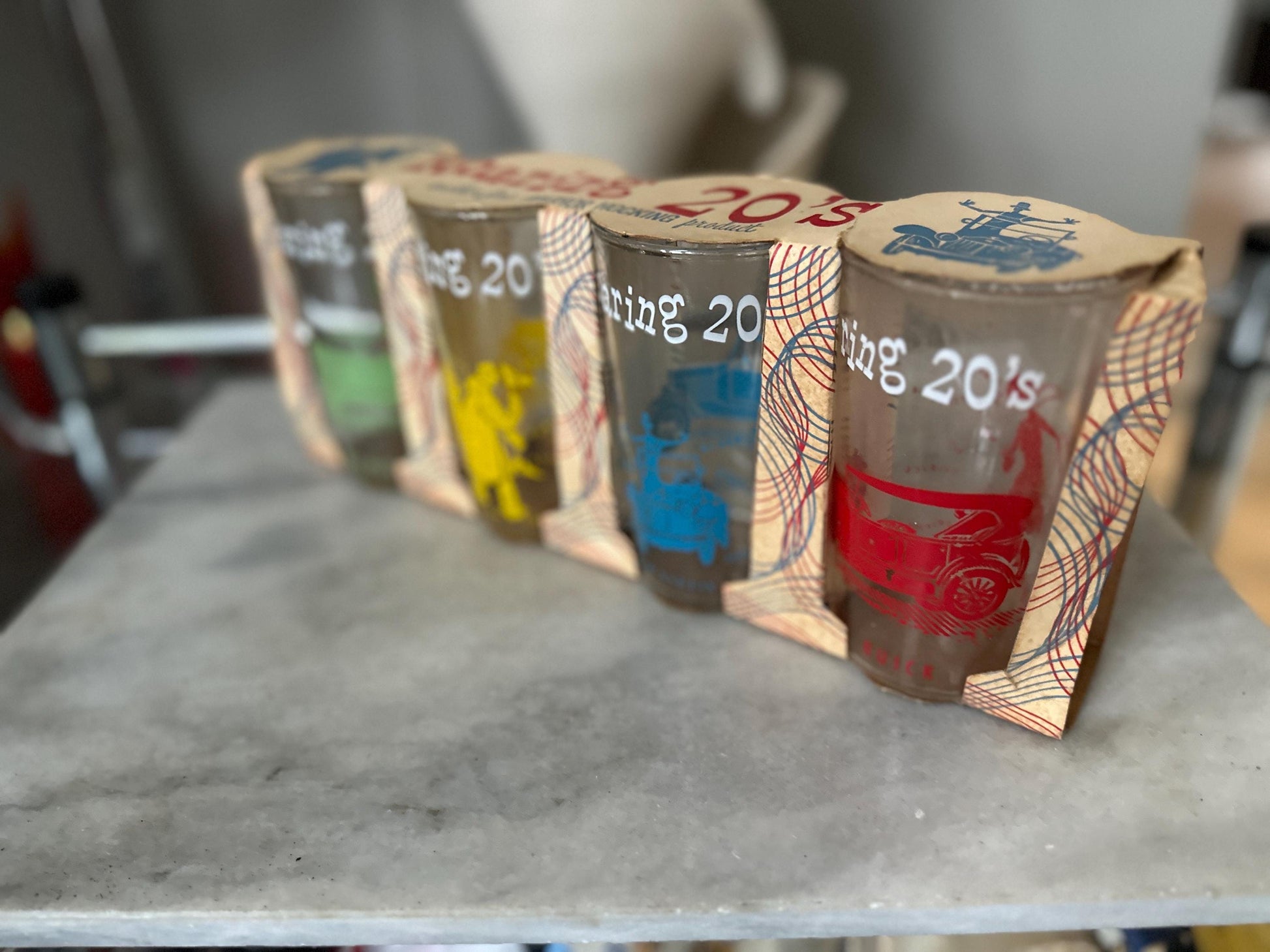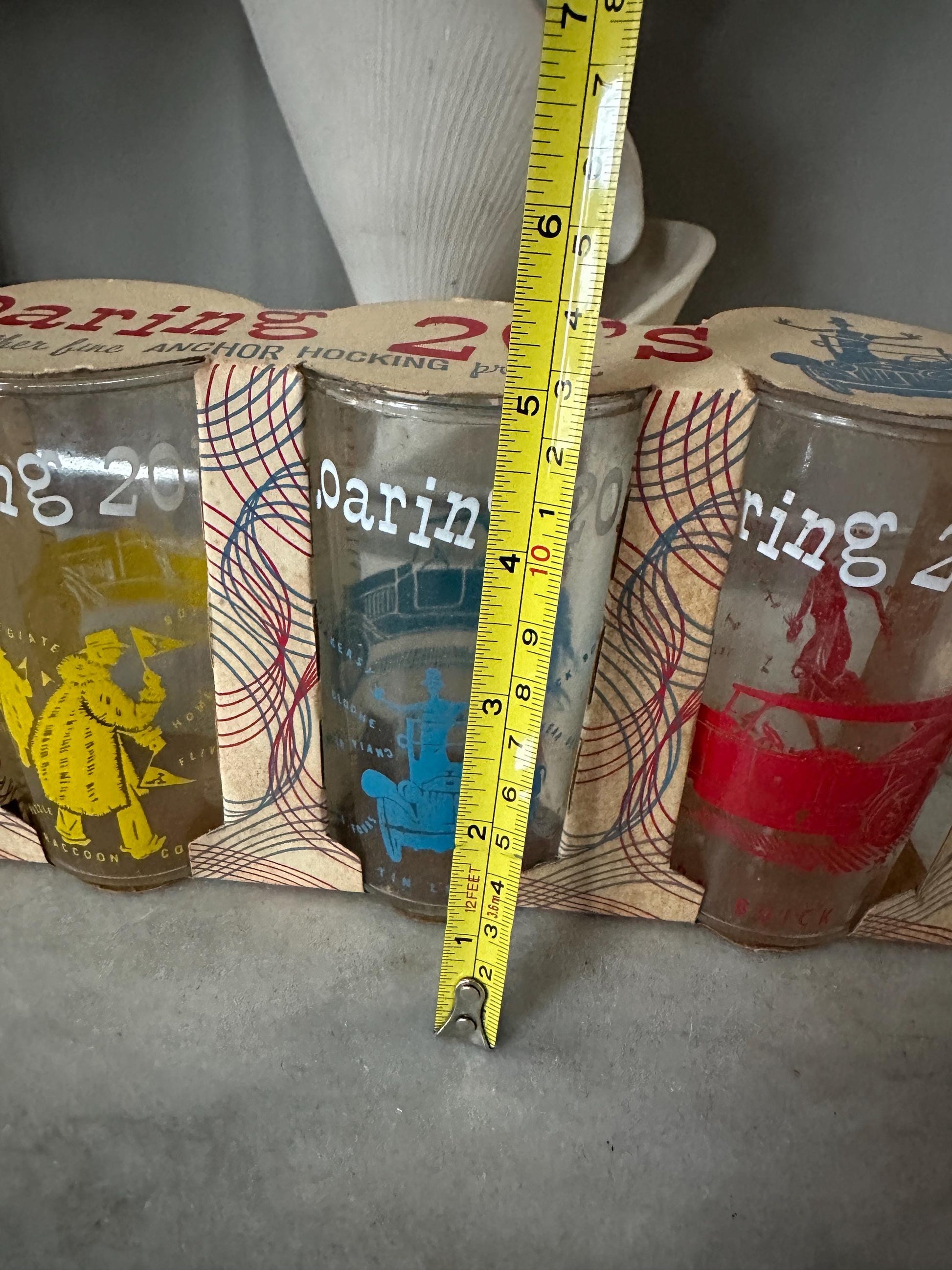 New Old Stock! In Original Packaging.A set of four vintage Anchor Hocking Roaring 20s Tumblers from the 1960s.Each features a vintage scene or car from the 1920s (Please see photos for details.)Colors are vibrant. Please see photos for size approximations.In very good - unused condition.the original packaging does show signs of wear. A wonderful addition to your retro kitchen or swanky swigs collection.