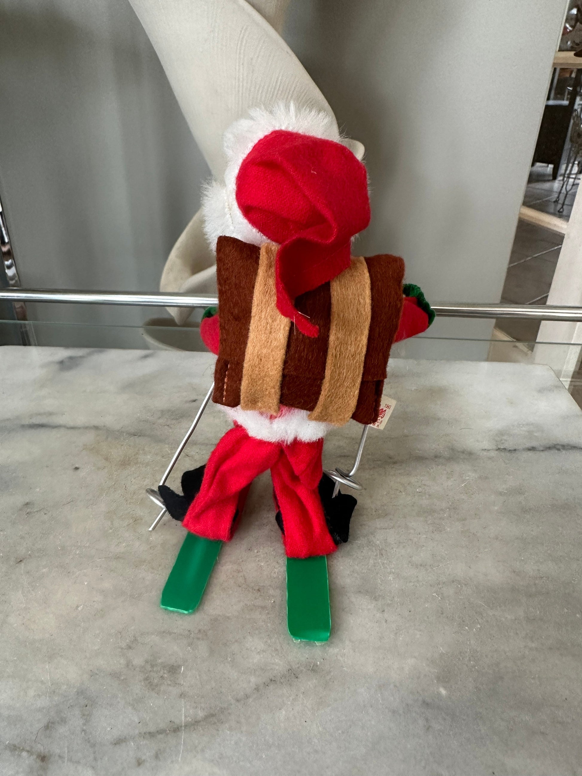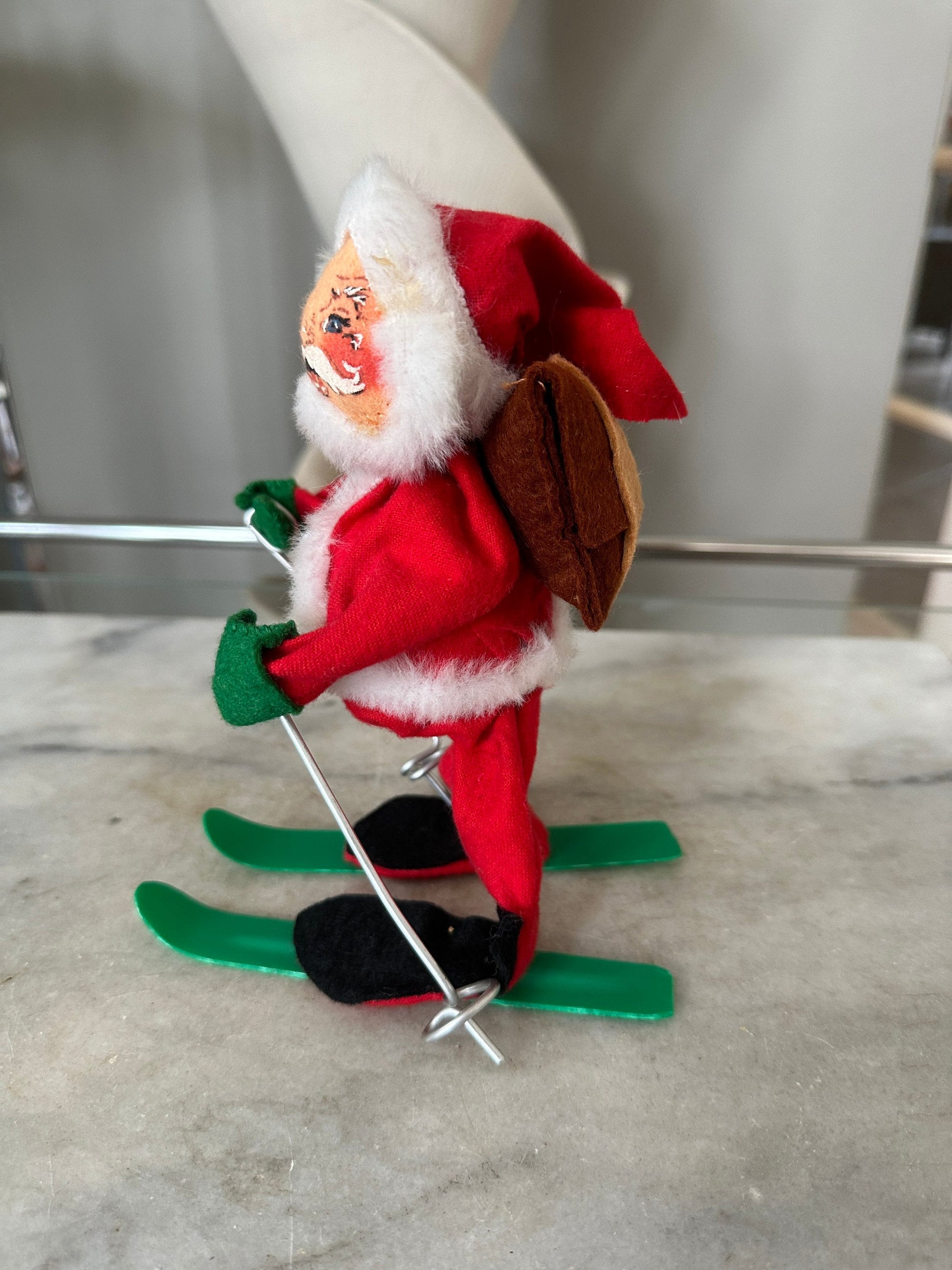 Santa Claus is about 9 inches tall and dressed in his red suit and hat On green plastic skis with silver ski poles in each hand and wearing a backpack Legs and arms have bendable wires for posing Good condition, light age wear.A wonderful addition to an Annalee collection. Perfect for you vintage Christmas decor.Annalee dolls where created by Annalee Thorndike when she started making dolls back in the 1930s. The are all made in Meredith, New Hampshire and each doll is full of character and whimsy. Each doll is also pliable and can be shaped into different positions to create your perfect decor look.