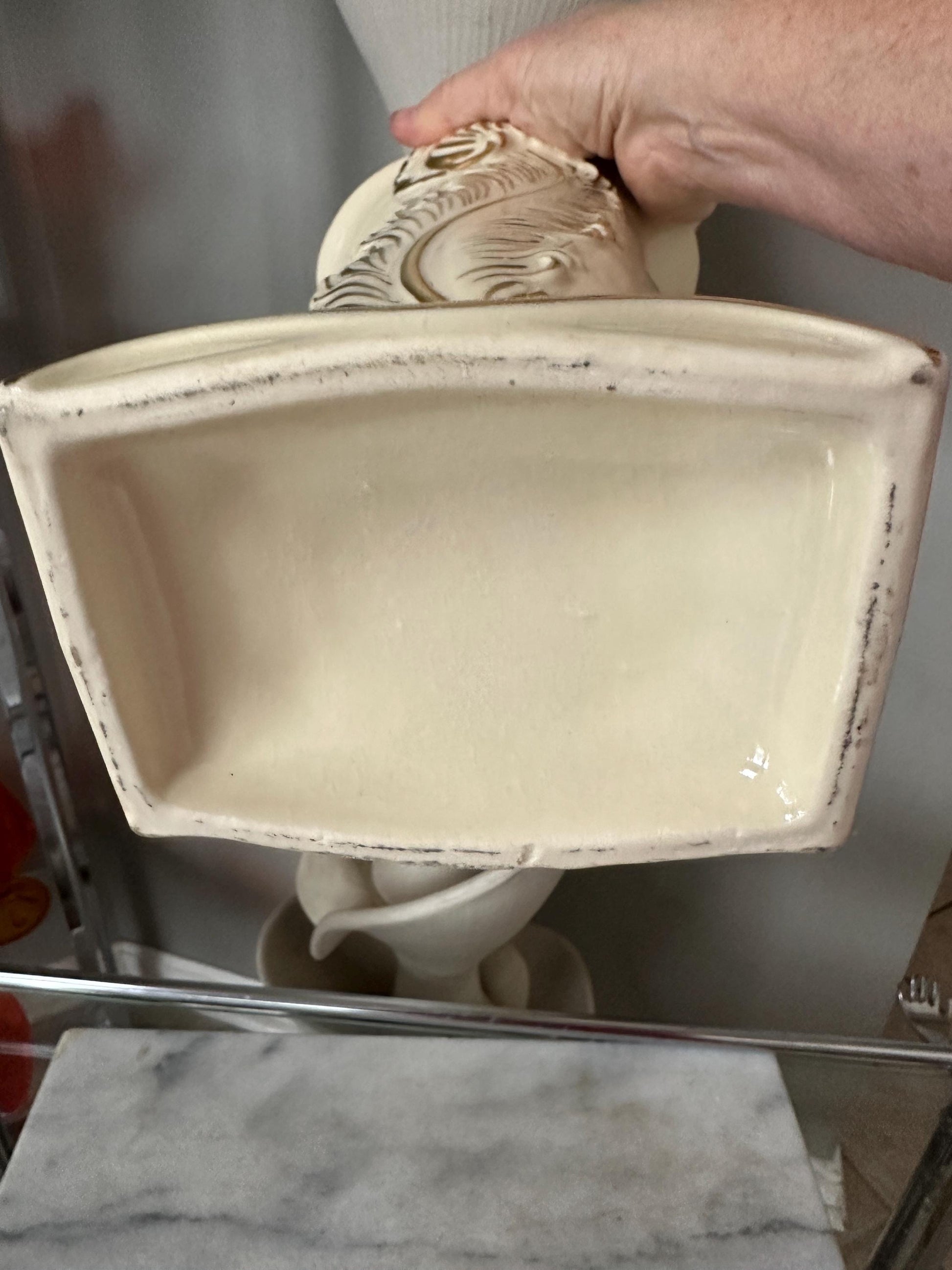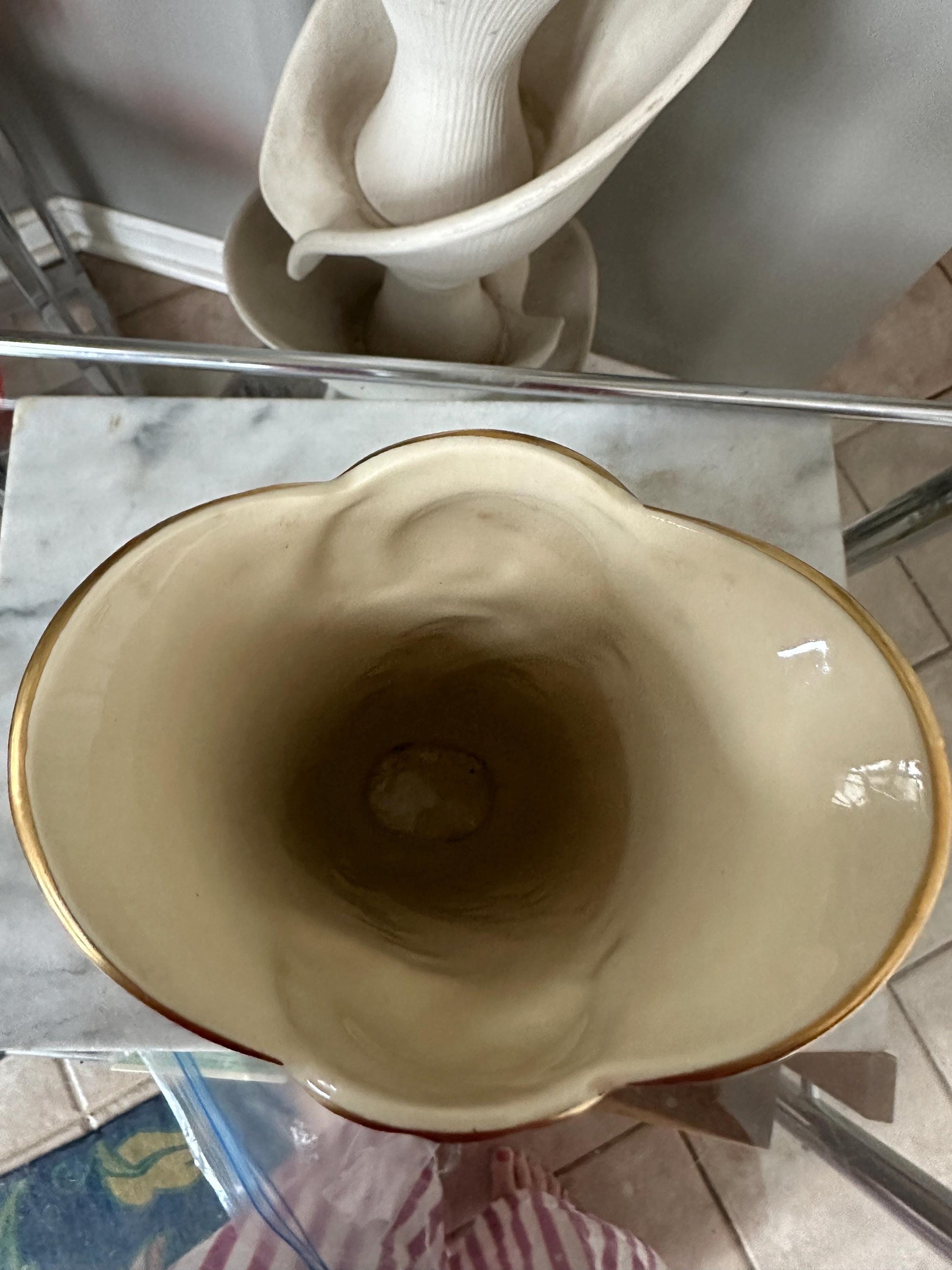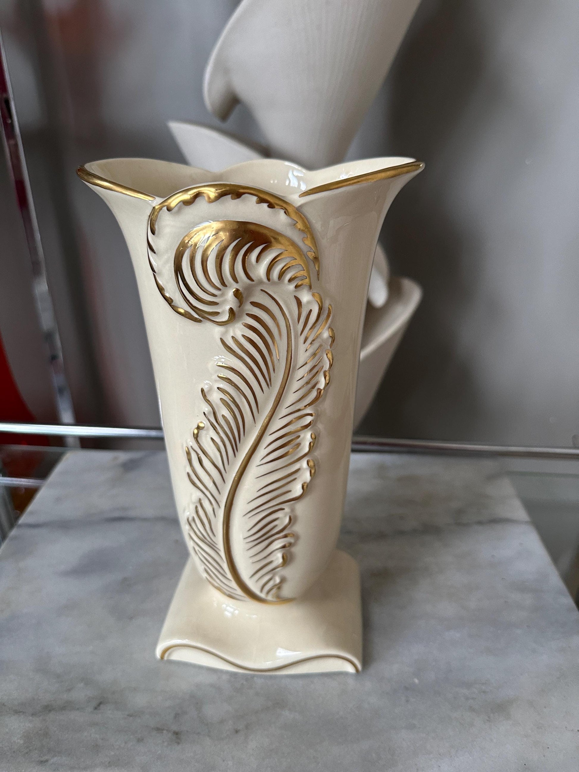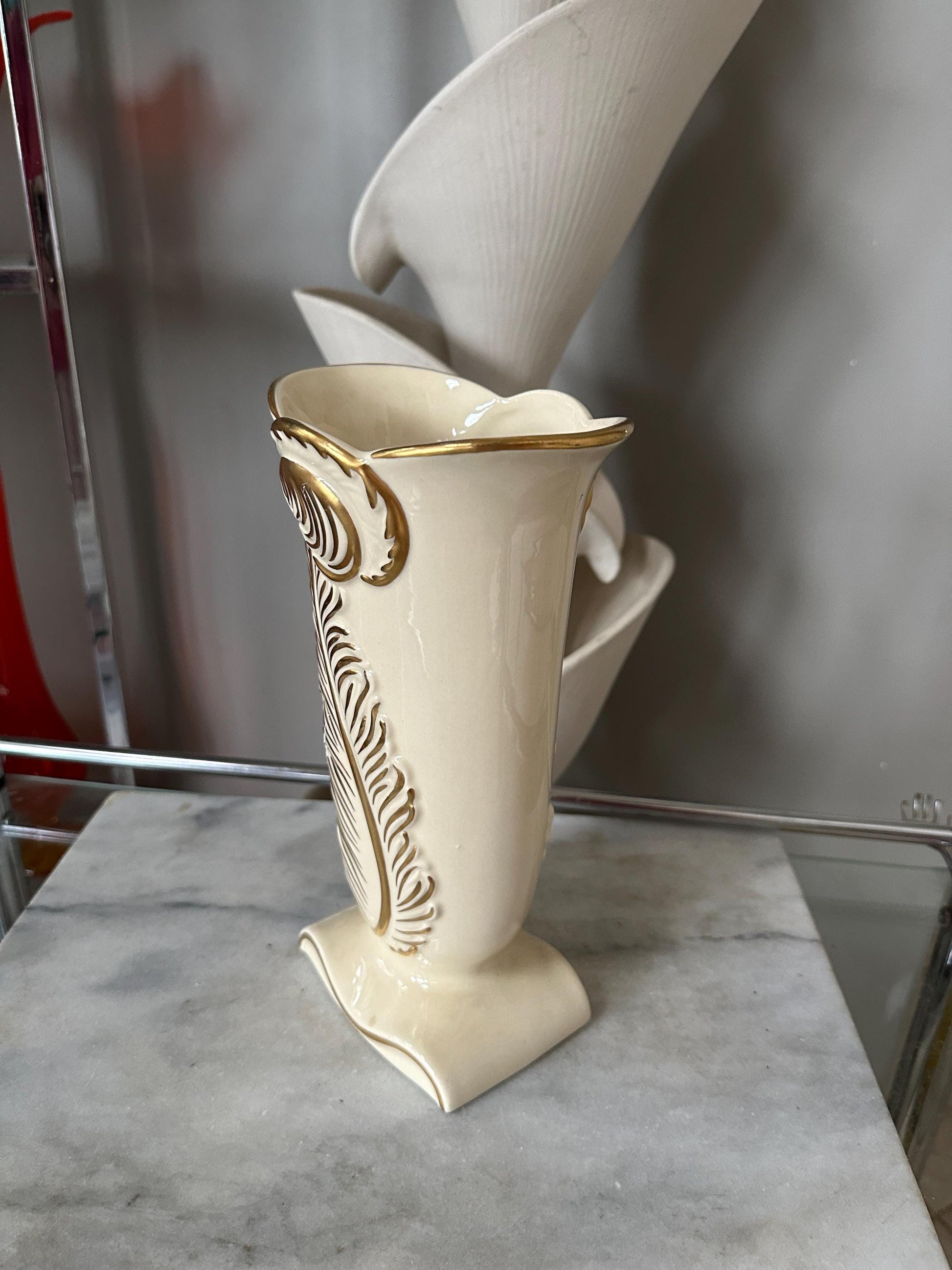 Vintage Art Deco Chadwick Pottery Vase 1940s Gold And Ivory Feather Plume 9”