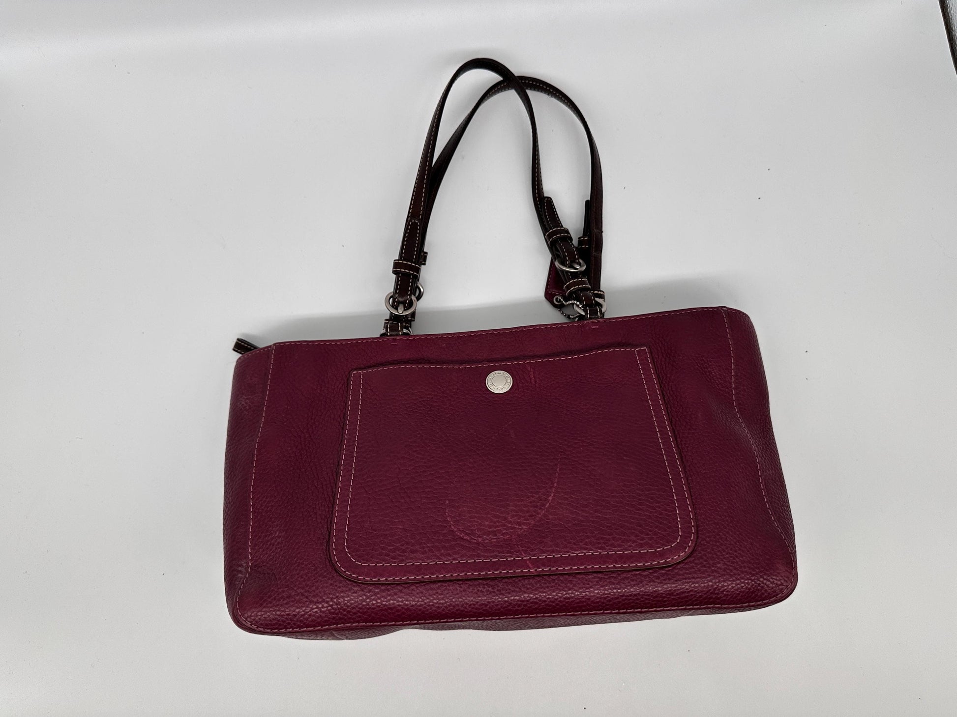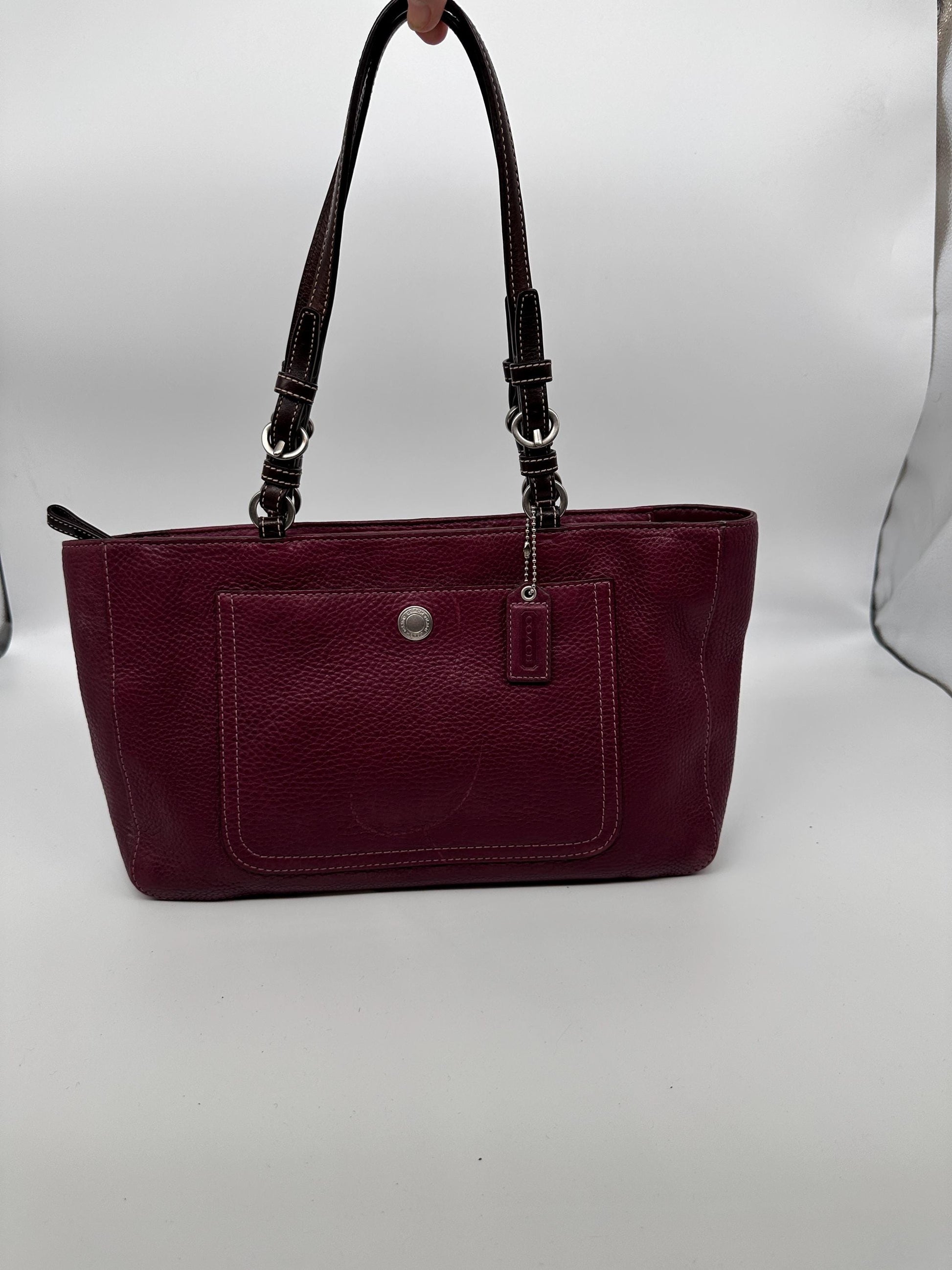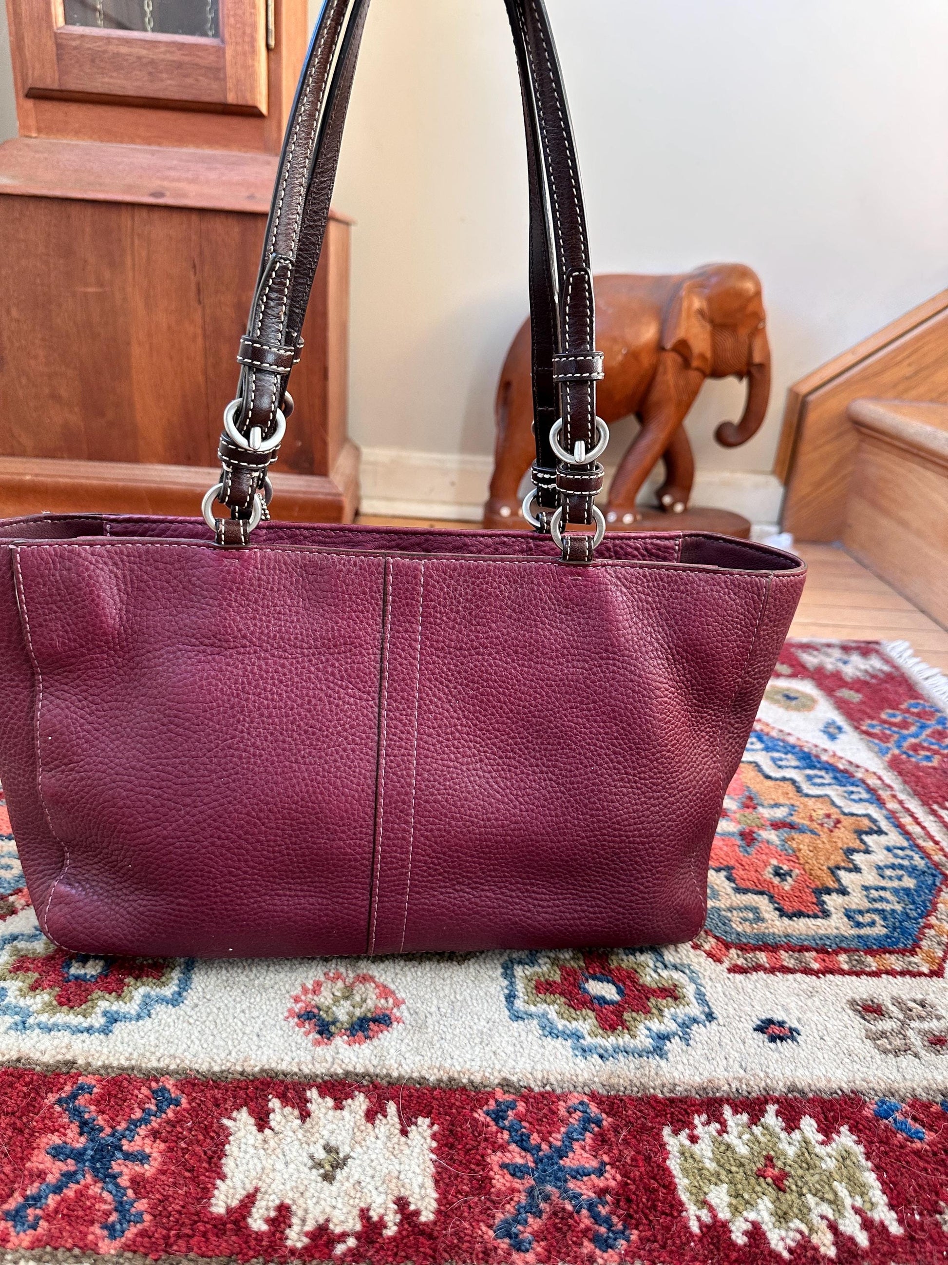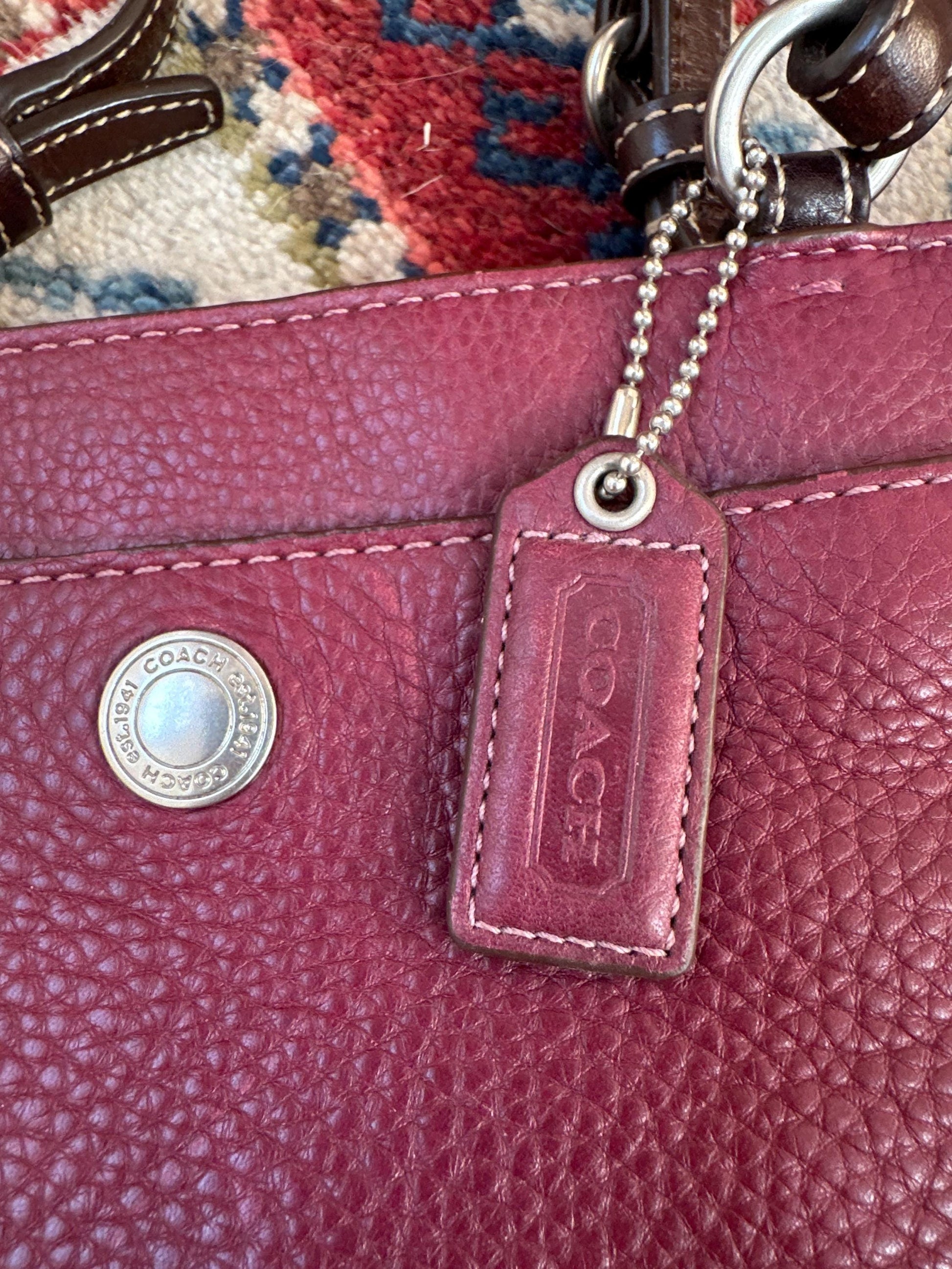 Beautiful vintage Chelsea top handle handbag crafted in rich burgundy pebbled leather. This classic structured purse features a timeless silhouette with a sturdy top handle, making it perfect for both everyday wear and vintage-inspired styling.The deep burgundy color pairs easily with fall and winter wardrobes, while the pebbled leather gives the bag durability and elegant texture. Its structured shape keeps its form beautifully and offers a polished, sophisticated look.A wonderful piece for vintage handbag collectors or anyone who loves classic leather accessories.Details: